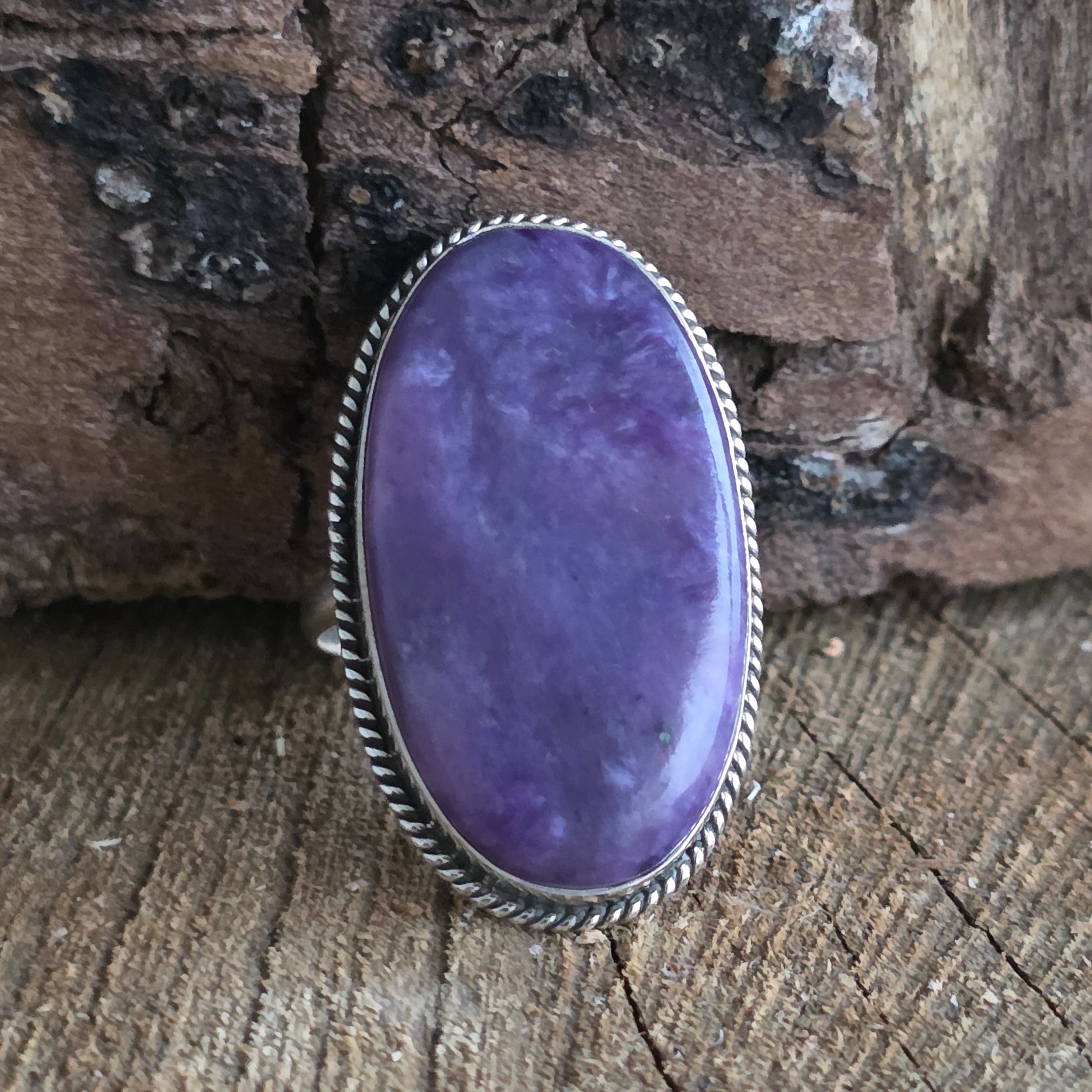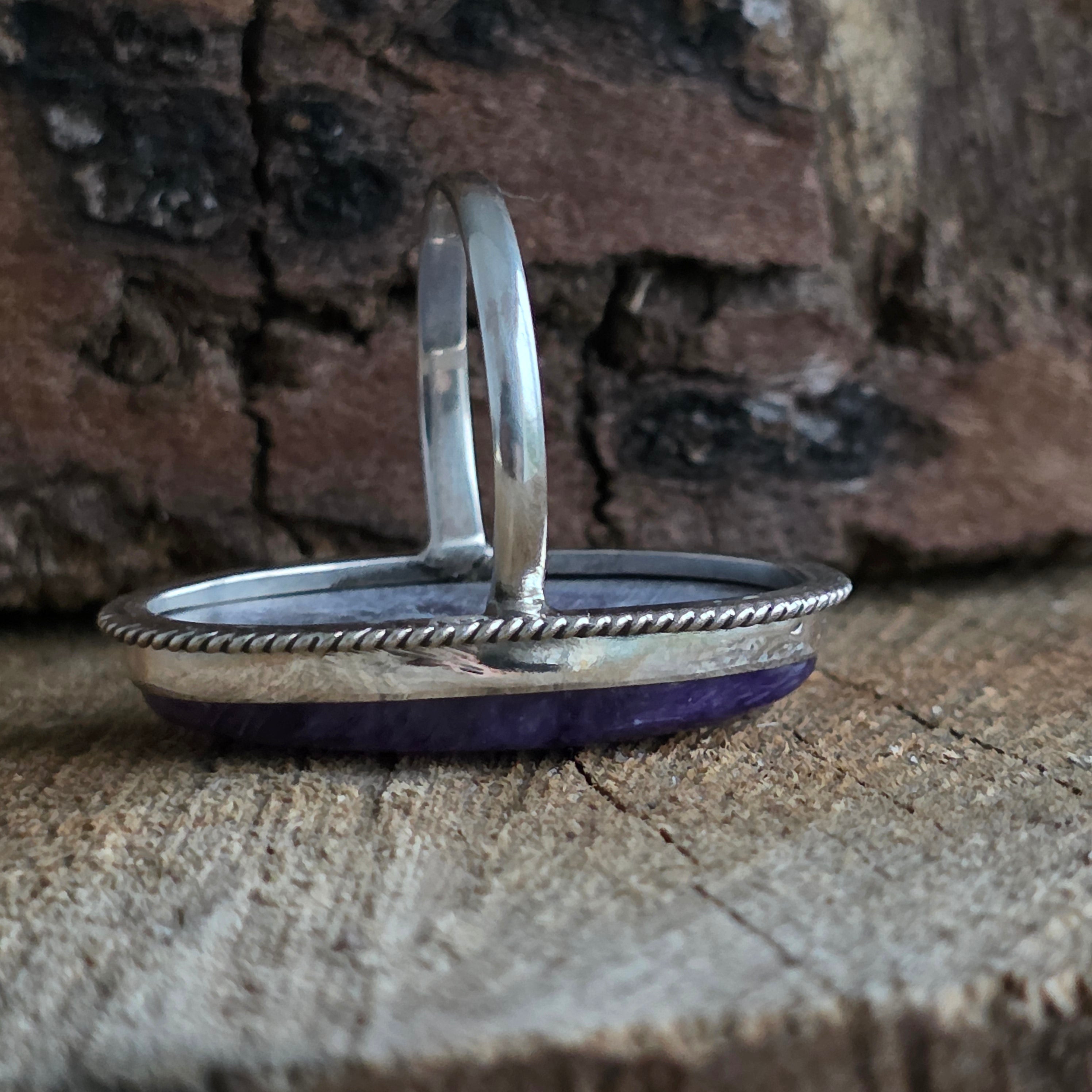 Un inel masiv, lucrat manual din argint 925, ce adăpostește o piatră naturală de Charoit, cu nuanțe vibrante de violet și reflexe mătăsoase ce amintesc de o pictură cosmică. Rama decorativă în stil twisted wire work adaugă profunzime și rafinament, echilibrând eleganța modernă cu măiestria tradițională.