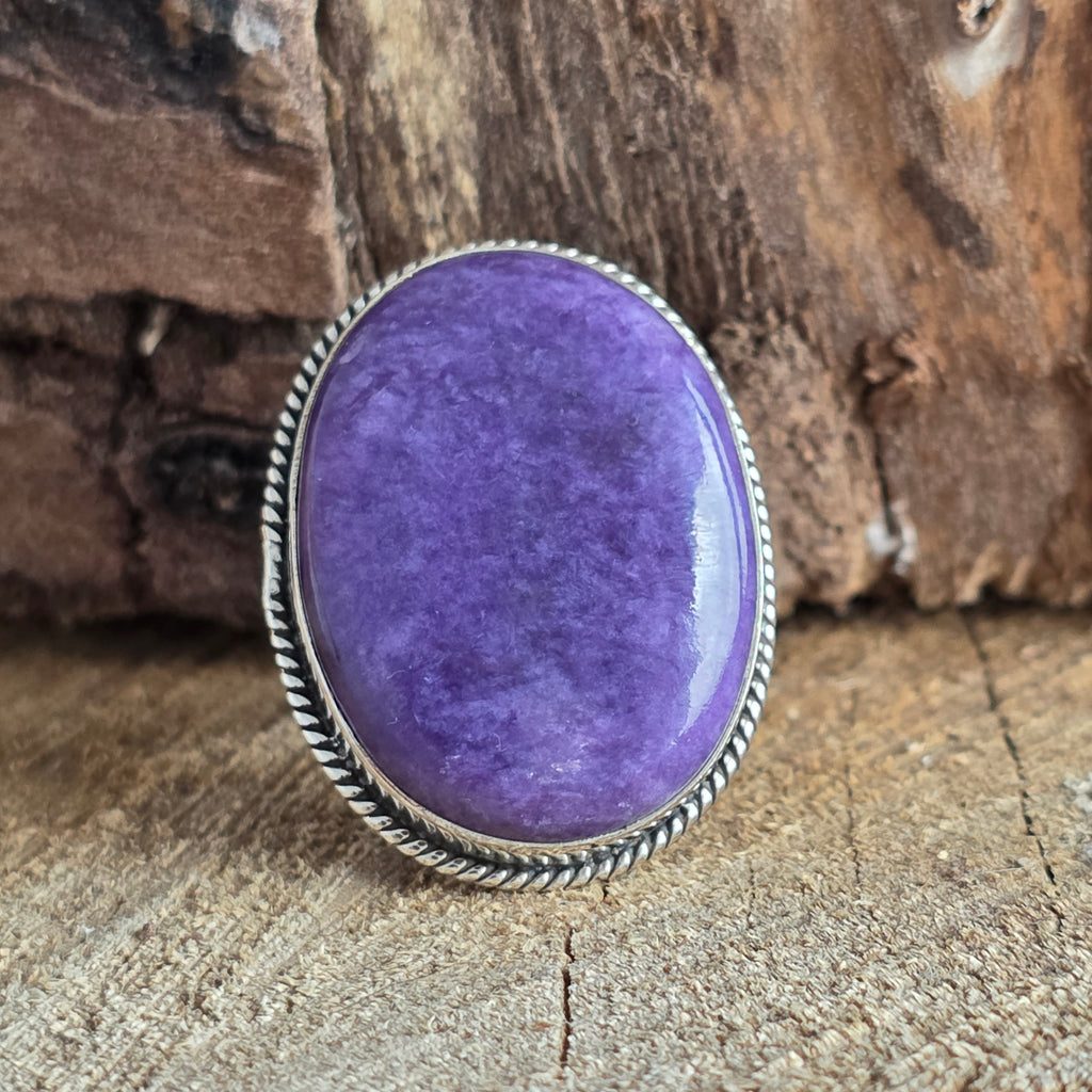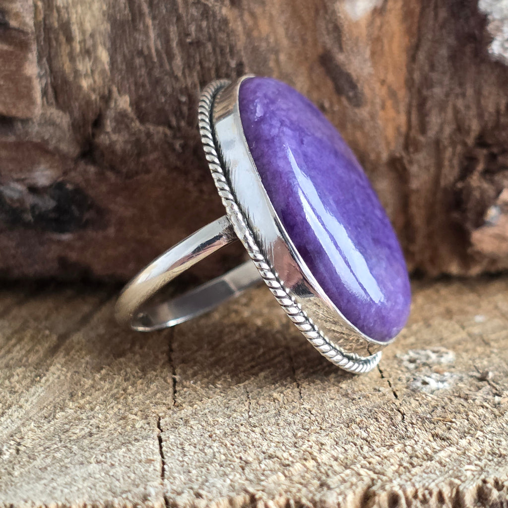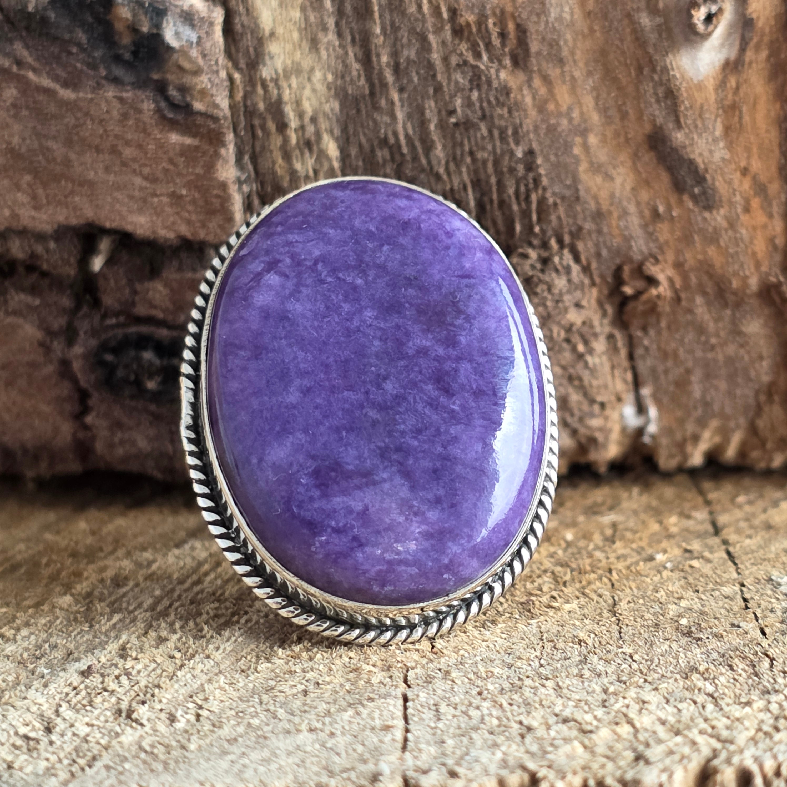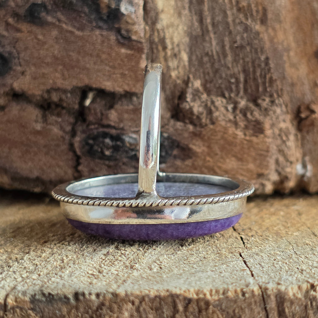 Un inel masiv, lucrat manual din argint 925, ce adăpostește o piatră naturală de Charoit, cu nuanțe vibrante de violet și reflexe mătăsoase ce amintesc de o pictură cosmică. Rama decorativă în stil twisted wire work adaugă profunzime și rafinament, echilibrând eleganța modernă cu măiestria tradițională.