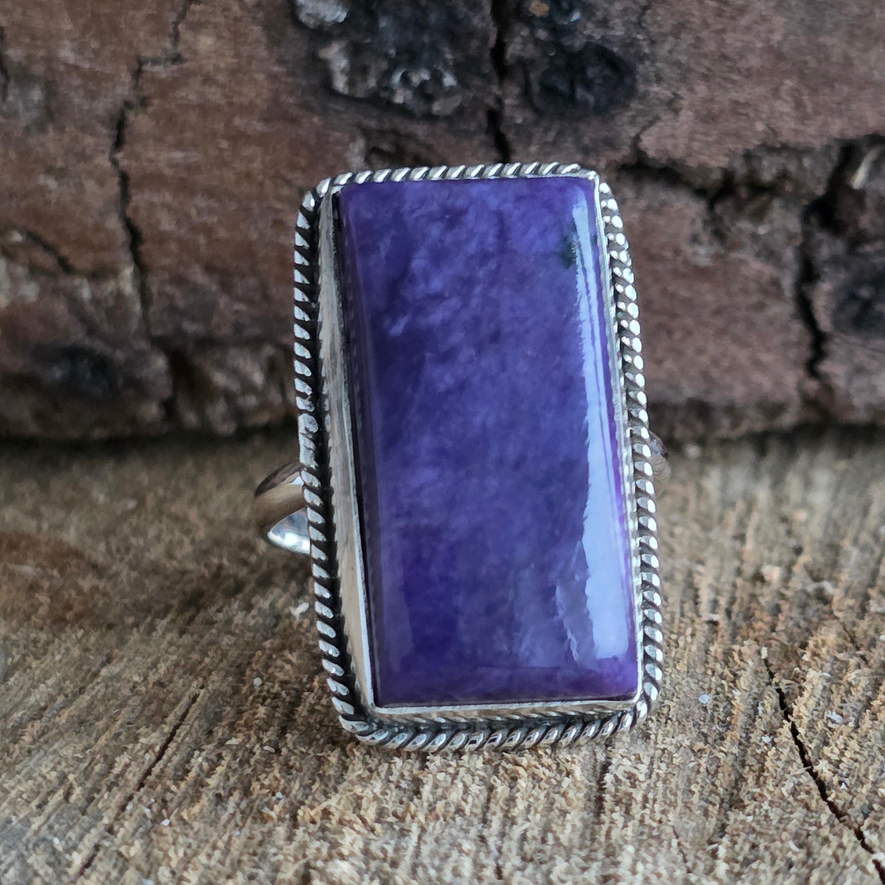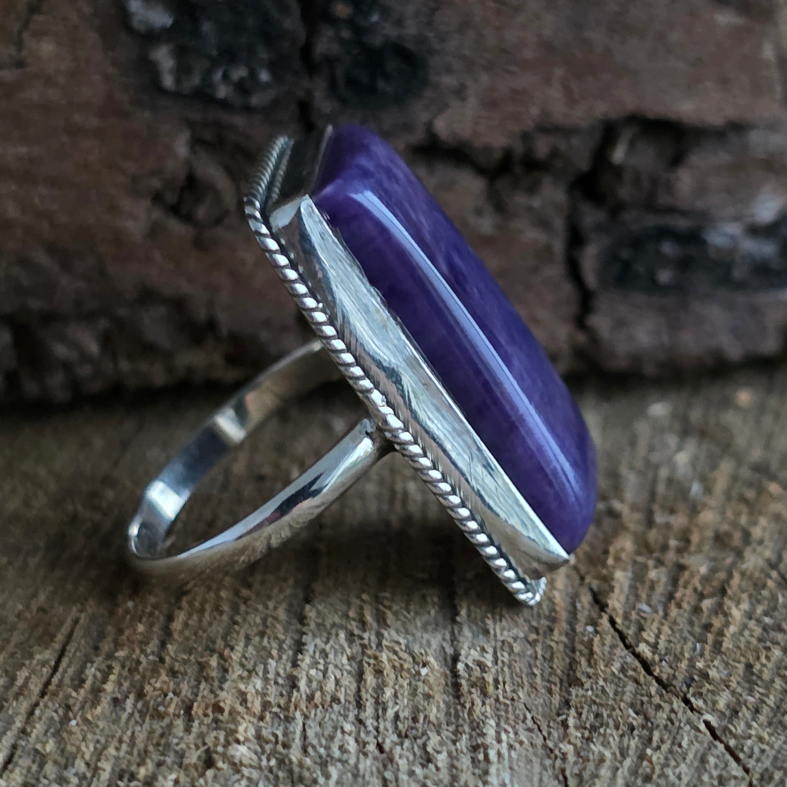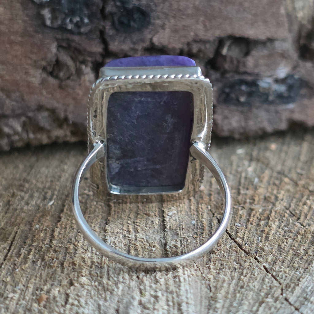 Un inel masiv, lucrat manual din argint 925, ce adăpostește o piatră naturală de Charoit, cu nuanțe vibrante de violet și reflexe mătăsoase ce amintesc de o pictură cosmică. Rama decorativă în stil twisted wire work adaugă profunzime și rafinament, echilibrând eleganța modernă cu măiestria tradițională.