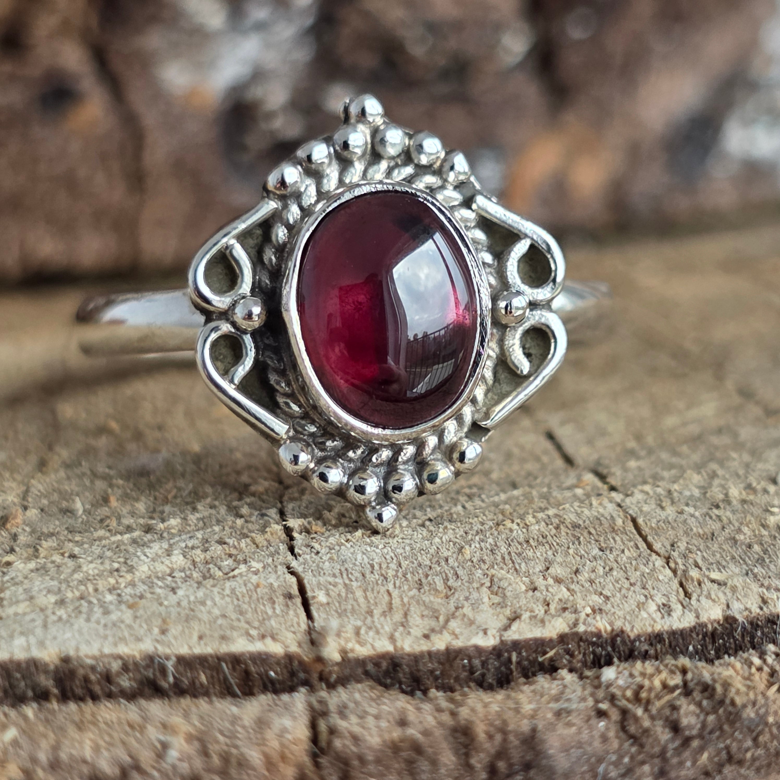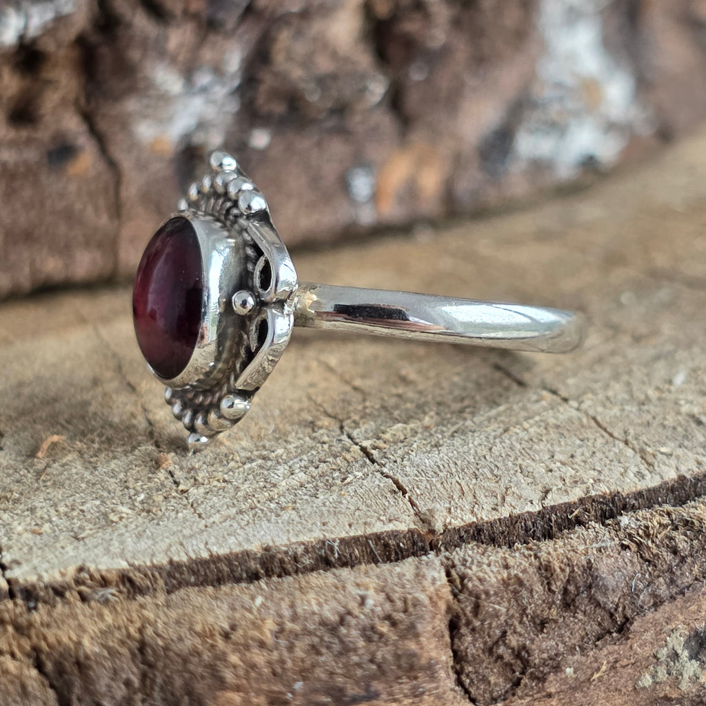 Un inel elegant și plin de caracter, lucrat din argint 925 și împodobit cu o piatră naturală de granat, cu nuanțe profunde de roșu rubiniu, ce prind viață în lumină.