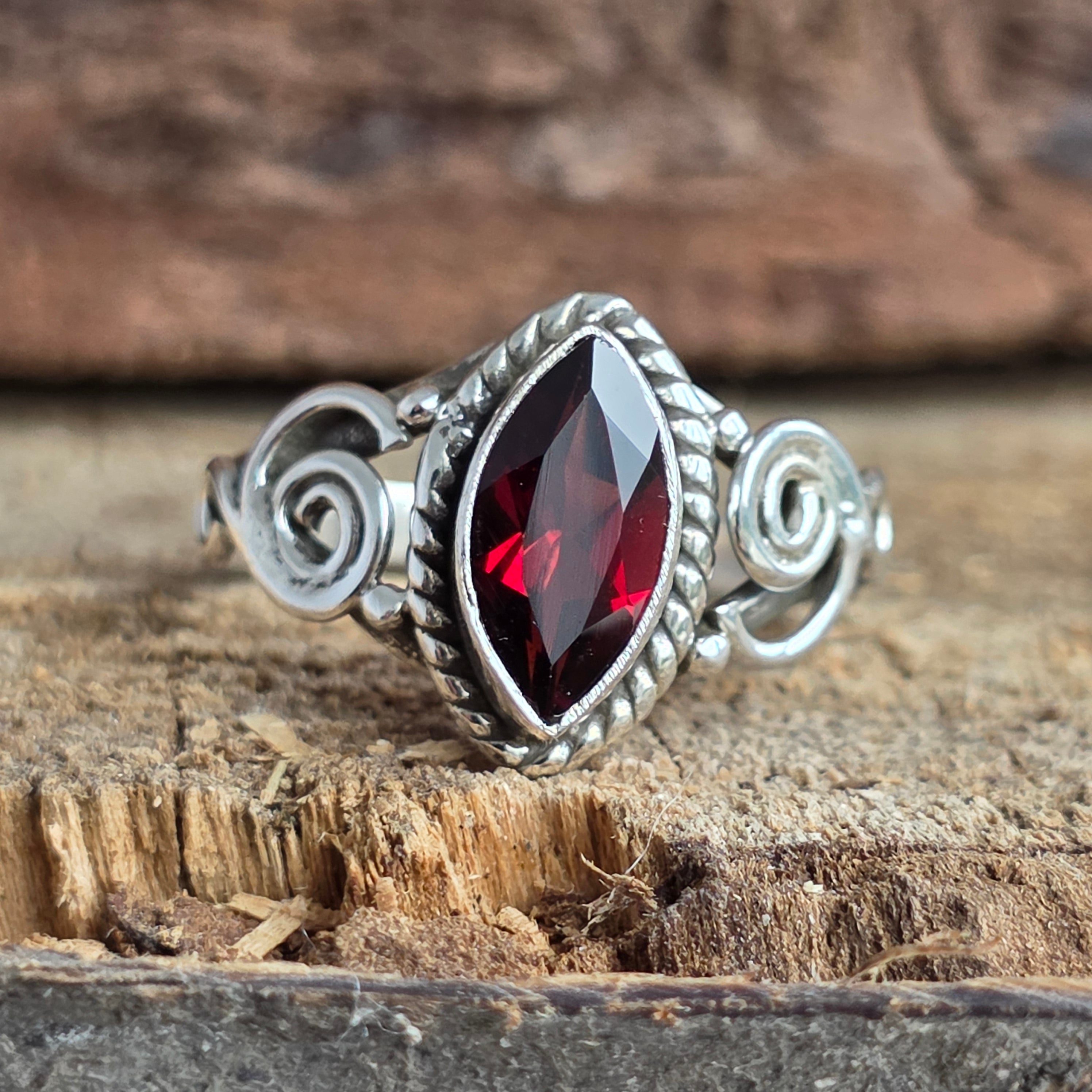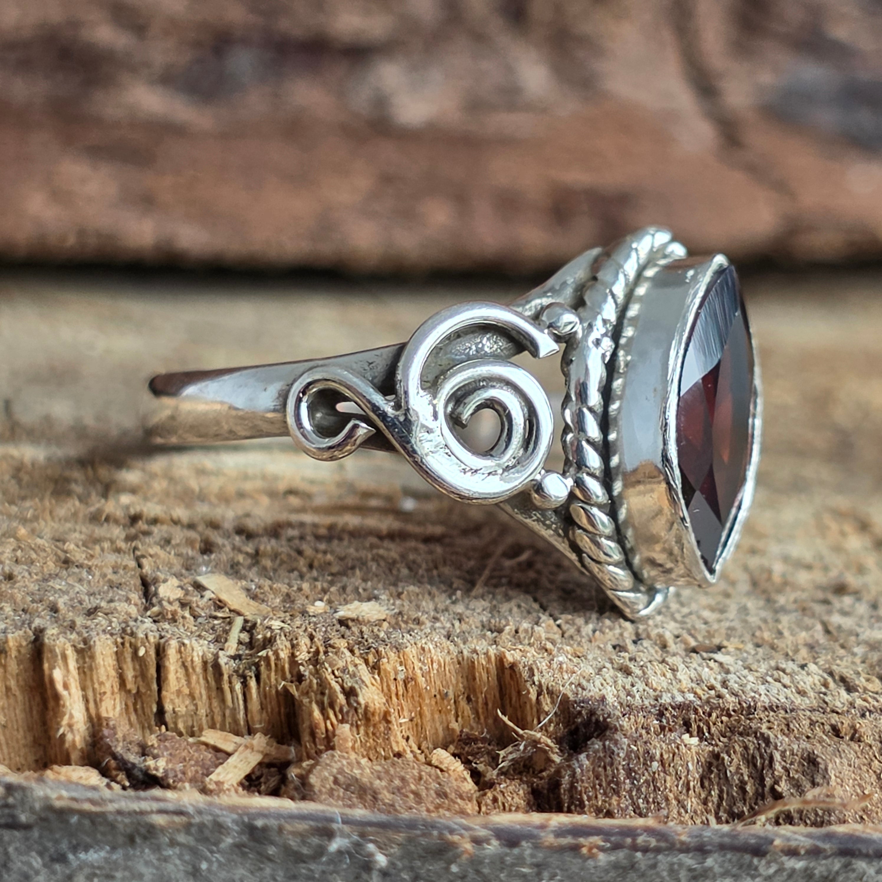 Un inel ce poartă amprenta timpului – lucrat manual din argint 925, cu detalii în fir răsucit și spirale fine ce încadrează intensitatea granatului natural.