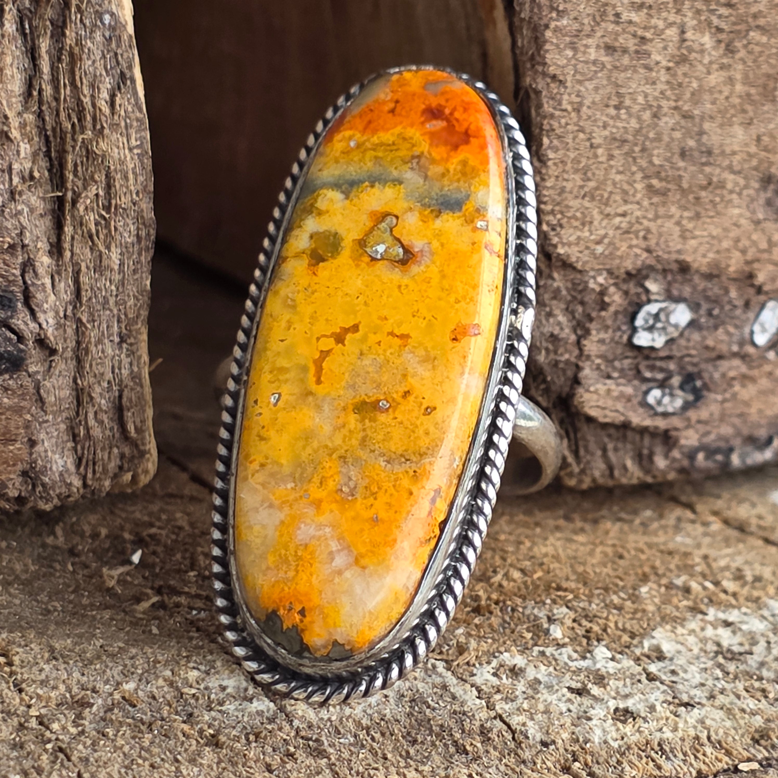 Un inel spectaculos, realizat din argint 925, cu o piatră impresionantă de Bumblebee Jasper, cunoscută pentru amestecul vibrant de tonuri galbene, portocalii și gri-aurii. Modelul wire work lucrat manual încadrează piatra cu finețe, accentuându-i nuanțele calde și textura naturală.