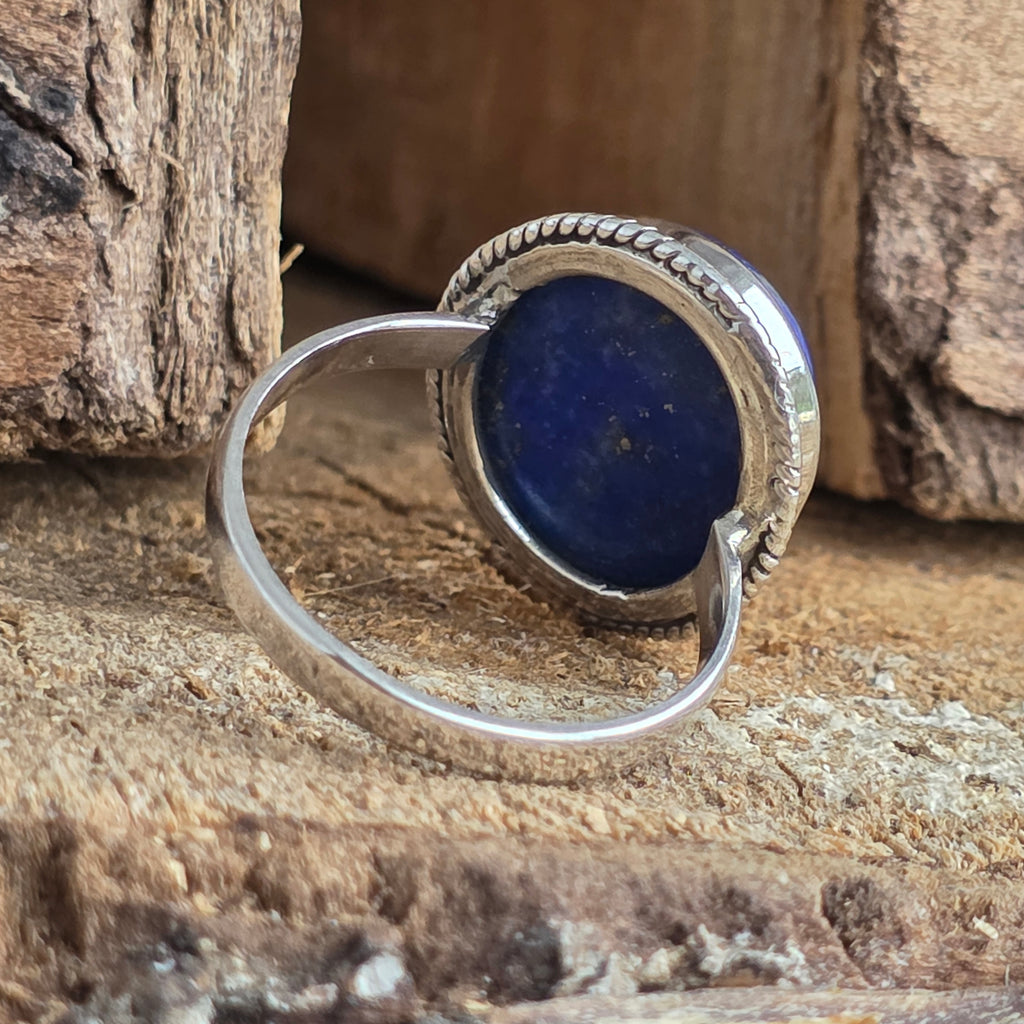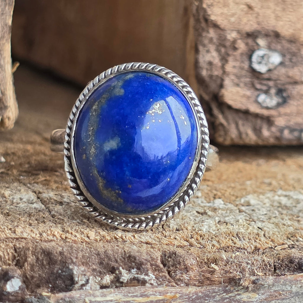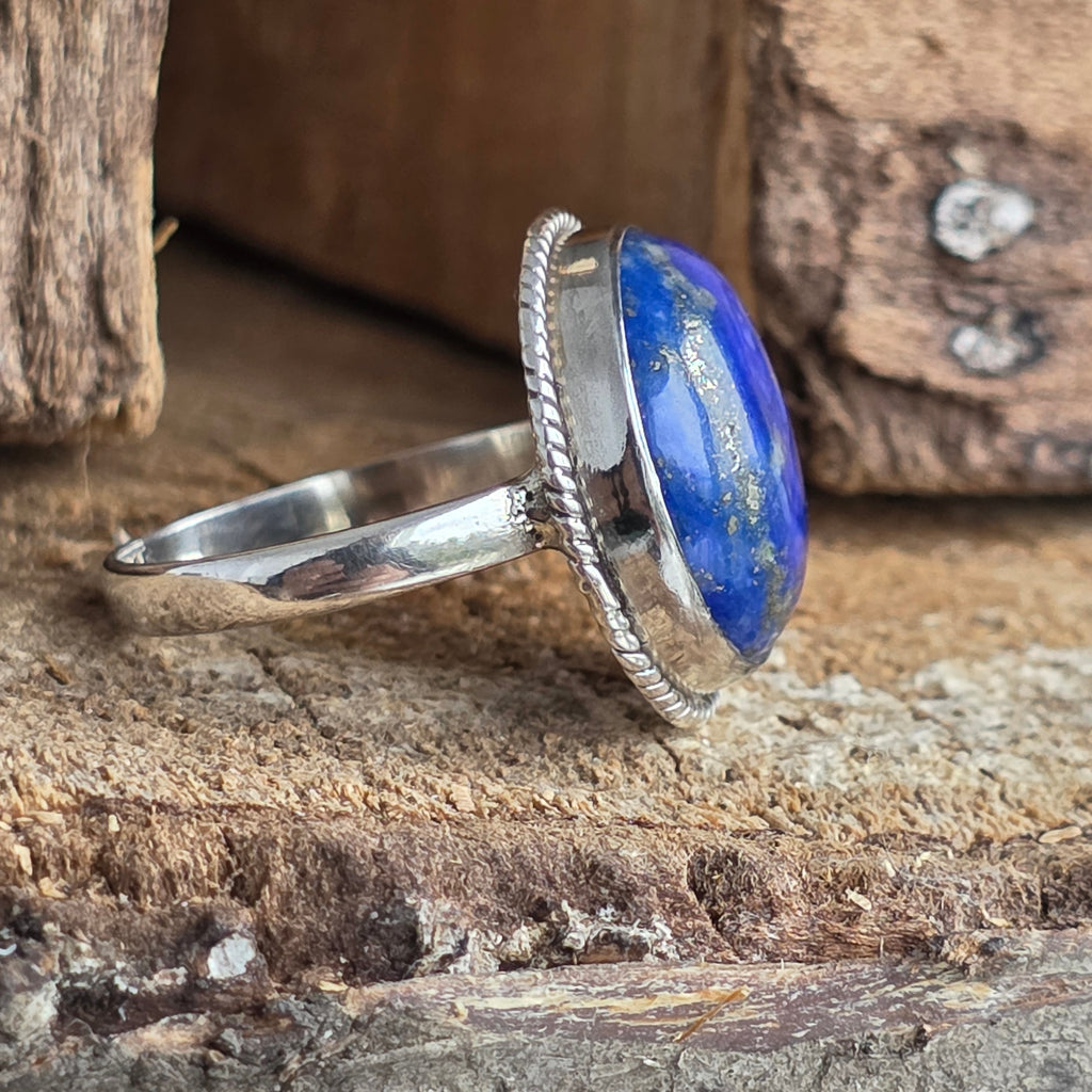 Un inel elegant din argint 925, cu lapis lazuli natural – piatra înțelepciunii și a albastrului ceresc. Reflexele aurii de pirită dansează subtil în masa albastră a pietrei, evocând nopțile senine pline de stele. Designul său clasic, cu montură lucioasă și proporții armonioase, îl transformă într-o piesă sofisticată și atemporală.