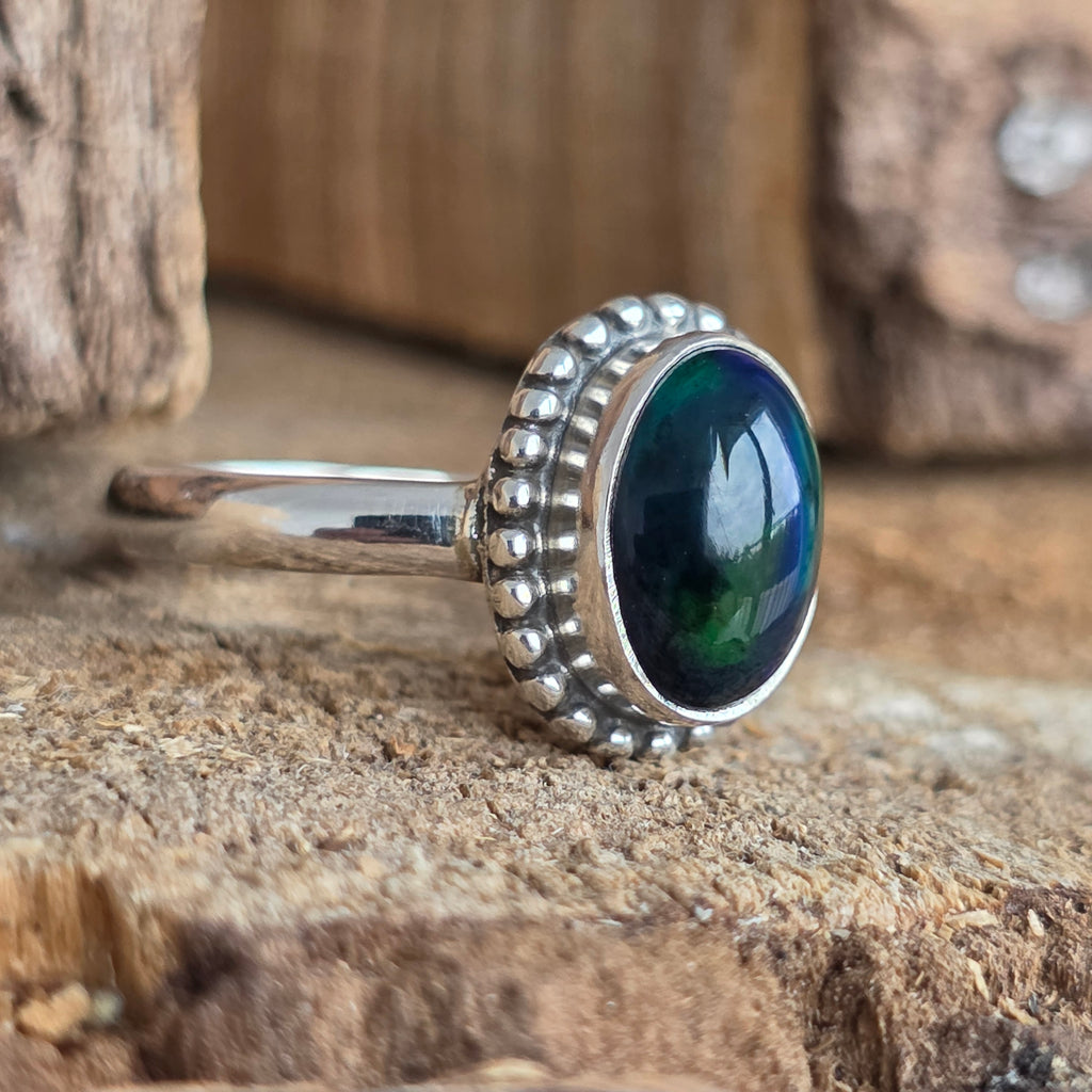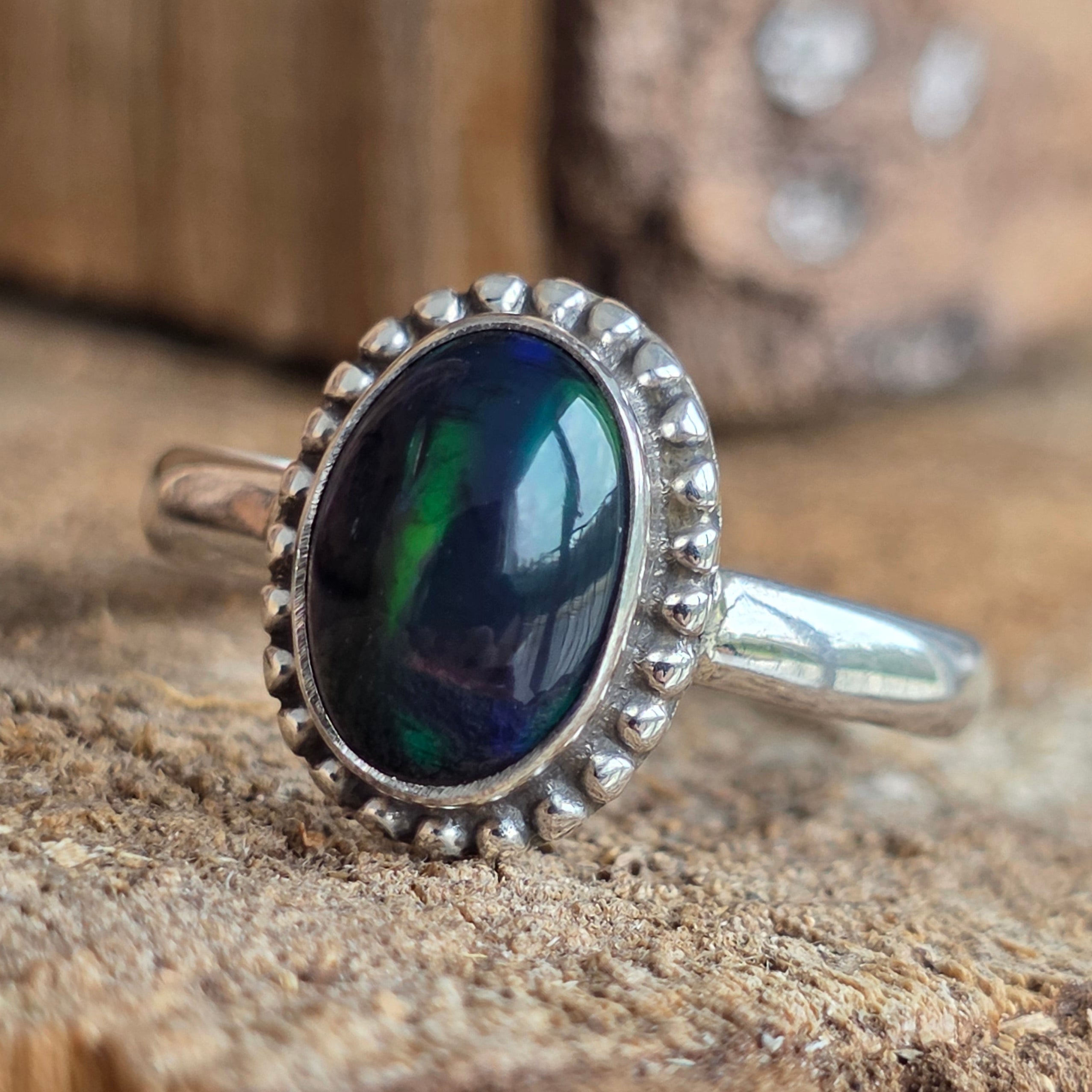 Un inel elegant și rafinat, realizat din argint 925, cu o piatră naturală de opal etiopian, cunoscută pentru reflexele sale irizante în nuanțe de verde, roșu și albastru. Designul minimalist plain wire setting permite pietrei să fie în centrul atenției, captând lumina din orice unghi.