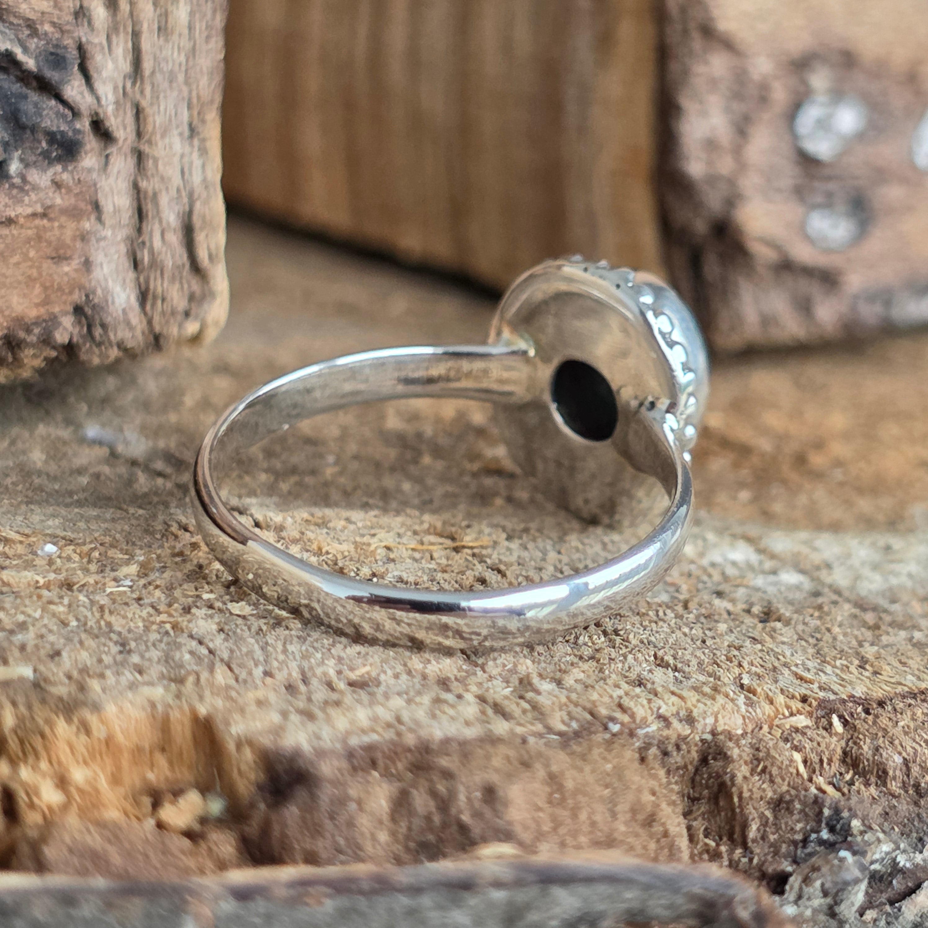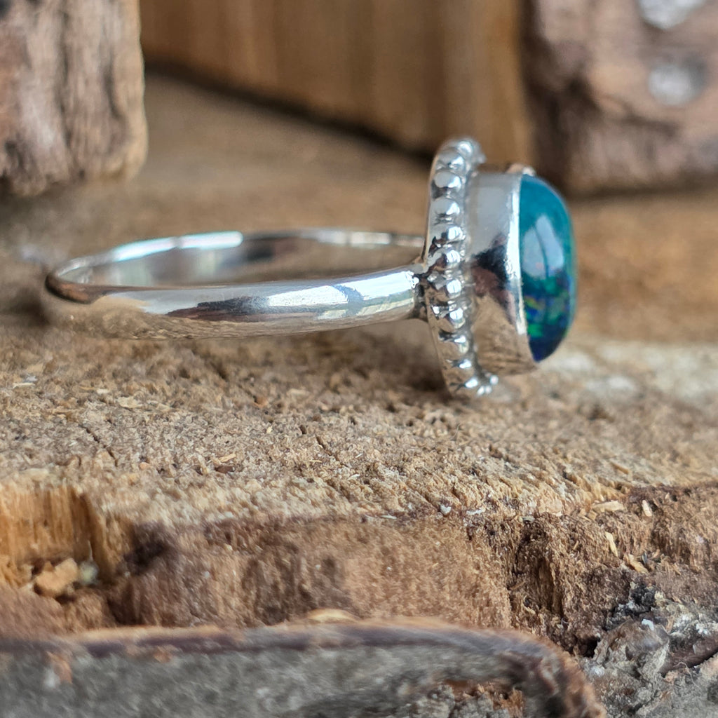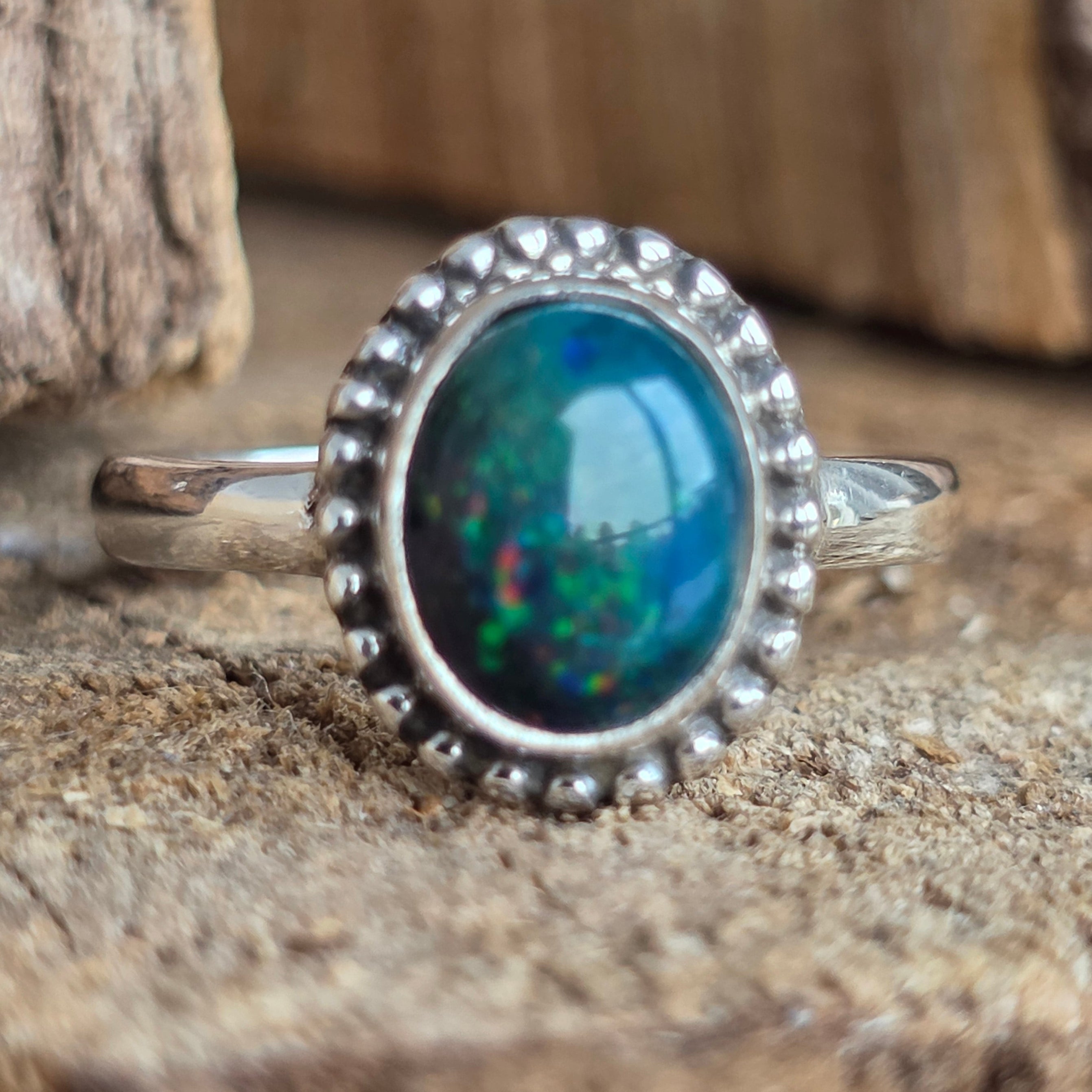 Un inel elegant și rafinat, realizat din argint 925, cu o piatră naturală de opal etiopian, cunoscută pentru reflexele sale irizante în nuanțe de verde, roșu și albastru. Designul minimalist plain wire setting permite pietrei să fie în centrul atenției, captând lumina din orice unghi.