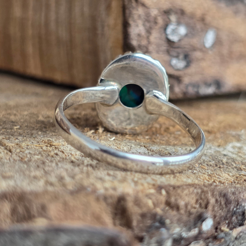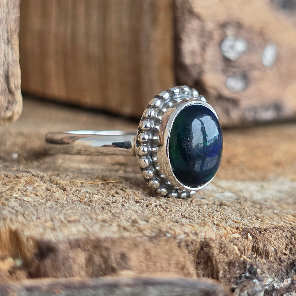 Un inel elegant și rafinat, realizat din argint 925, cu o piatră naturală de opal etiopian, cunoscută pentru reflexele sale irizante în nuanțe de verde, roșu și albastru. Designul minimalist plain wire setting permite pietrei să fie în centrul atenției, captând lumina din orice unghi.