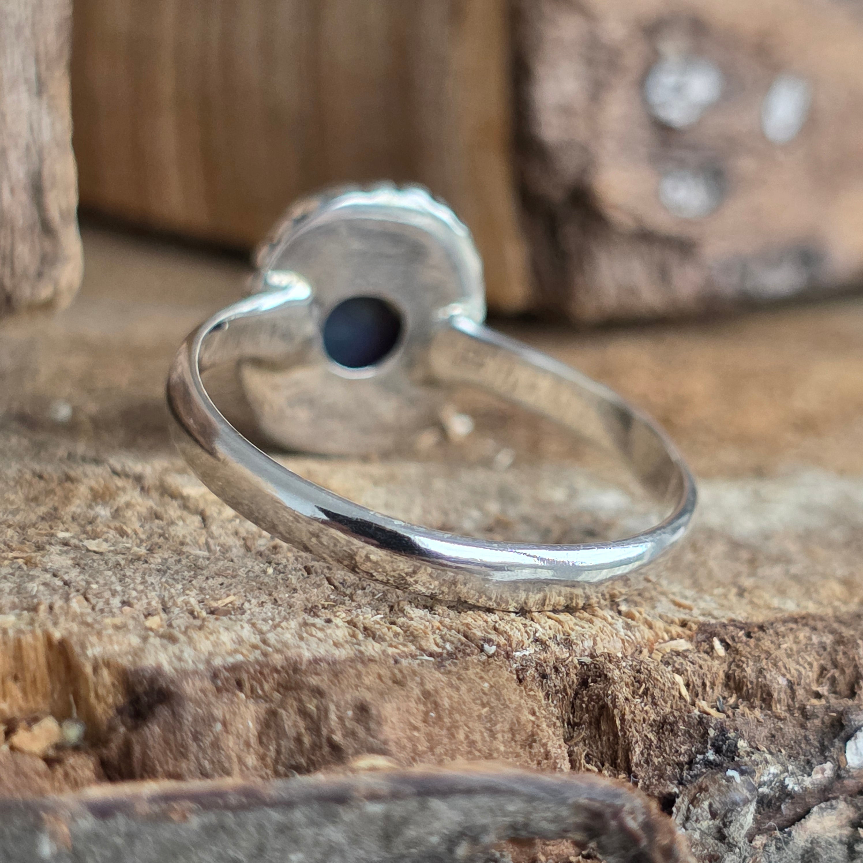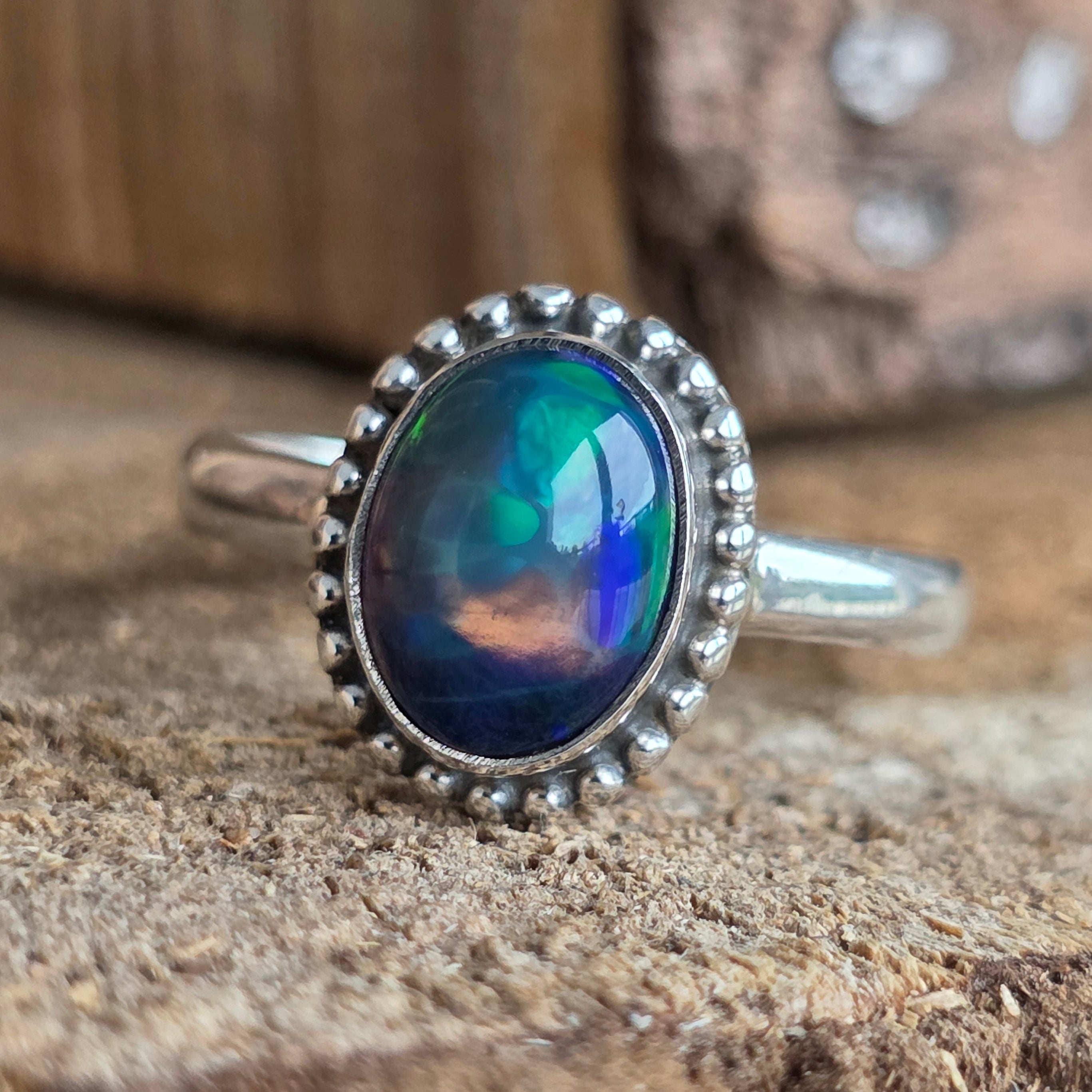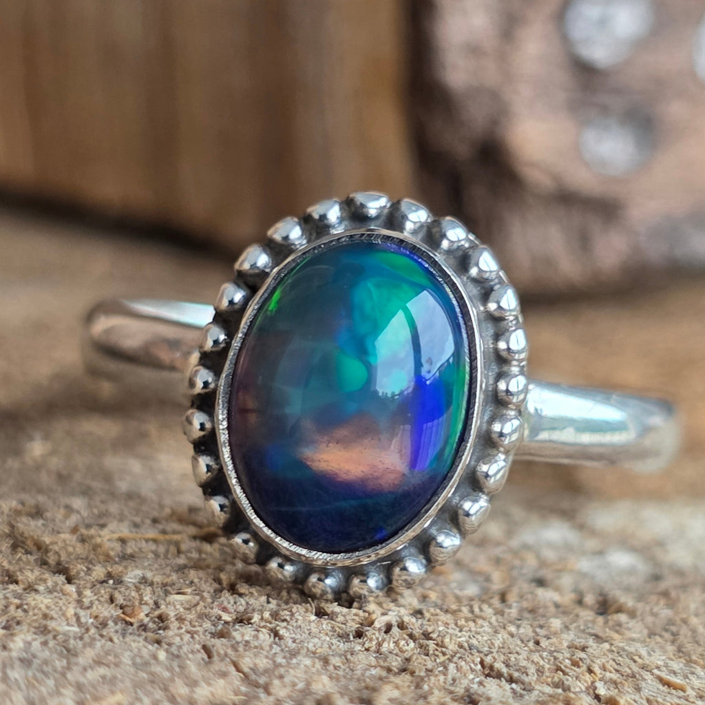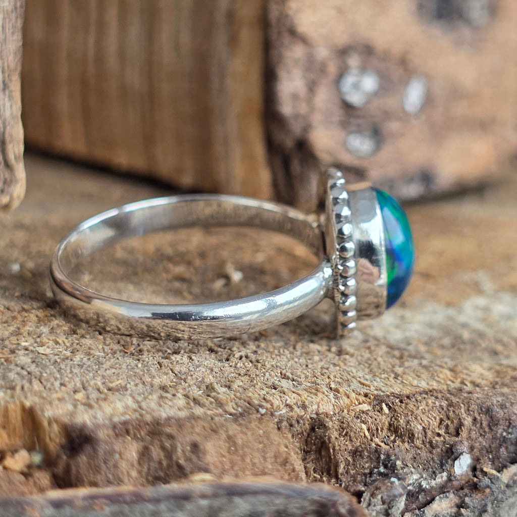 Un inel elegant și rafinat, realizat din argint 925, cu o piatră naturală de opal etiopian, cunoscută pentru reflexele sale irizante în nuanțe de verde, roșu și albastru. Designul minimalist plain wire setting permite pietrei să fie în centrul atenției, captând lumina din orice unghi.