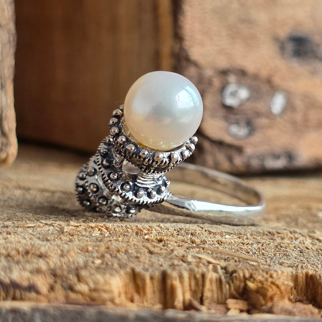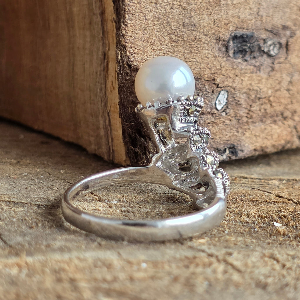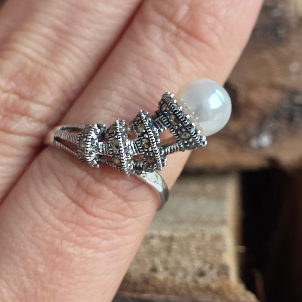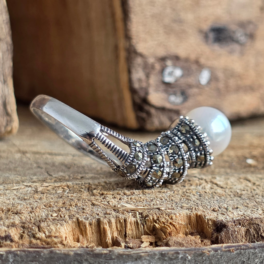 Un simbol al eleganței atemporale, acest inel din argint 925 îmbină lumina catifelată a perlei naturale cu reflexele metalice ale marcasitului, într-un design care evocă farmecul bijuteriilor clasice.