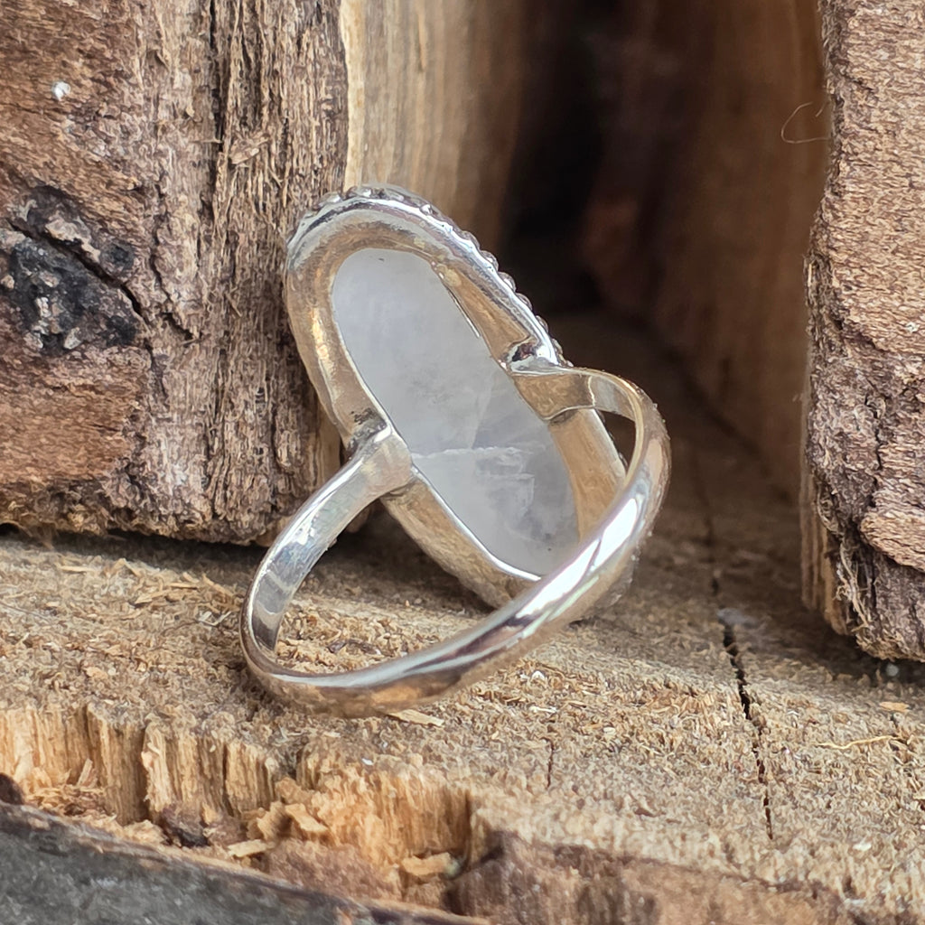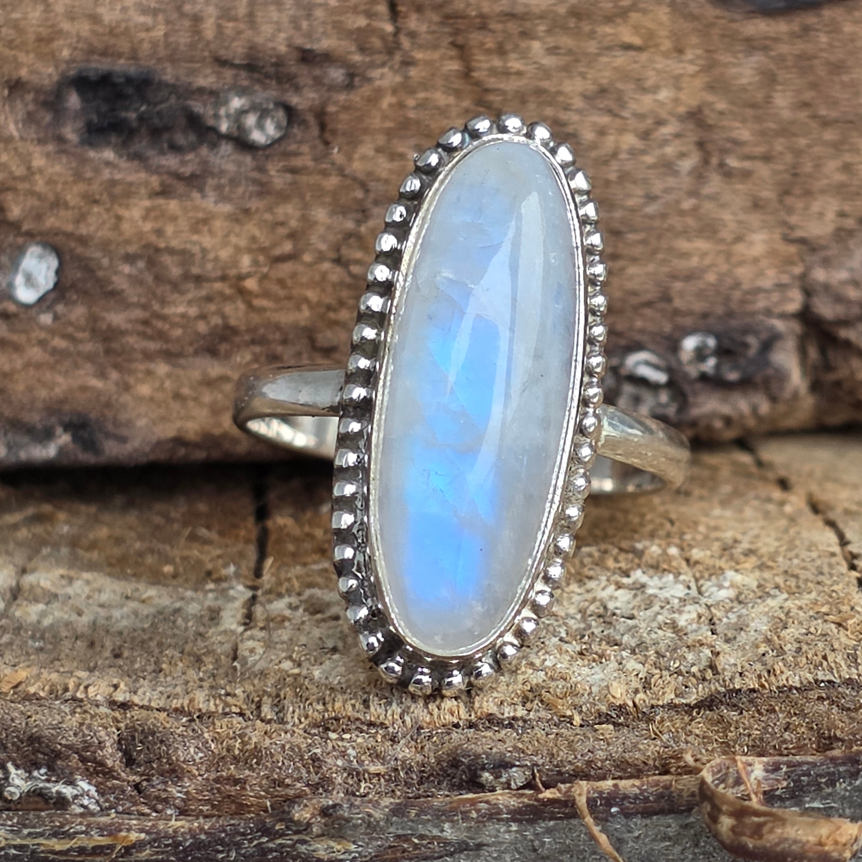 Un inel elegant și luminos din argint 925, cu piatră lunii curcubeu naturală, recunoscută pentru reflexele sale albastre, argintii și sidefii. Designul rawa work lucrat manual pune în evidență forma alungită a pietrei, creând o bijuterie sofisticată și delicată în același timp.