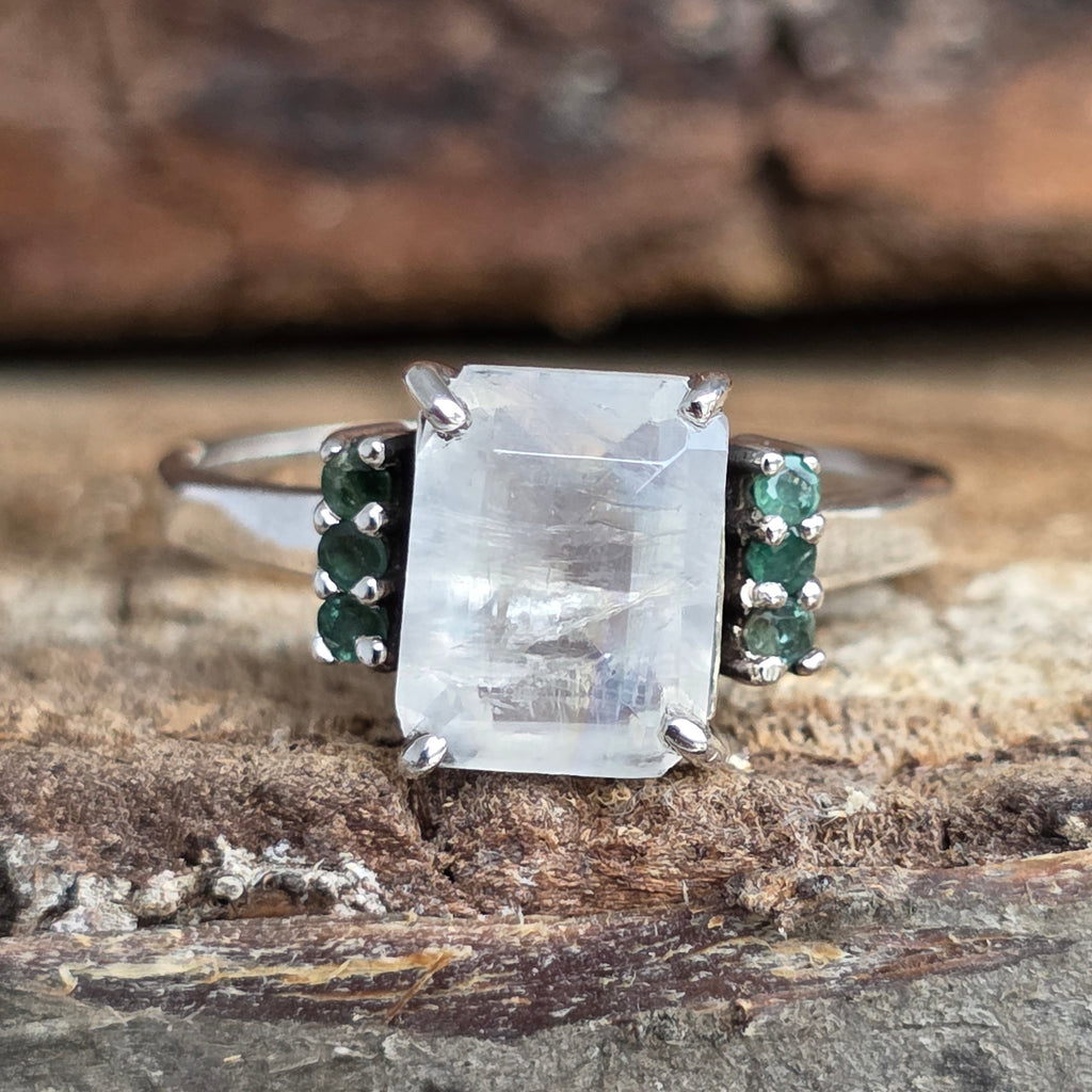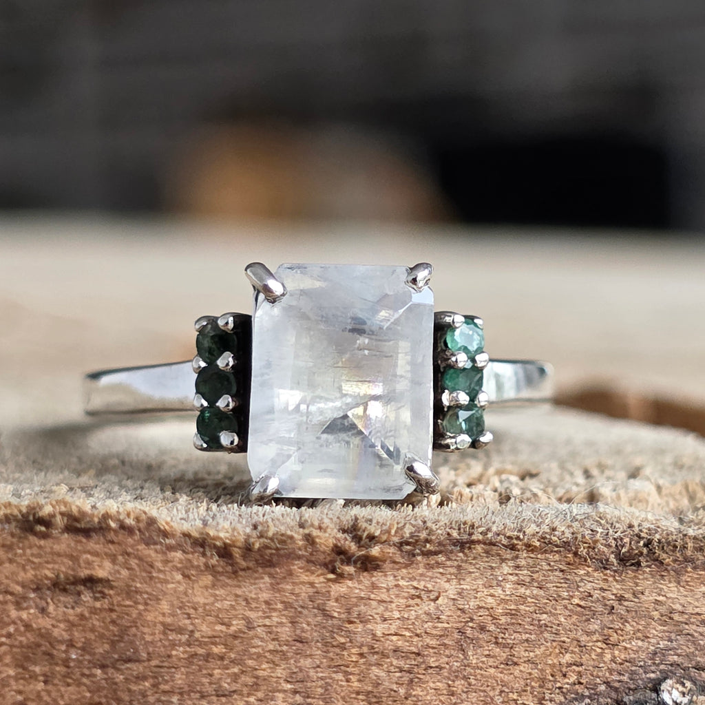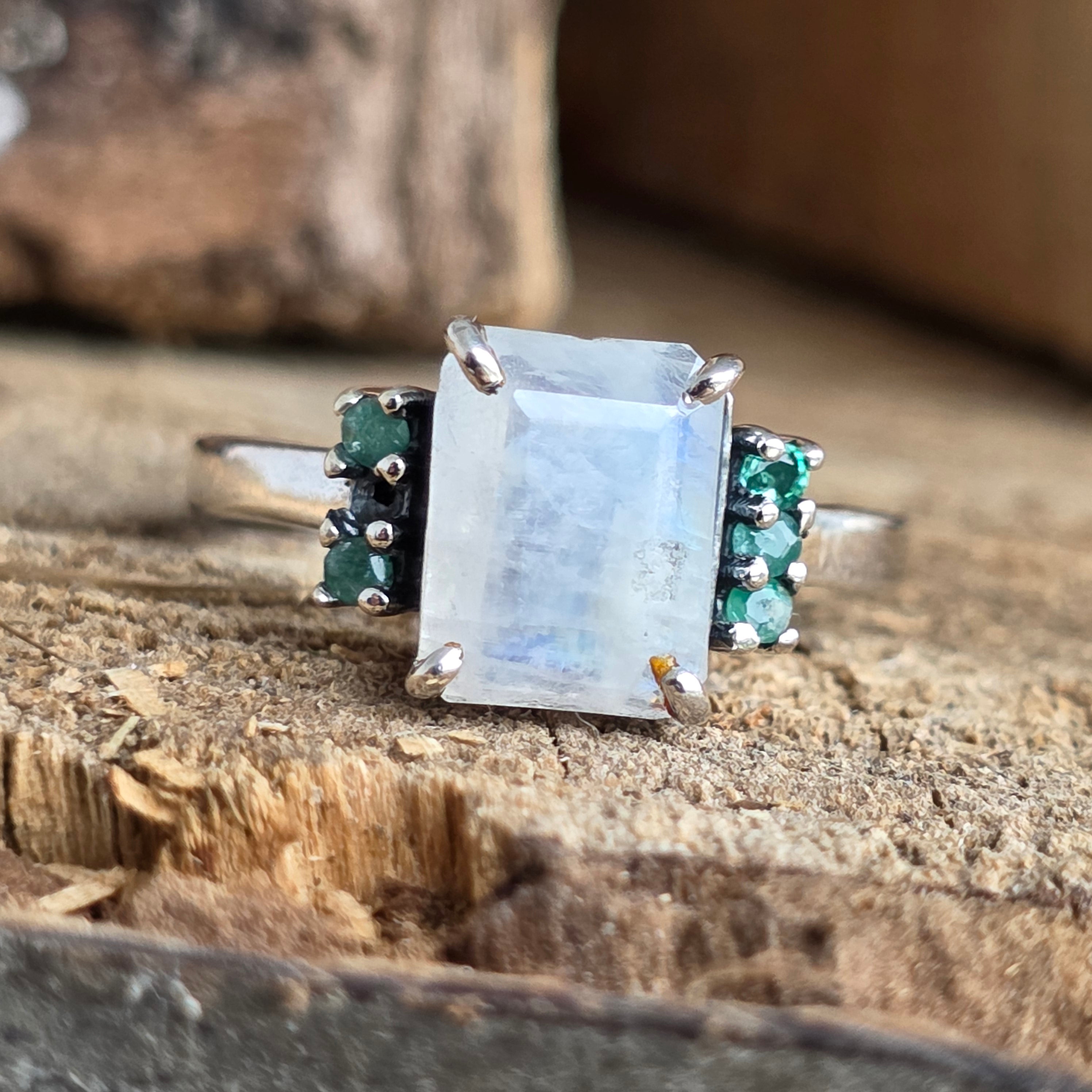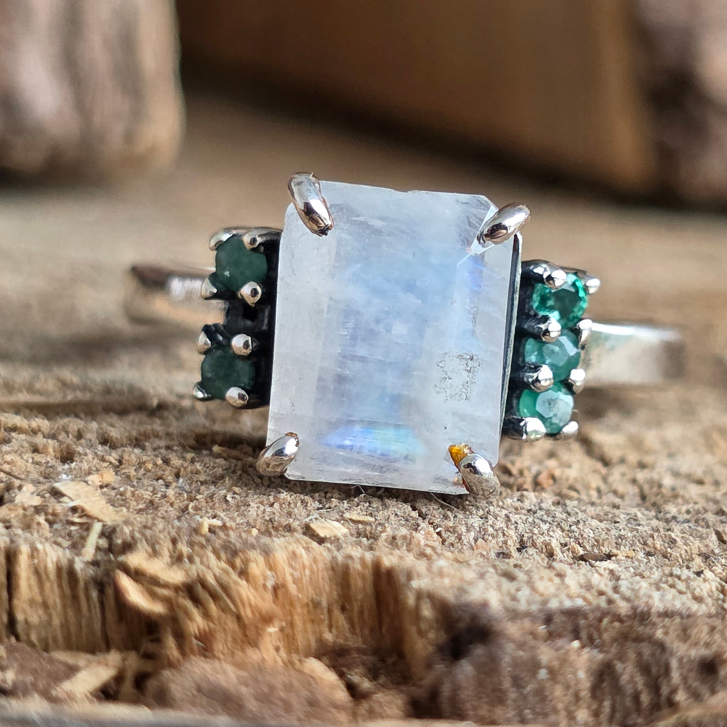 Un inel care pare desprins din lumina lunii — Rainbow Moonstone, cu reflexele sale albastre și argintii, este accentuat de strălucirea profundă a smaraldelor naturale, simbol al regenerării și al echilibrului.