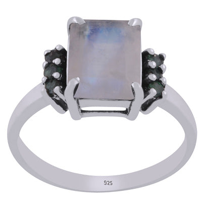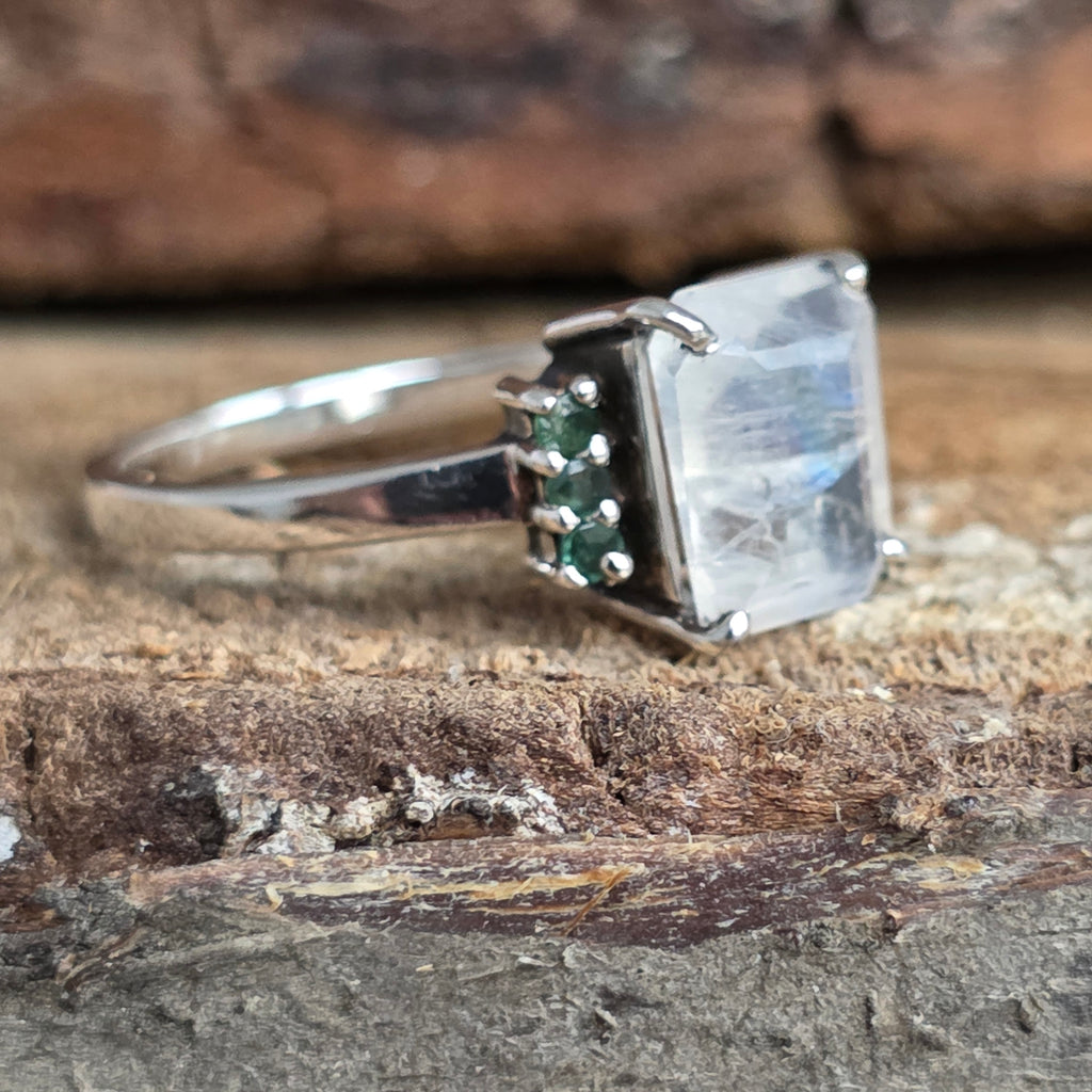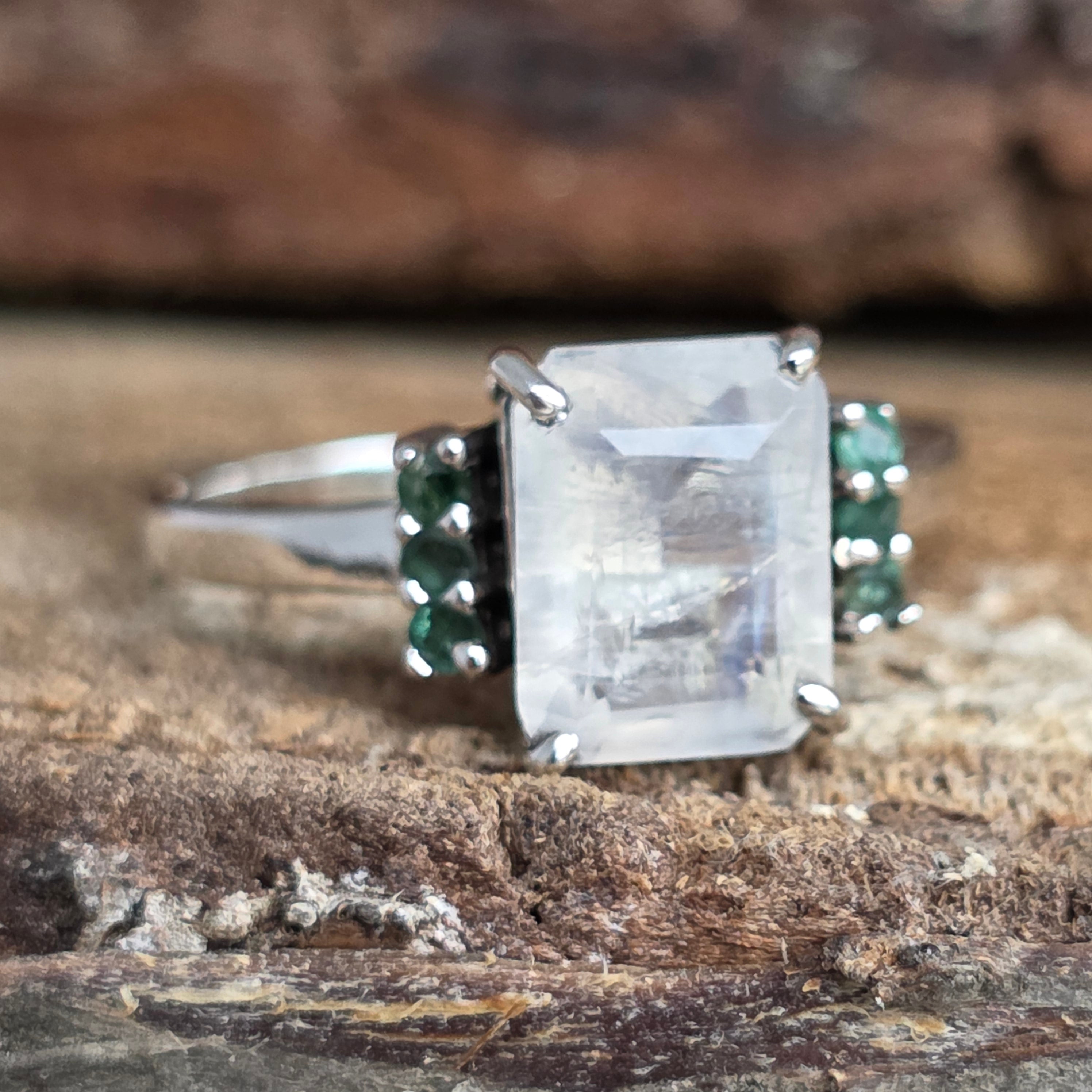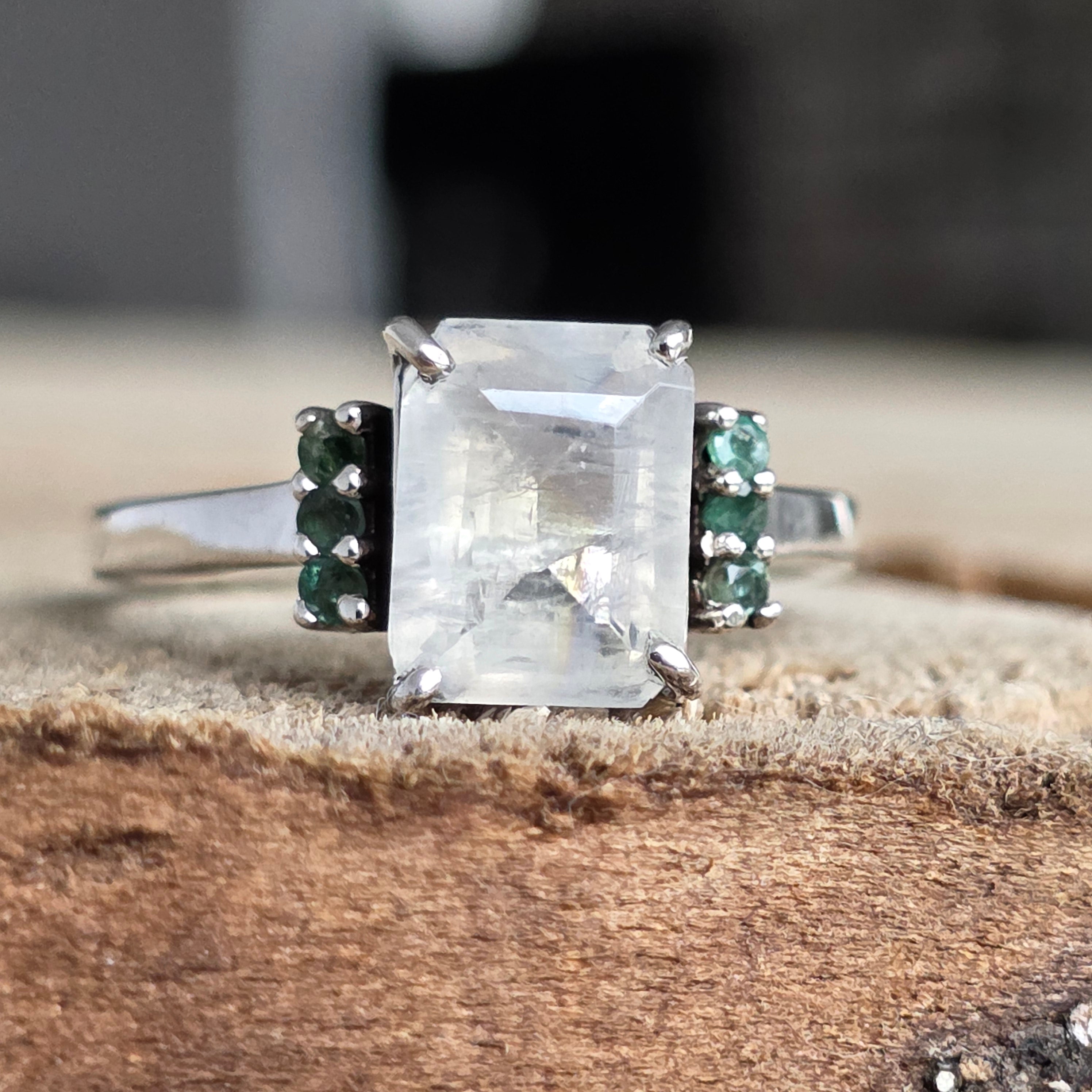 Un inel care pare desprins din lumina lunii — Rainbow Moonstone, cu reflexele sale albastre și argintii, este accentuat de strălucirea profundă a smaraldelor naturale, simbol al regenerării și al echilibrului.