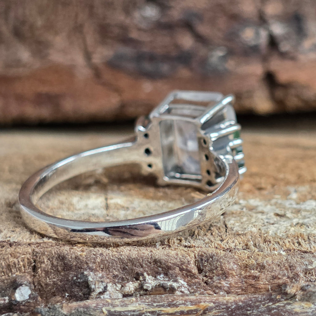 Montura delicată din argint 925 pune în valoare contrastul dintre luminozitatea translucidă a pietrei centrale și verdele viu al pietrelor laterale.