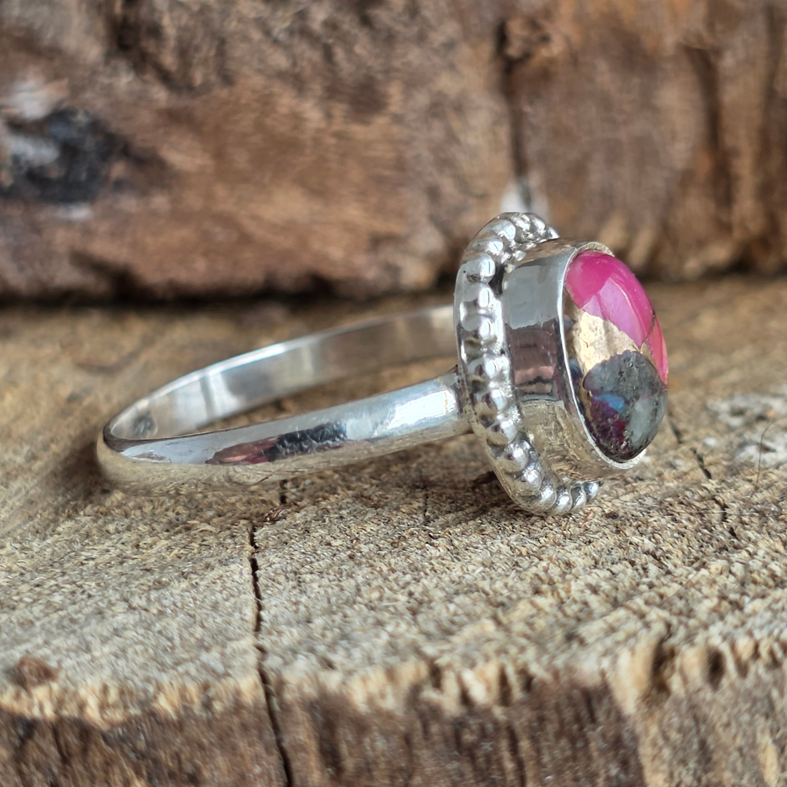 Un inel delicat, dar cu o prezență vibrantă – lucrat manual din argint 925 și înnobilat cu o piatră Pink Dahlia Copper Turquoise, ce îmbină nuanțe vii de fucsia, roz intens, albastru turcoaz și reflexe calde de cupru.