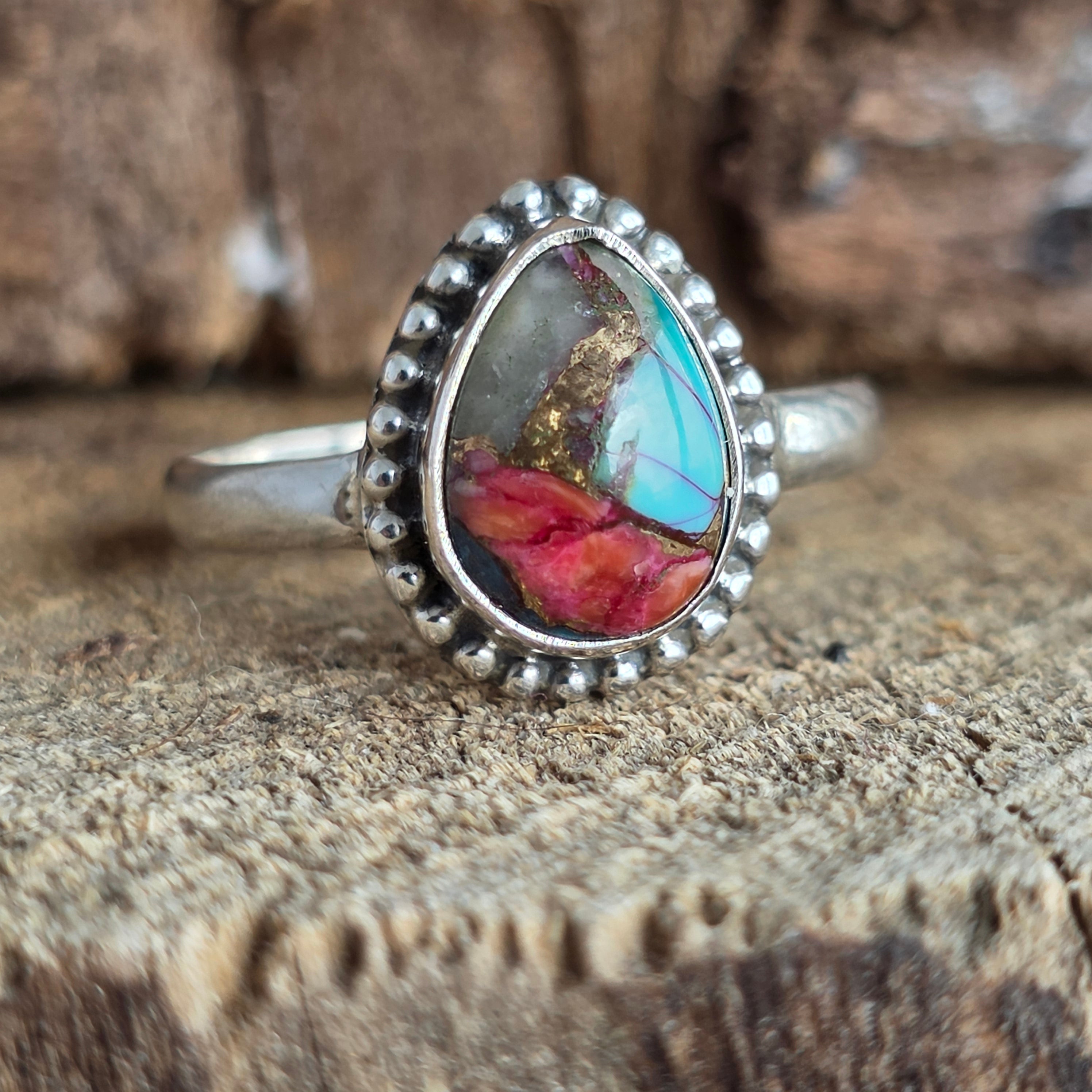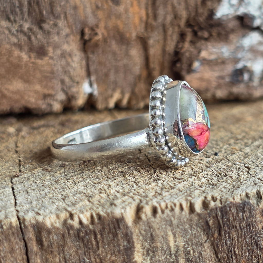 Un inel delicat, dar cu o prezență vibrantă – lucrat manual din argint 925 și înnobilat cu o piatră Pink Dahlia Copper Turquoise, ce îmbină nuanțe vii de fucsia, roz intens, albastru turcoaz și reflexe calde de cupru.