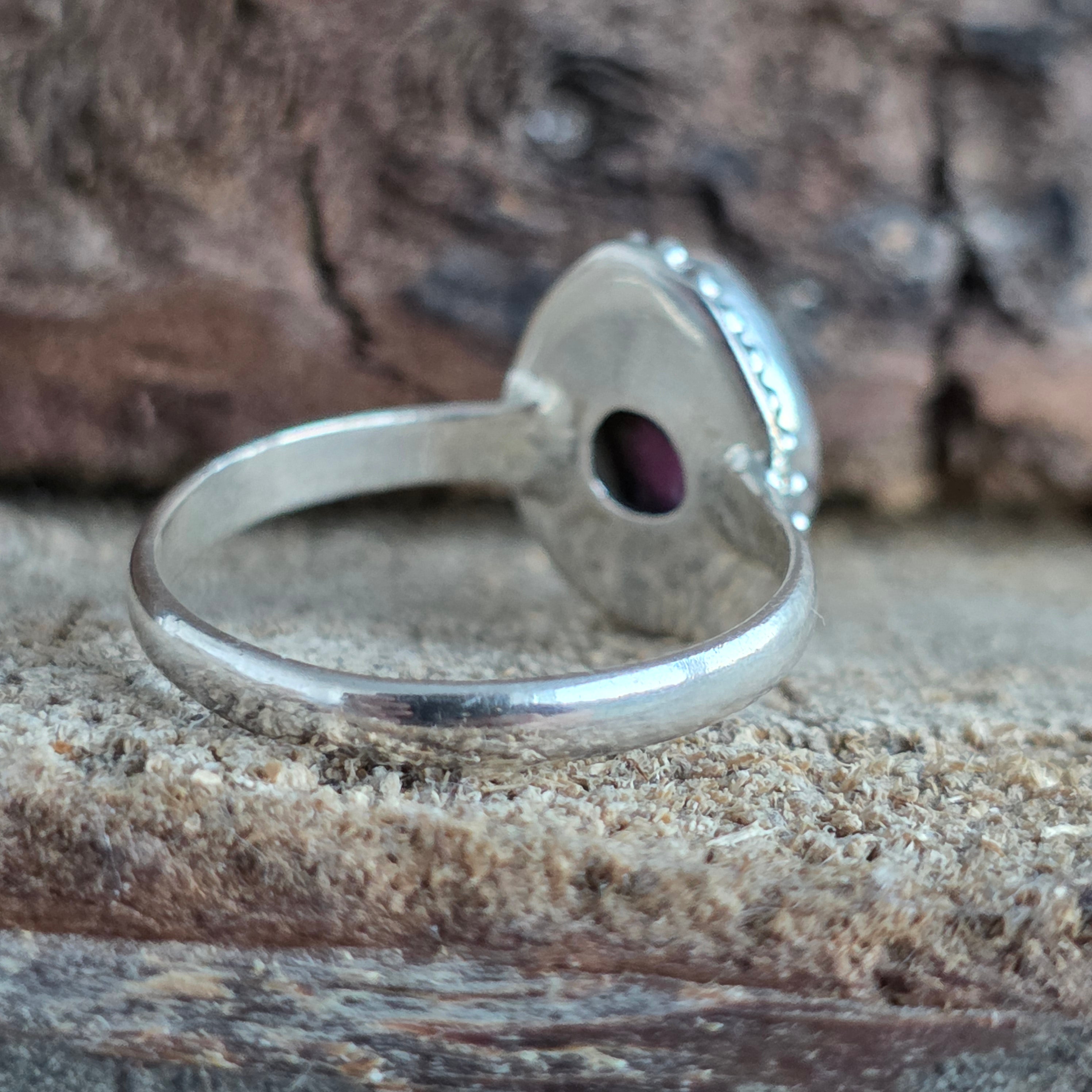 Modelul oval al pietrei este pus în valoare de montura elegantă cu margine granulată, un detaliu inspirat din tehnica tradițională indiană rawa work, care adaugă profunzime și un aer artizanal rafinat.