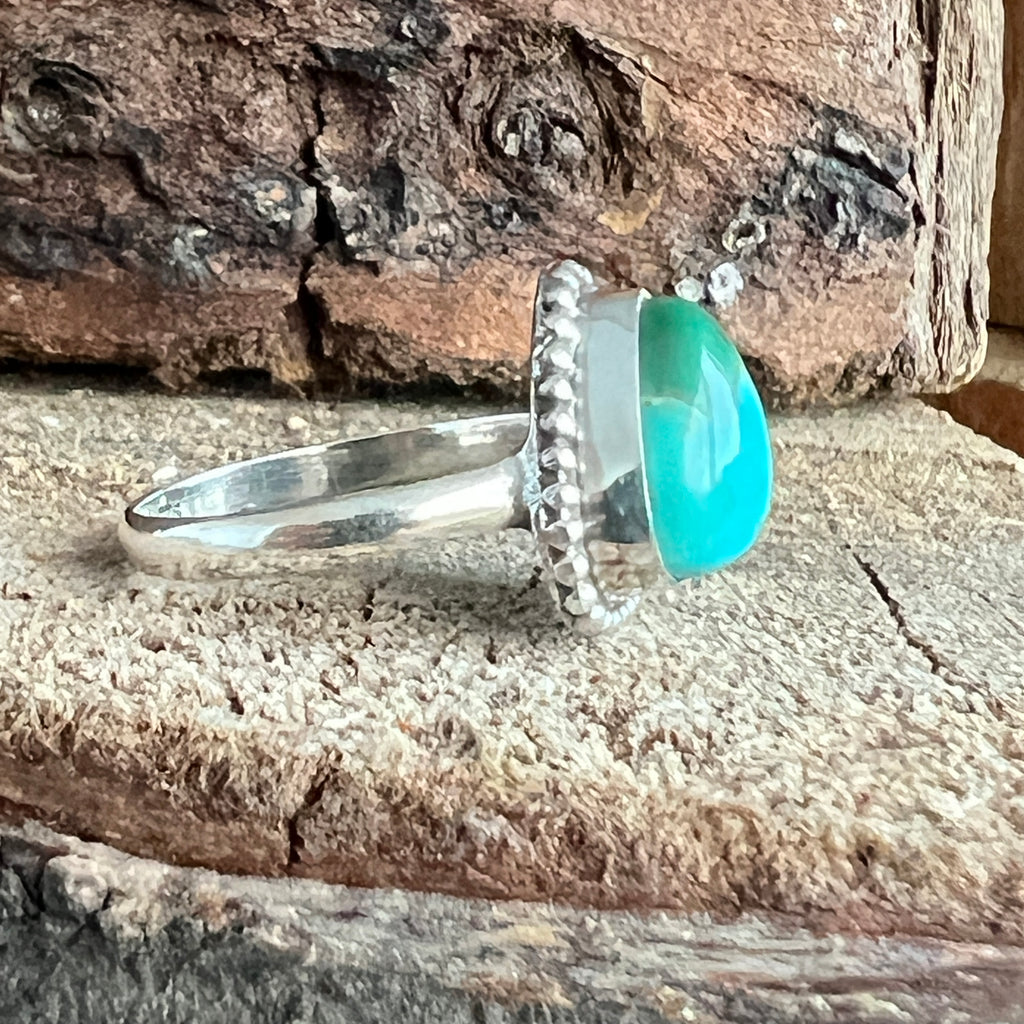 Un inel elegant din argint 925, cu o piatră naturală de turcoaz cu nuanțe variind între albastru cer și verde acvatic, străbătută de vene fine maronii și gri. Designul minimalist tip plain collet lasă întreaga atenție pietrei, punând în valoare frumusețea ei organică și textura autentică.