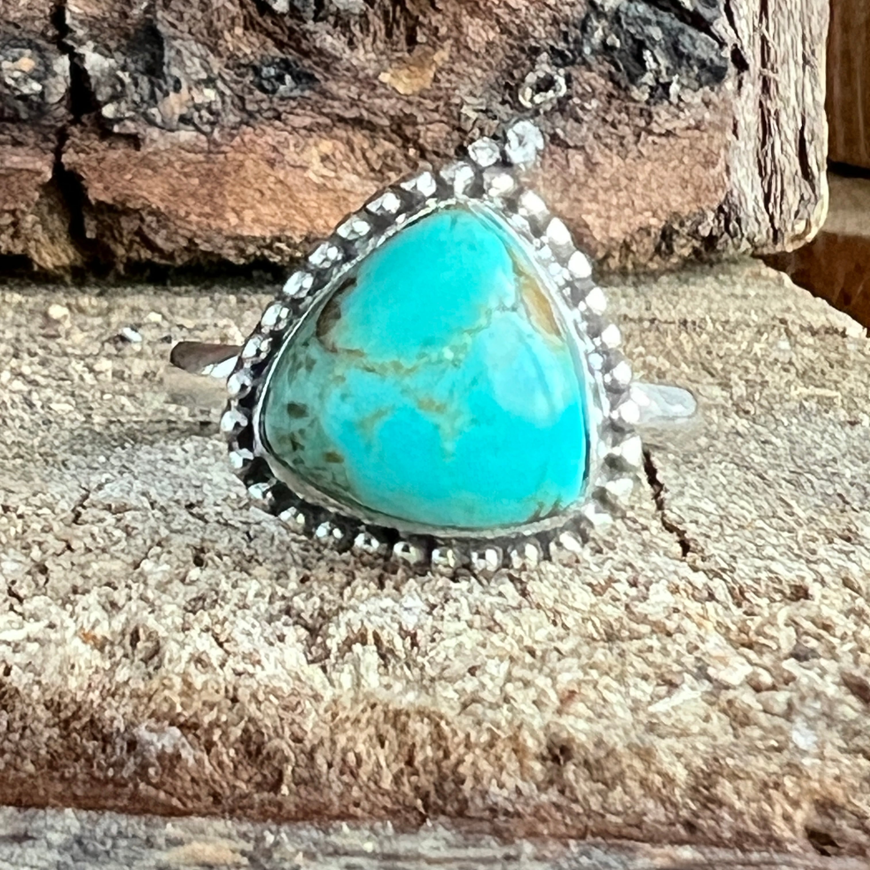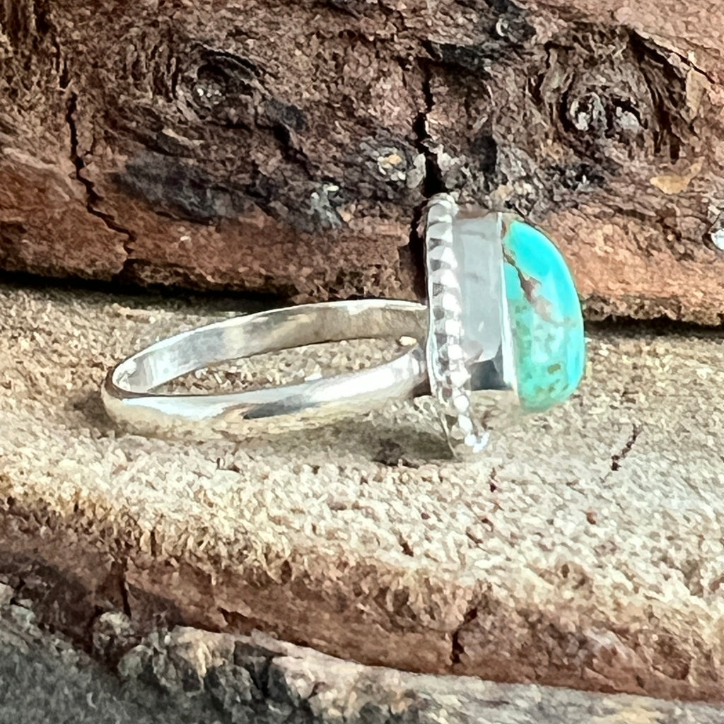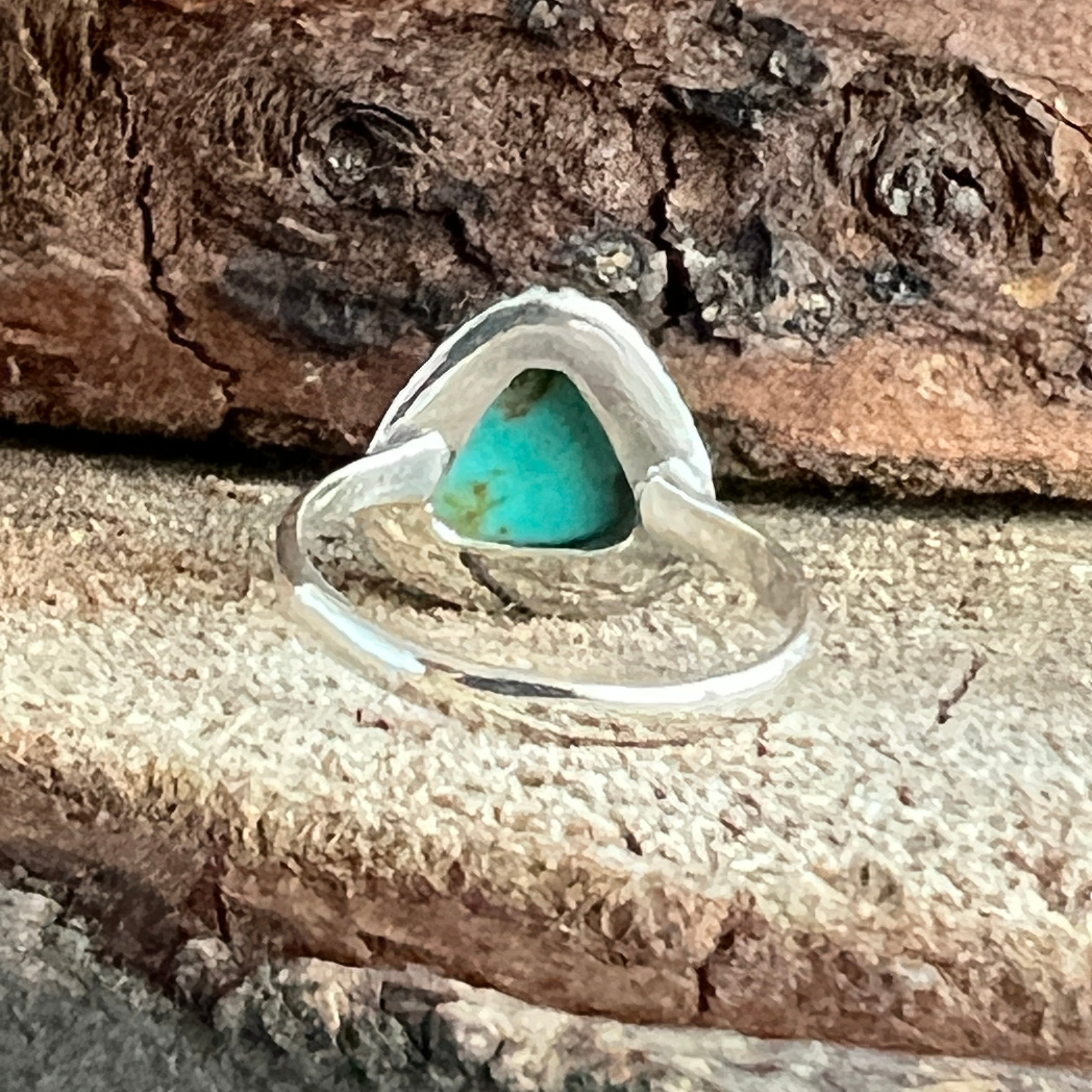 Un inel elegant din argint 925, cu o piatră naturală de turcoaz cu nuanțe variind între albastru cer și verde acvatic, străbătută de vene fine maronii și gri. Designul minimalist tip plain collet lasă întreaga atenție pietrei, punând în valoare frumusețea ei organică și textura autentică.
