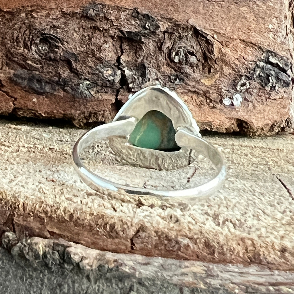 Un inel elegant din argint 925, cu o piatră naturală de turcoaz cu nuanțe variind între albastru cer și verde acvatic, străbătută de vene fine maronii și gri. Designul minimalist tip plain collet lasă întreaga atenție pietrei, punând în valoare frumusețea ei organică și textura autentică.