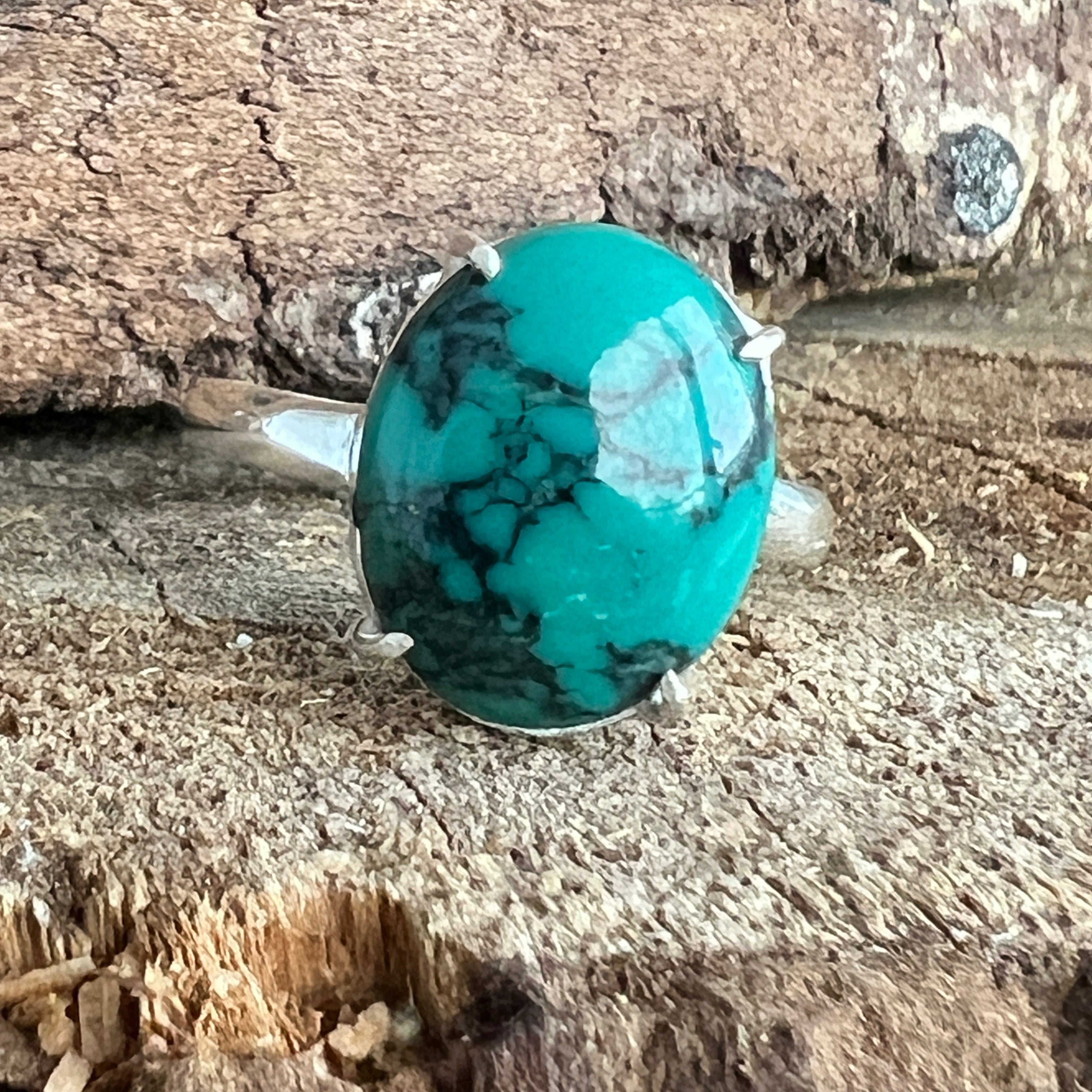 Un inel elegant din argint 925, cu o piatră naturală de turcoaz cu nuanțe variind între albastru cer și verde acvatic, străbătută de vene fine maronii și gri. Designul minimalist tip plain collet lasă întreaga atenție pietrei, punând în valoare frumusețea ei organică și textura autentică.