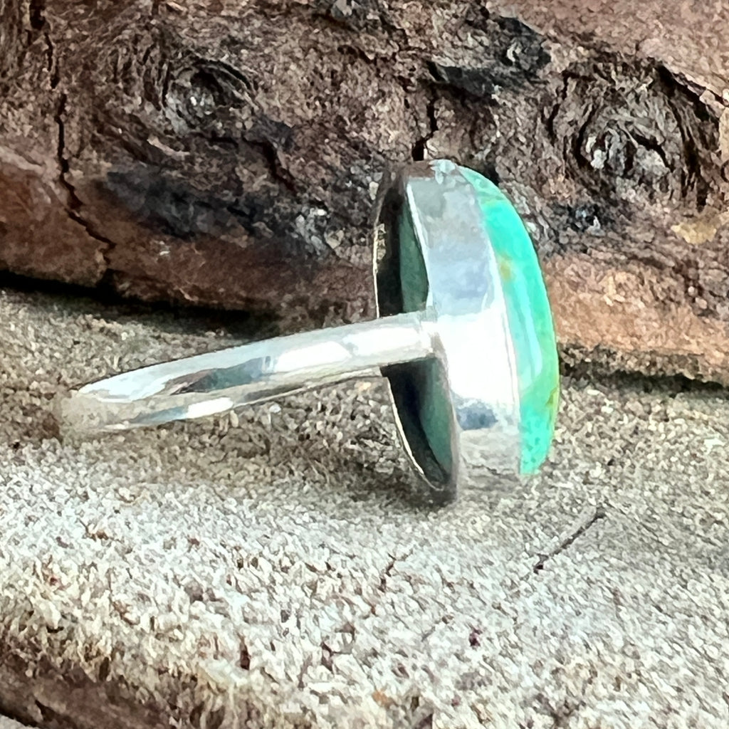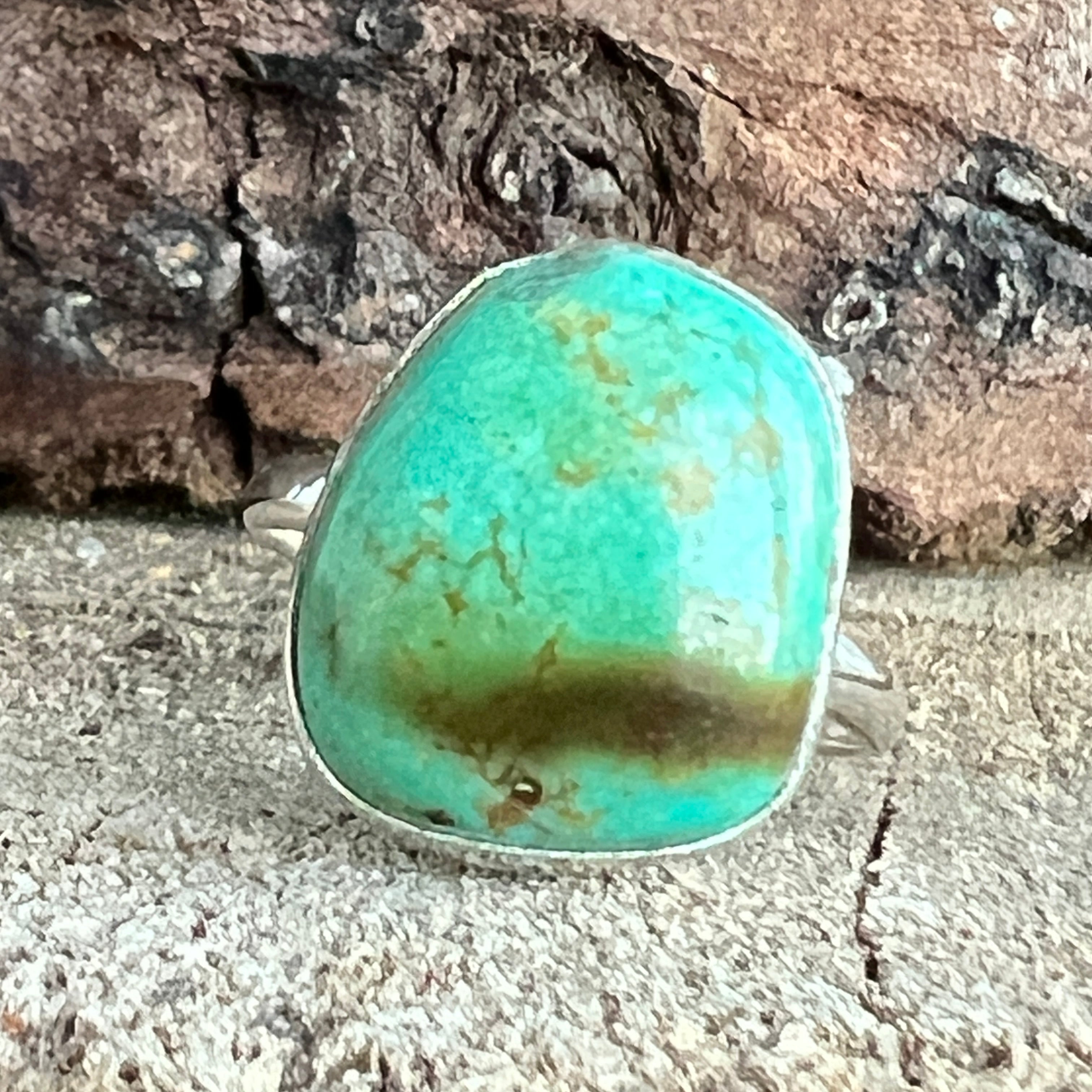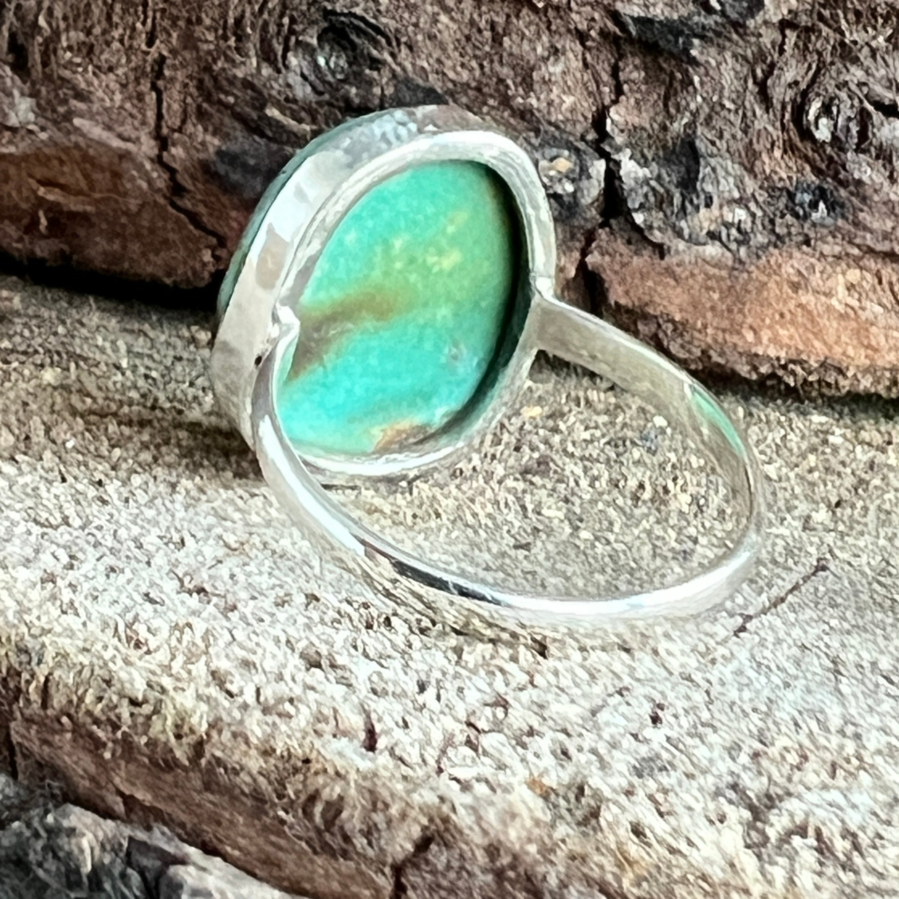 Un inel elegant din argint 925, cu o piatră naturală de turcoaz cu nuanțe variind între albastru cer și verde acvatic, străbătută de vene fine maronii și gri. Designul minimalist tip plain collet lasă întreaga atenție pietrei, punând în valoare frumusețea ei organică și textura autentică.