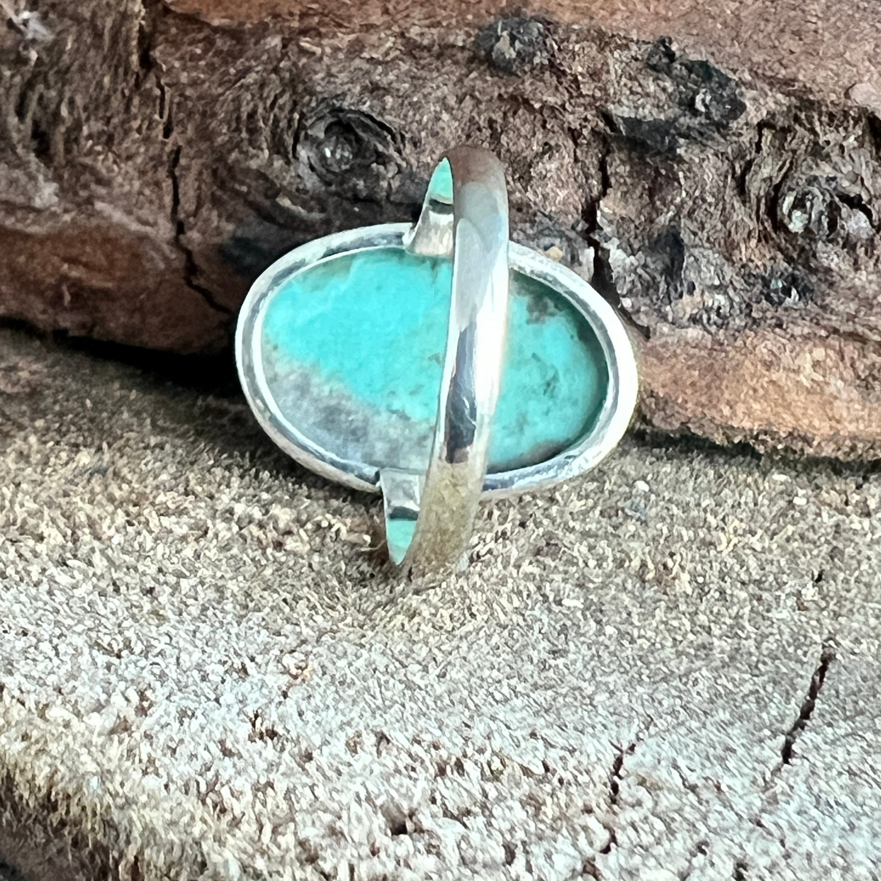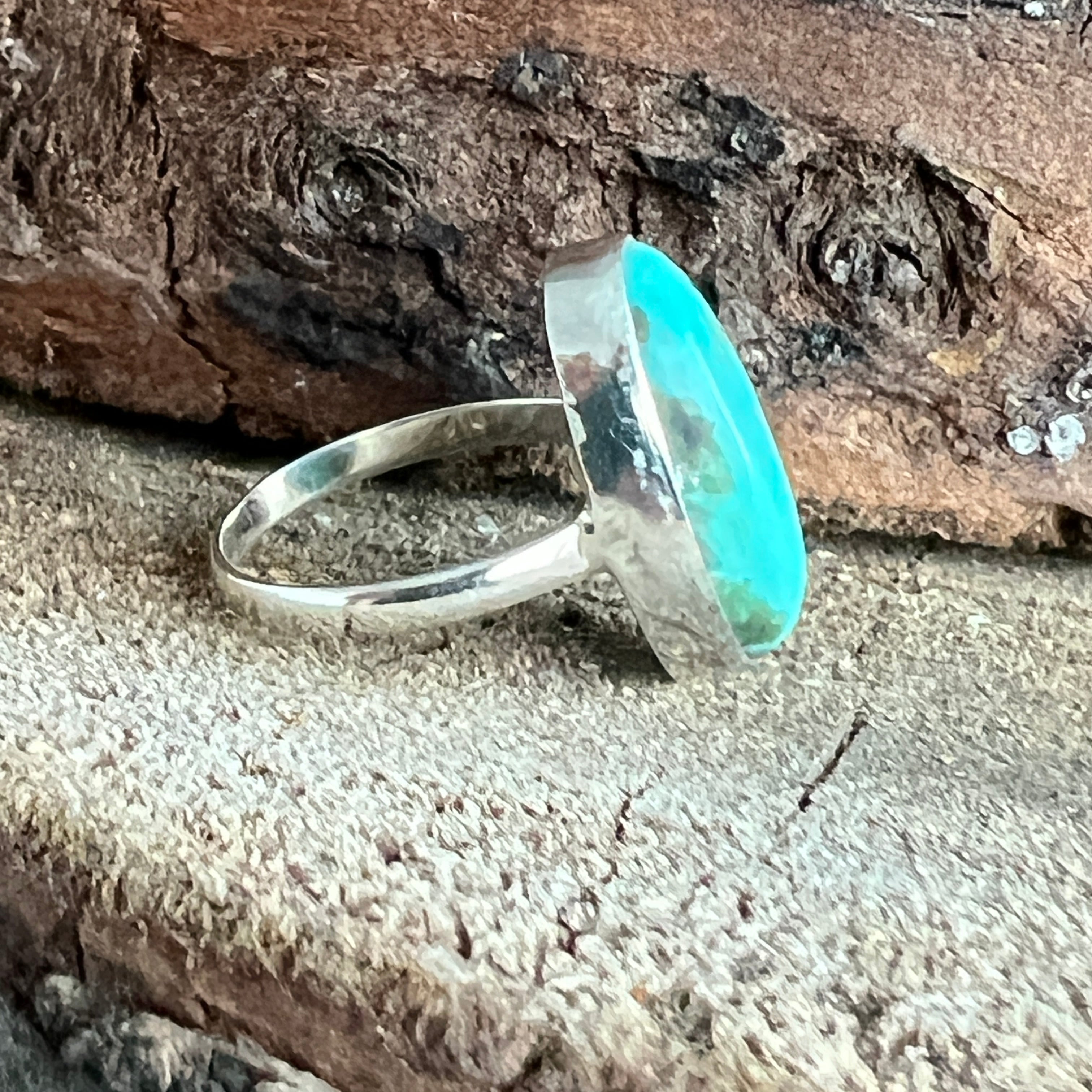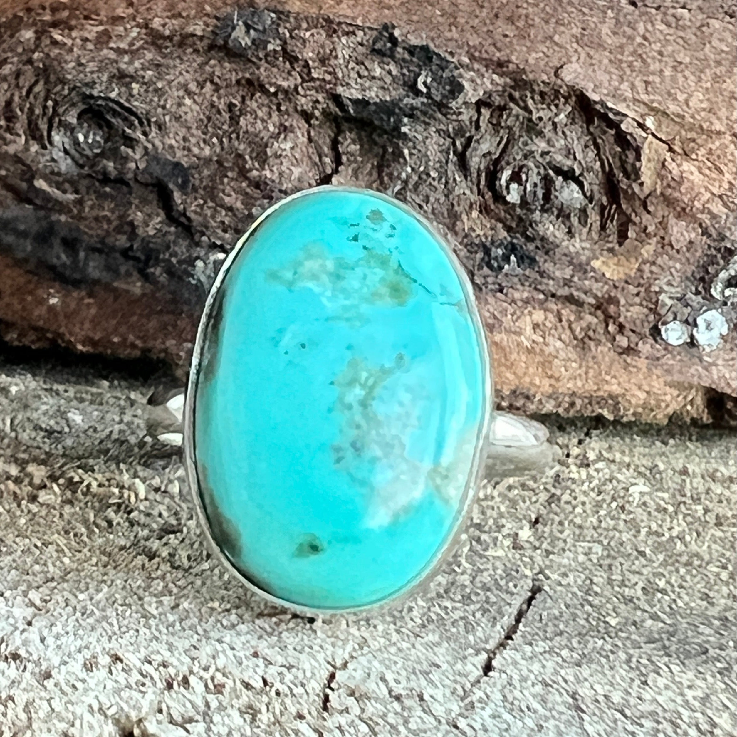 Un inel elegant din argint 925, cu o piatră naturală de turcoaz cu nuanțe variind între albastru cer și verde acvatic, străbătută de vene fine maronii și gri. Designul minimalist tip plain collet lasă întreaga atenție pietrei, punând în valoare frumusețea ei organică și textura autentică.