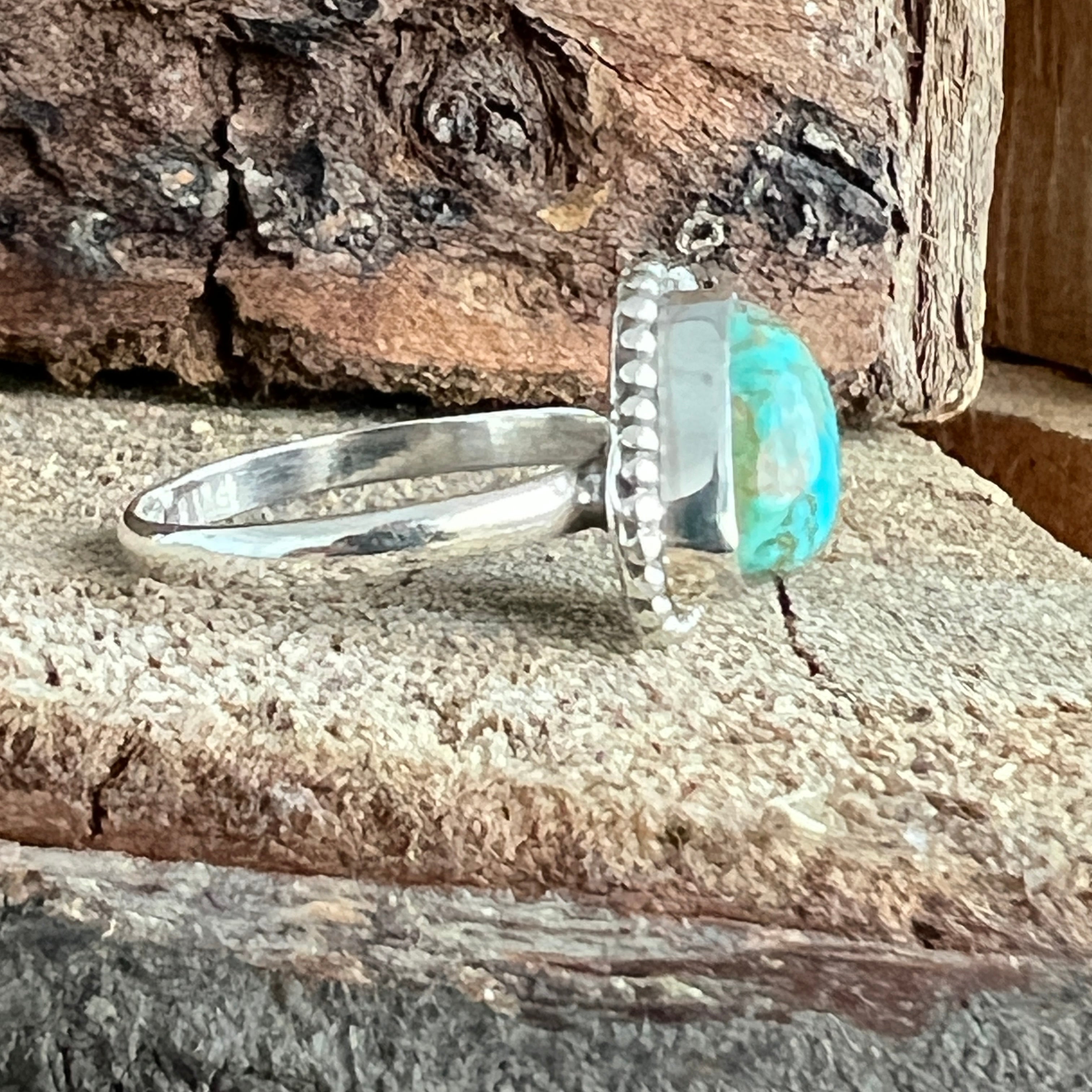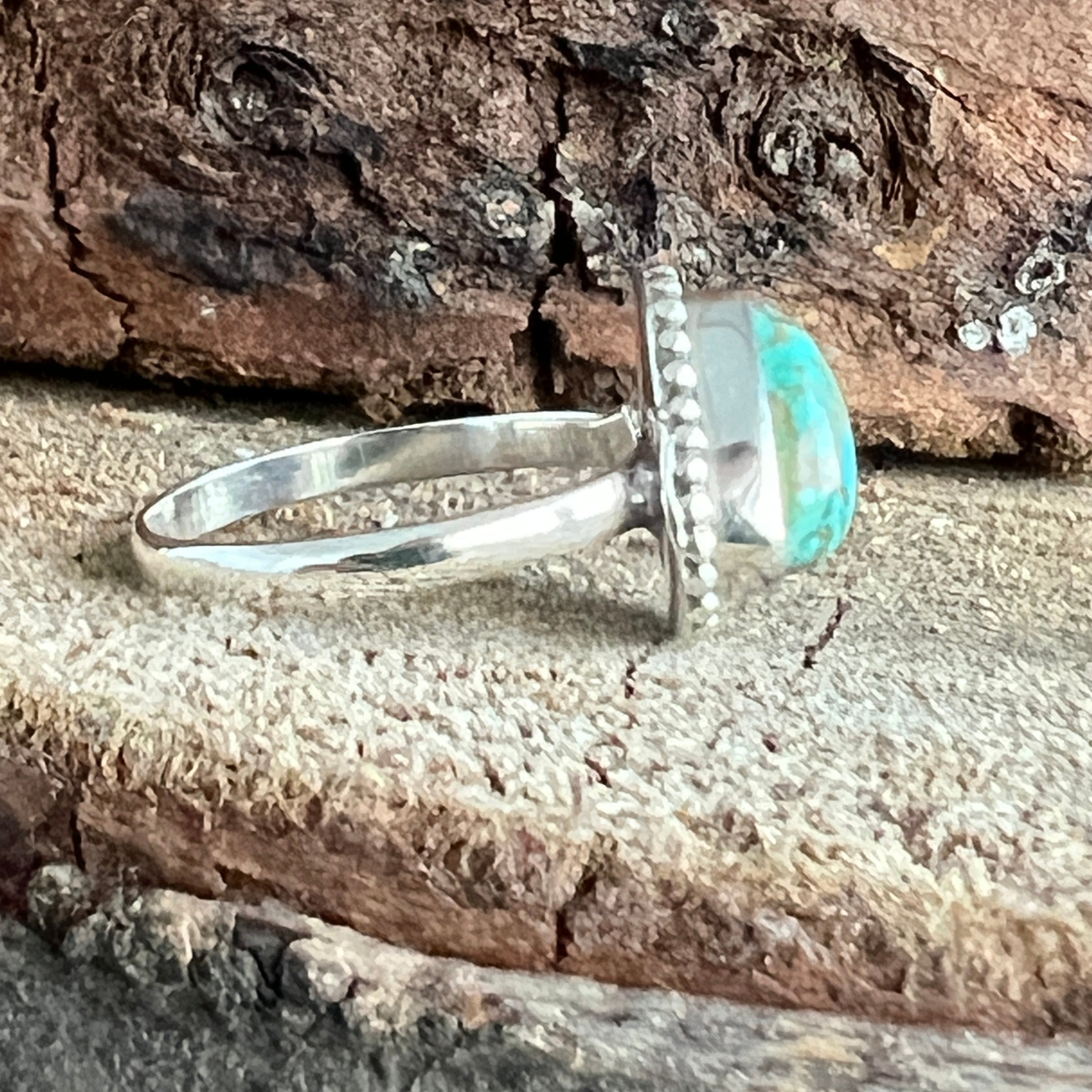 Un inel elegant din argint 925, cu o piatră naturală de turcoaz cu nuanțe variind între albastru cer și verde acvatic, străbătută de vene fine maronii și gri. Designul minimalist tip plain collet lasă întreaga atenție pietrei, punând în valoare frumusețea ei organică și textura autentică.