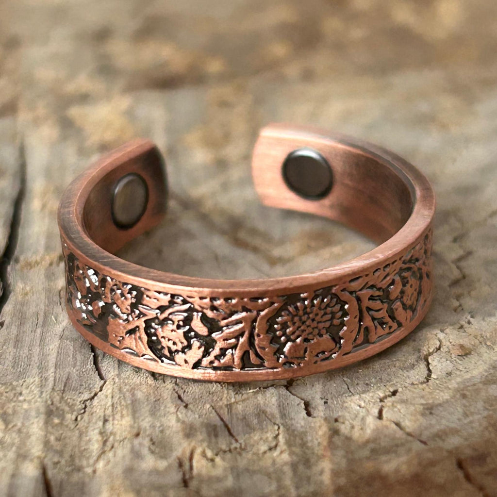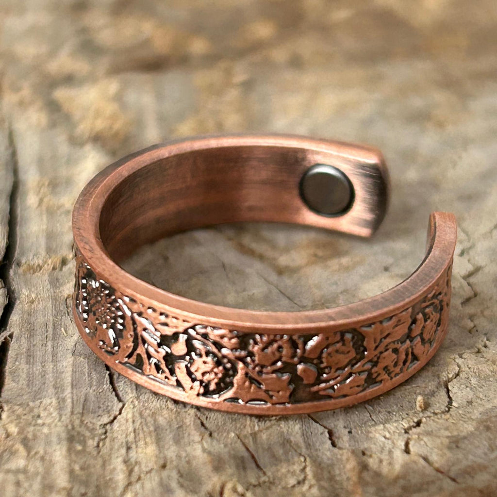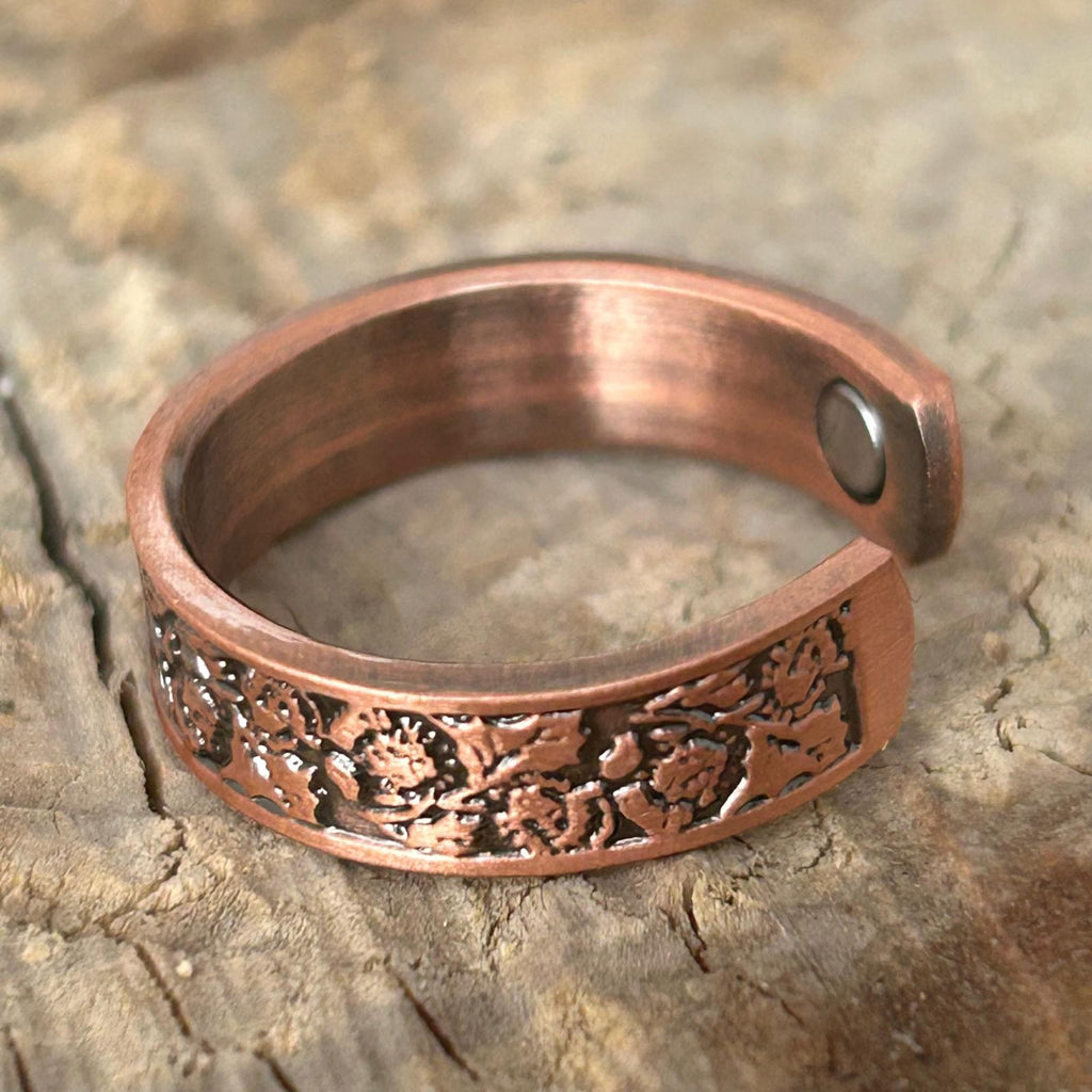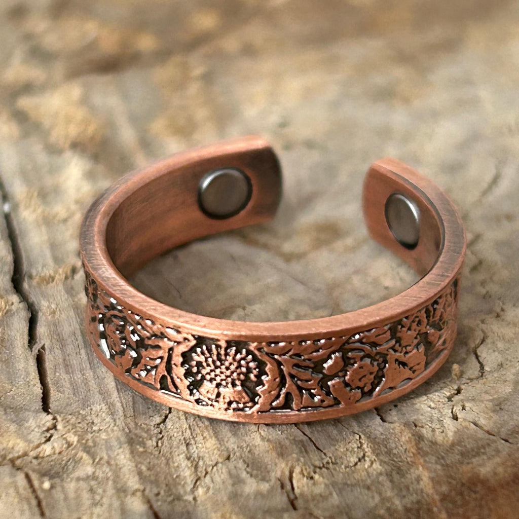 Cuprul, purtat din vechime ca metal protector și vindecător, este considerat un catalizator al energiei vitale și al echilibrului interior. În combinație cu forma ajustabilă, inelul devine nu doar o bijuterie, ci și un simbol al adaptabilității și al curgerii armonioase prin viață.