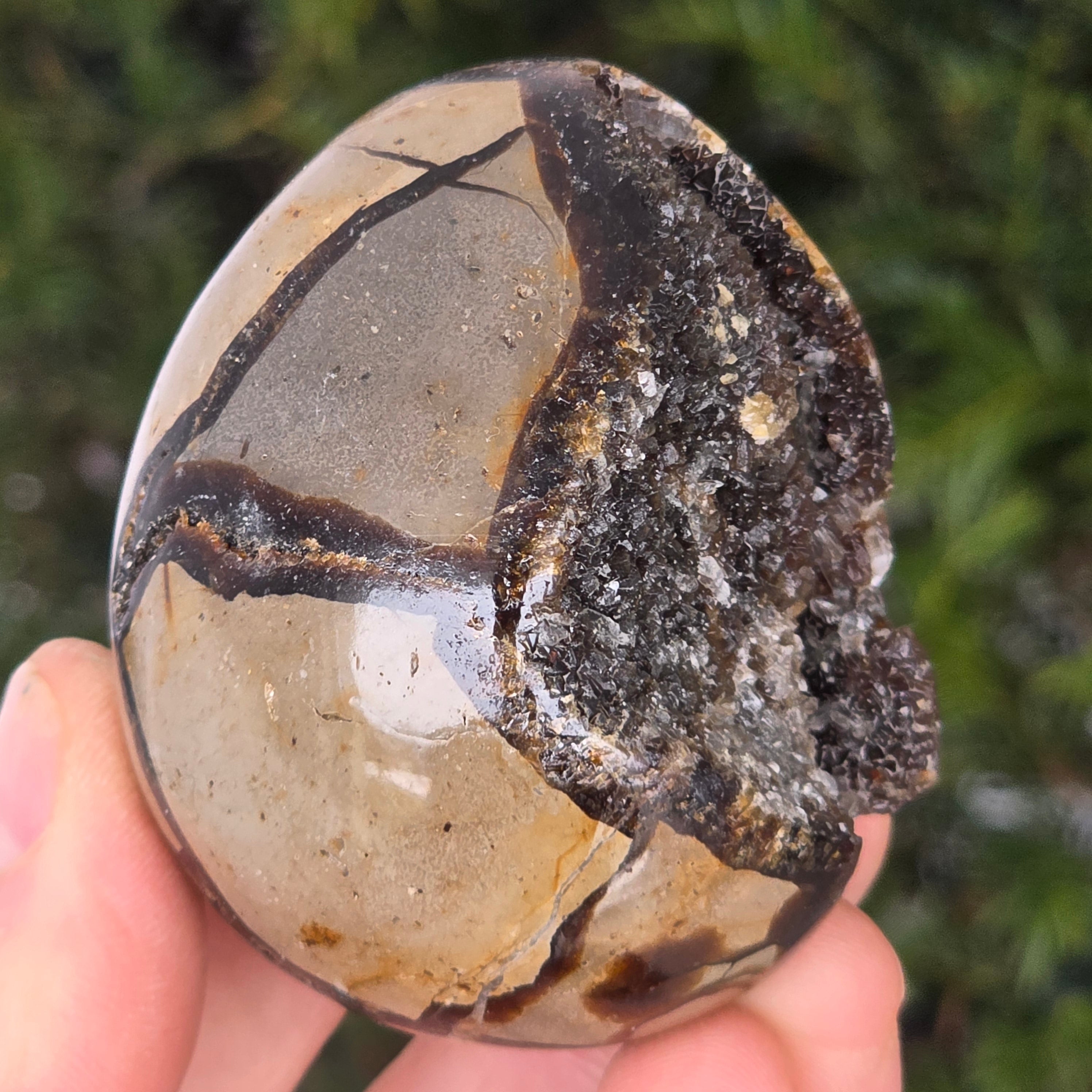 Το Septaria αποτελείται από ασβεστίτη, λιμονίτη, γύψο και βαρίτη, ορυκτά που σχηματίζουν ένα μοναδικό παιχνίδι σε αυτή την πέτρα και της δίνουν μια ιδιαίτερη εμφάνιση.