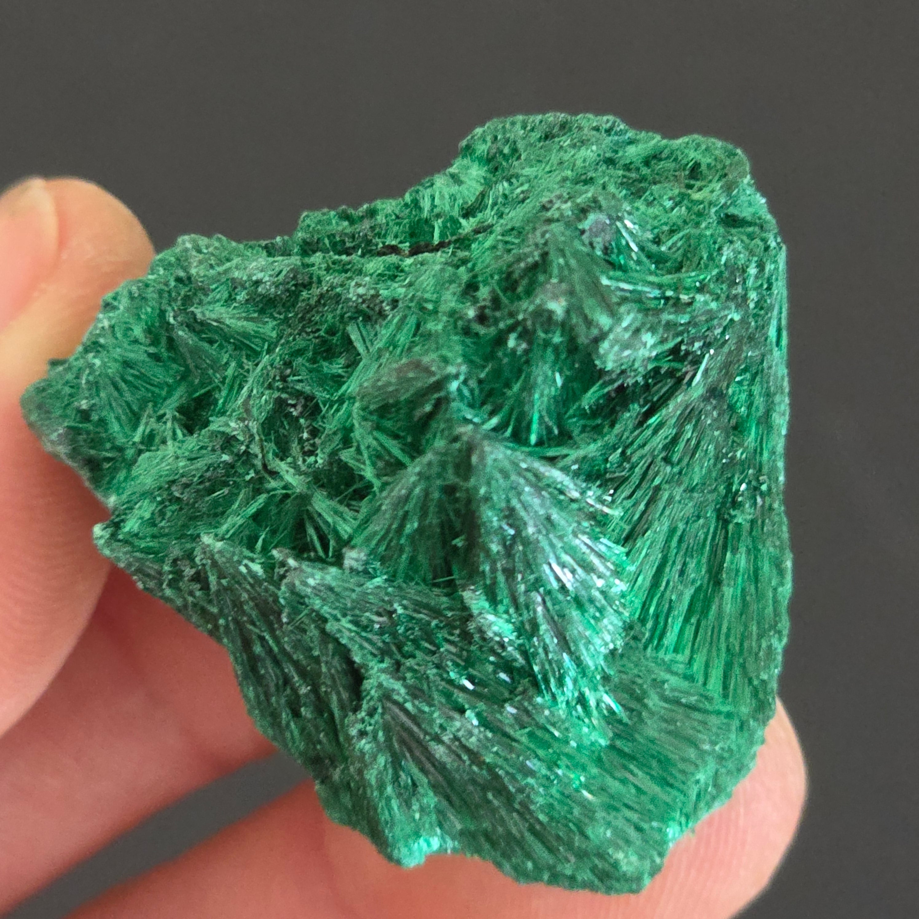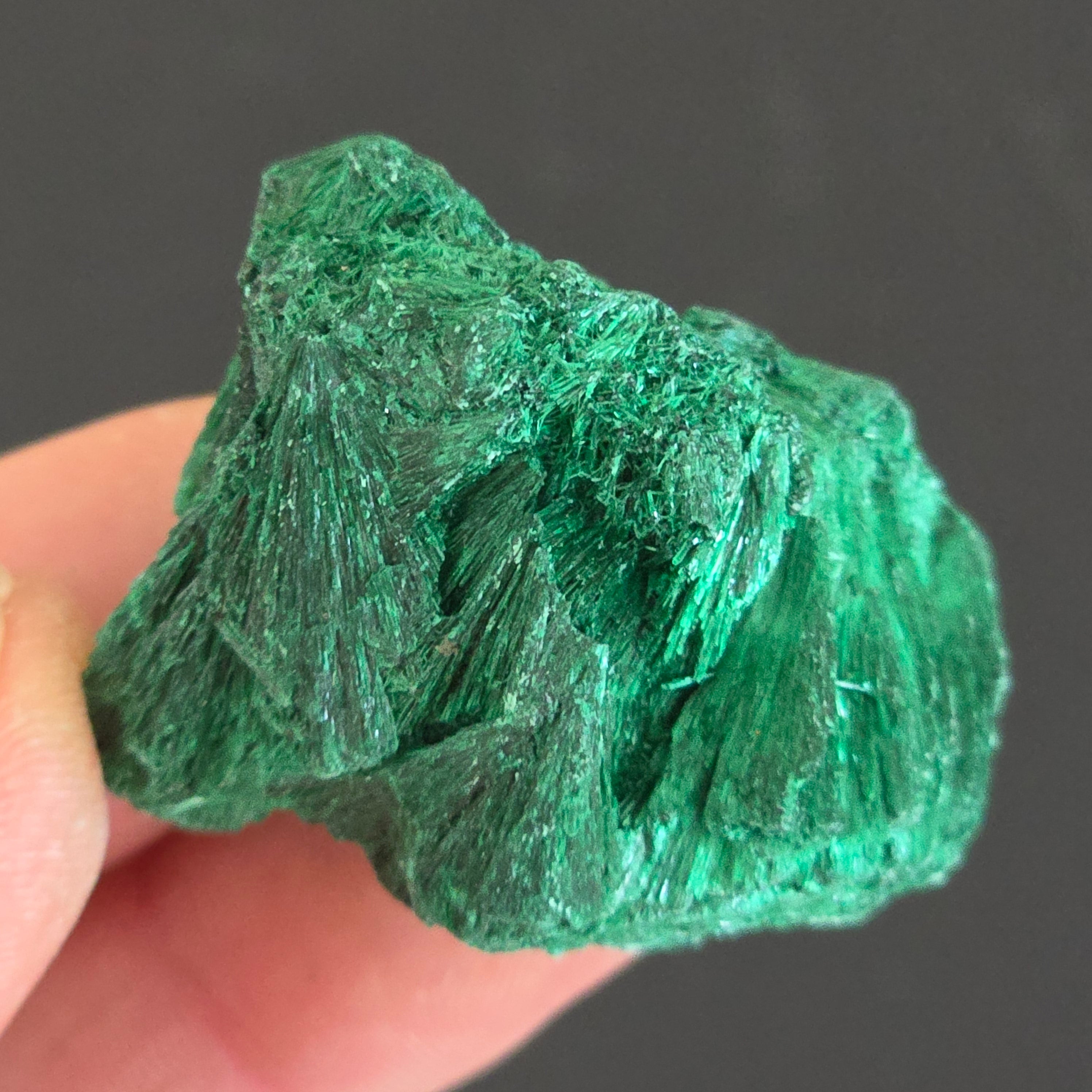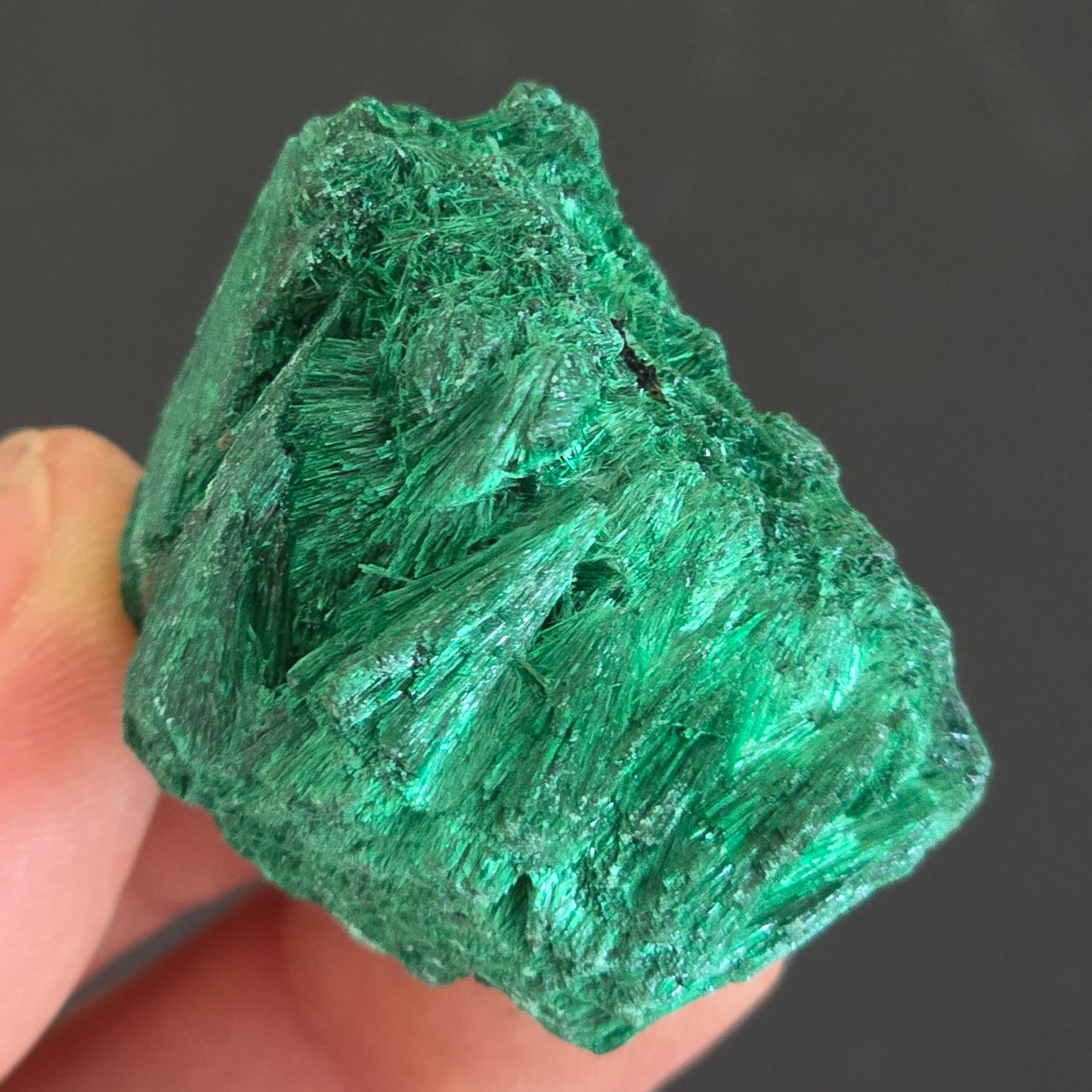 "Malachitul mătăsos" este o formă a pietrei semiprețioase malachit care prezintă o textură și un aspect mătăsos.