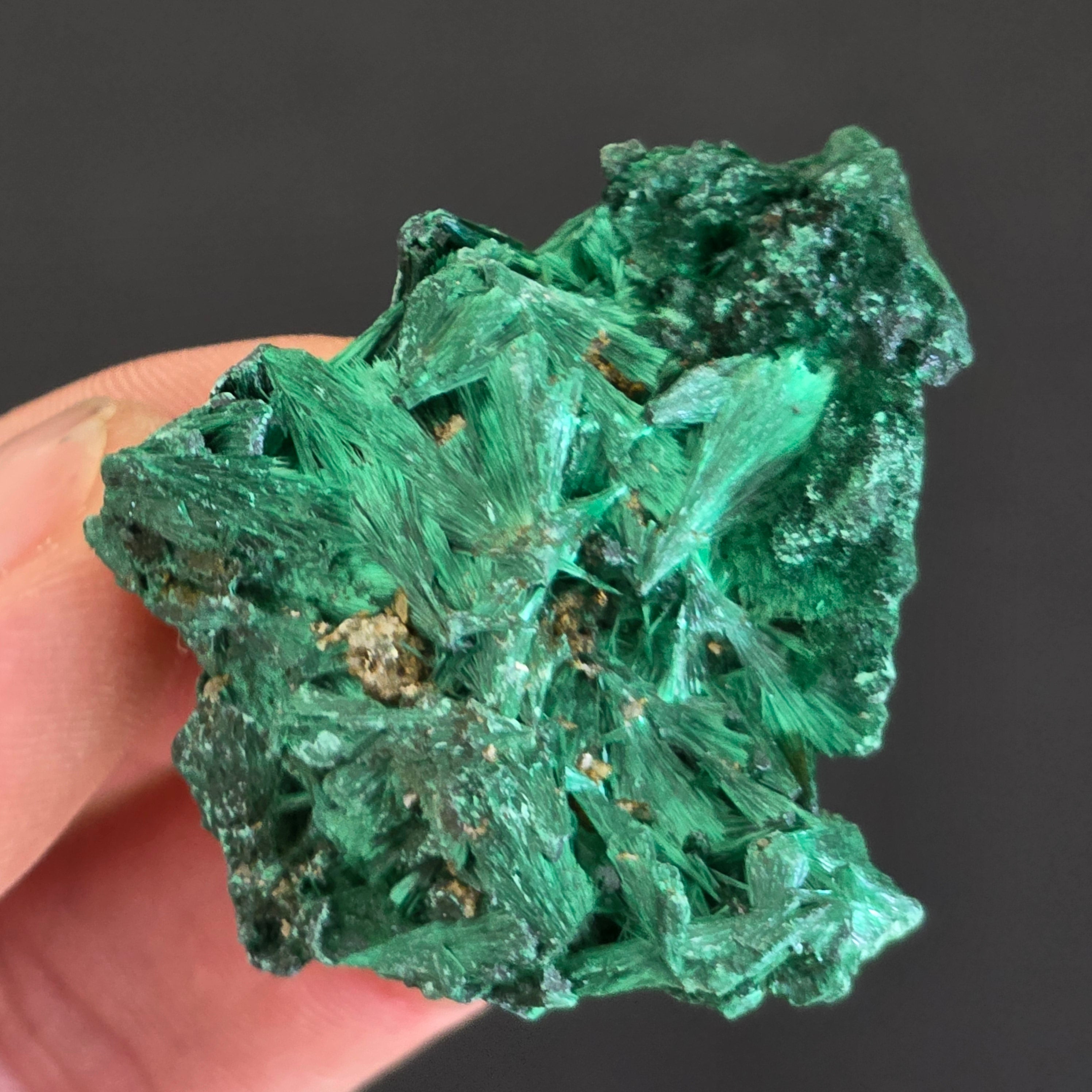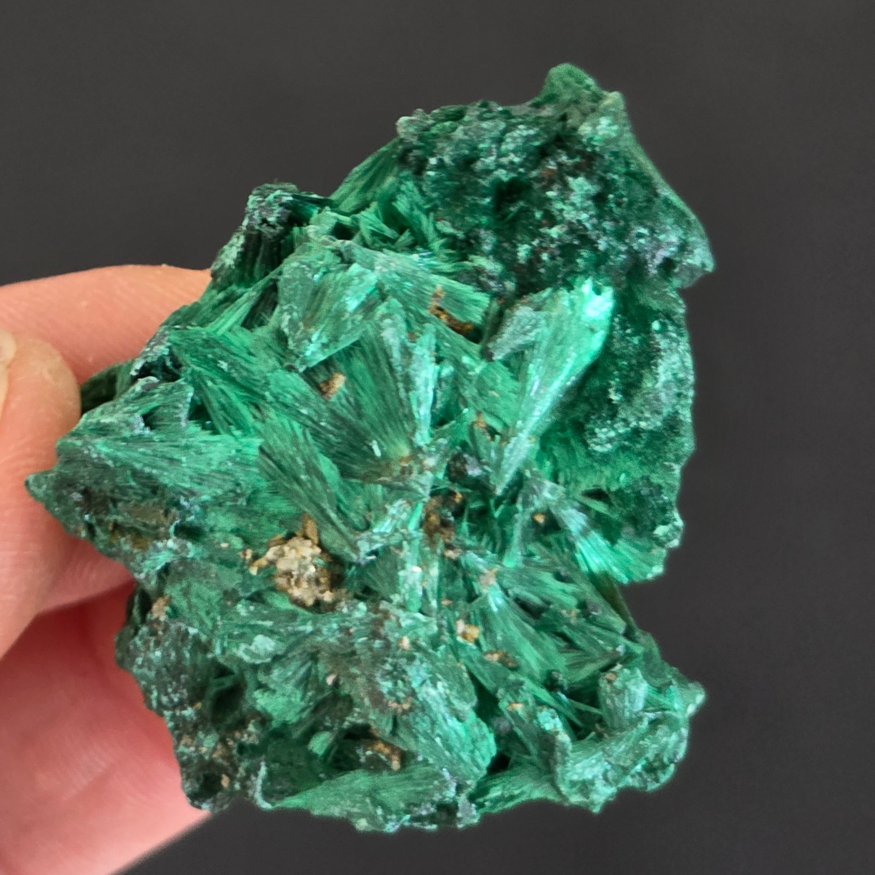 "Malachitul mătăsos" este o formă a pietrei semiprețioase malachit care prezintă o textură și un aspect mătăsos.