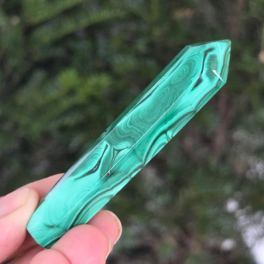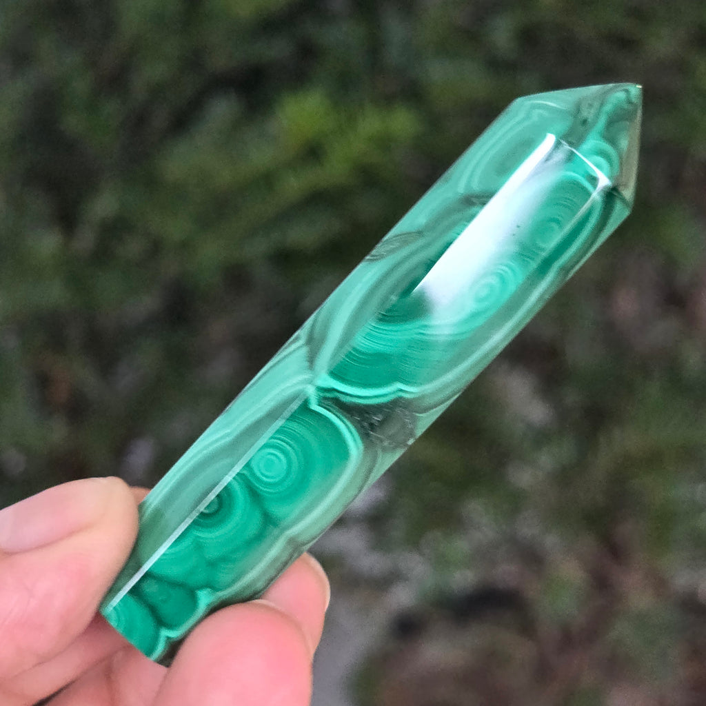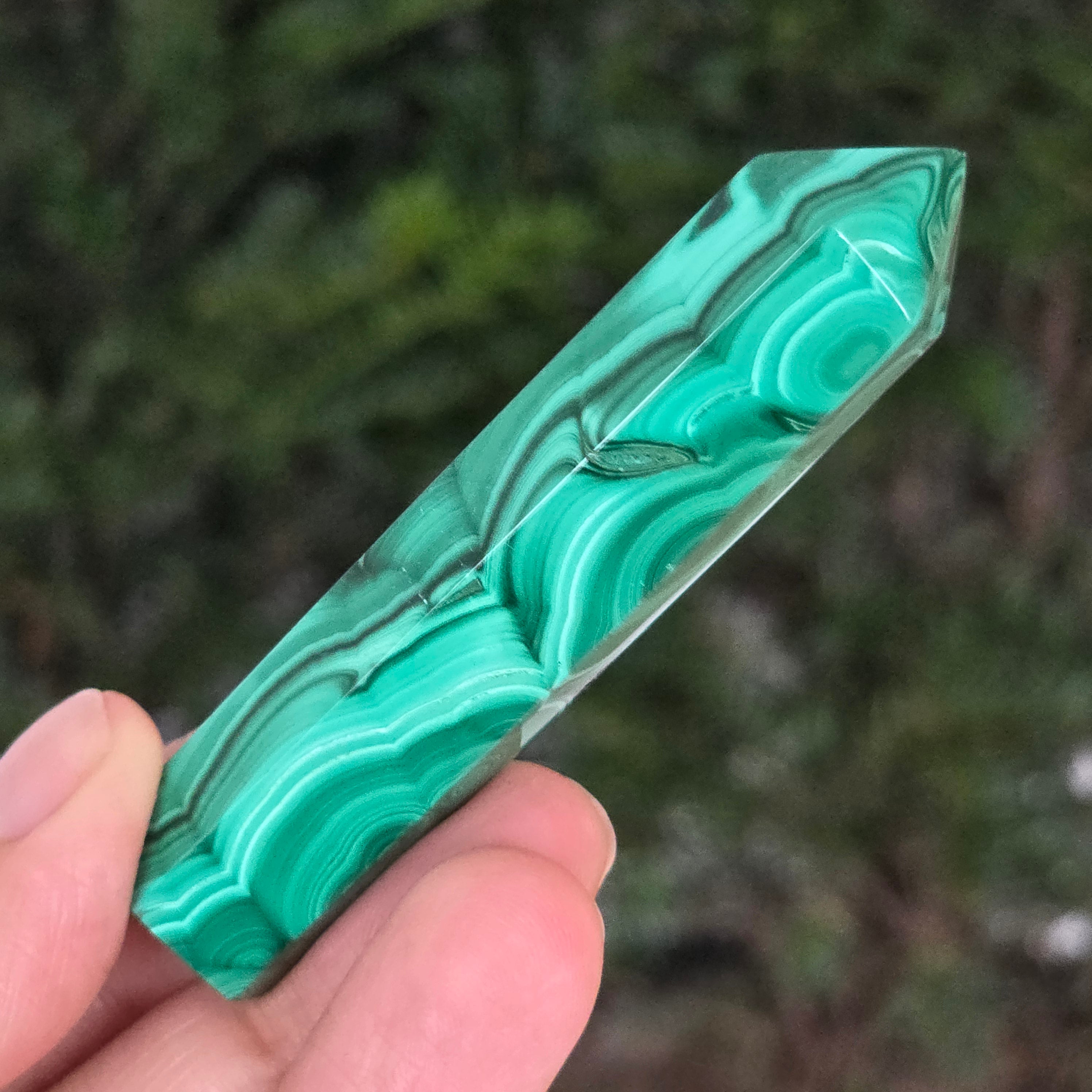 Un obelisc ce pare să fi prins viață din adâncurile verzi ale planetei. Această piesă unicat din malachit natural, dezvăluie straturi fascinante de verde smarald, verde închis și nuanțe mătăsoase de jad, dispuse în modele concentrice unice, ca niște hărți ale energiilor interioare. Polişat manual până la o strălucire catifelată, obeliscul emană o eleganță minerală profundă.