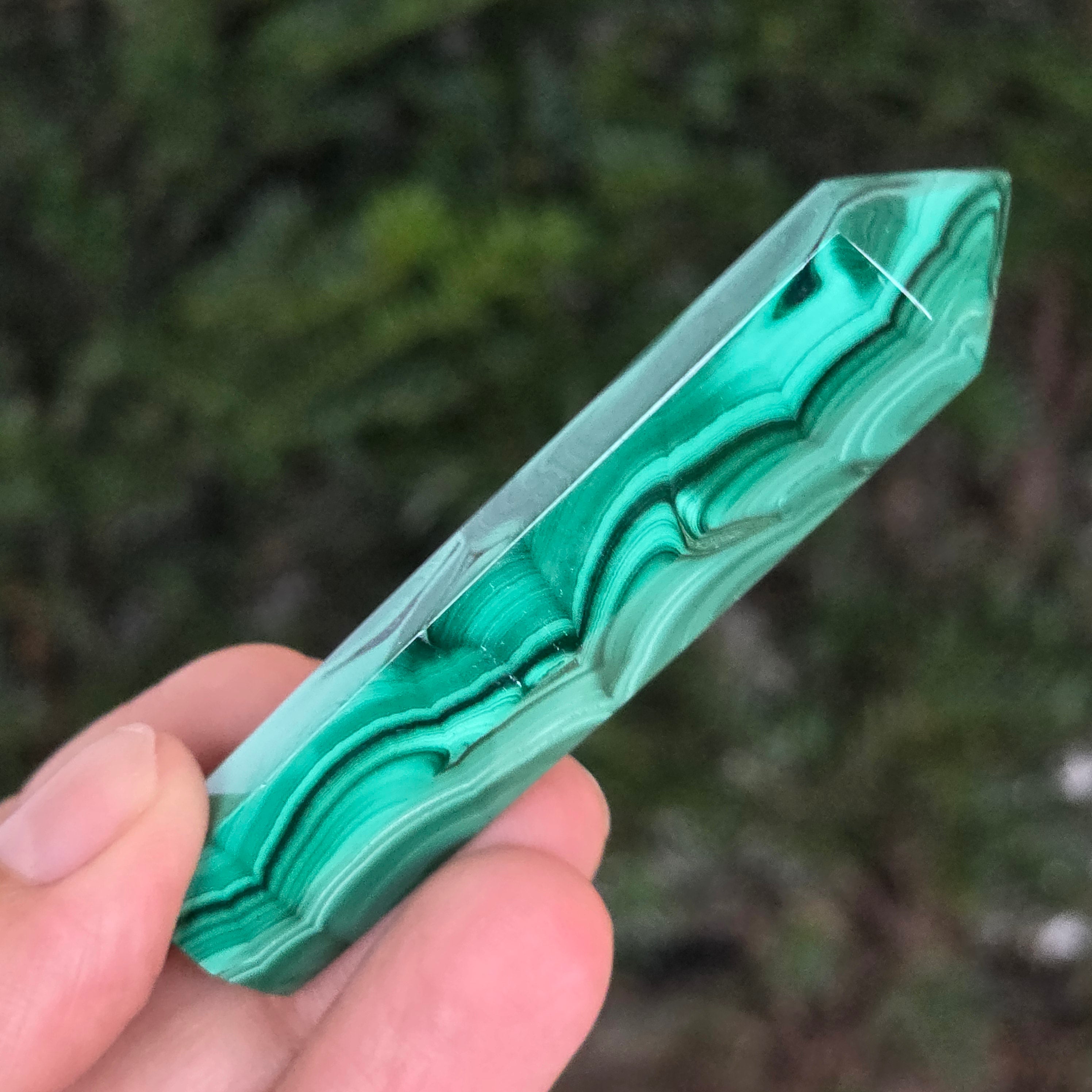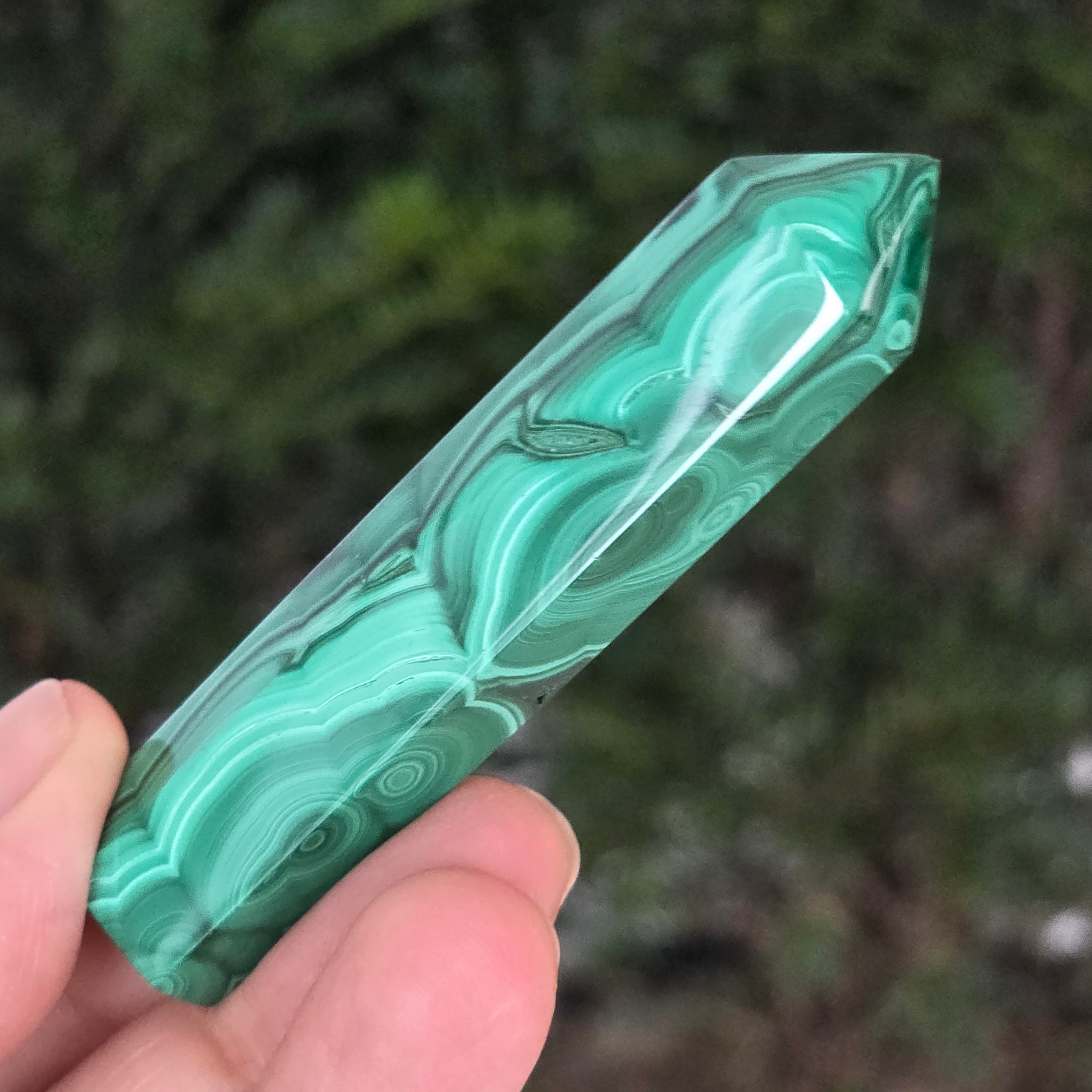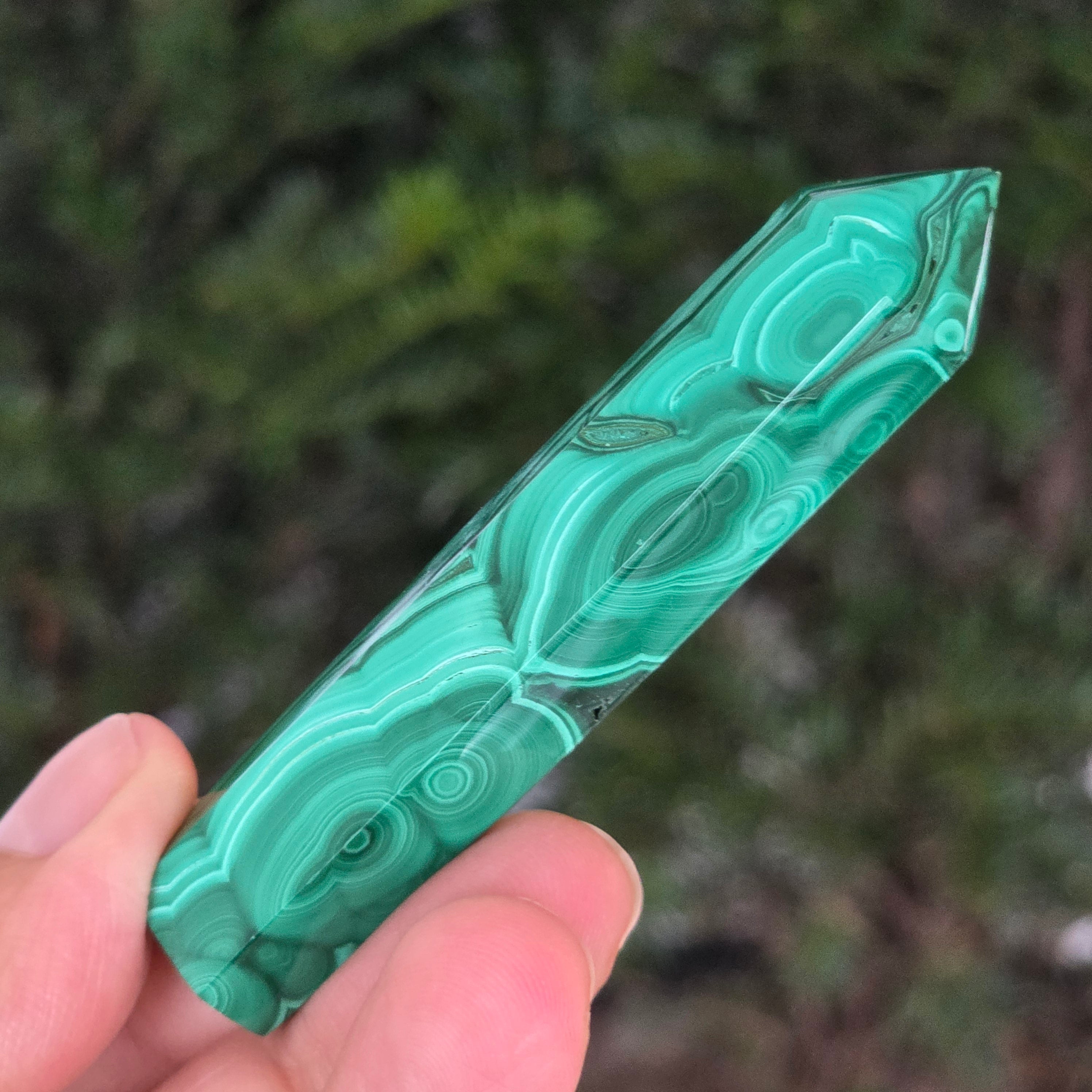 Un obelisc ce pare să fi prins viață din adâncurile verzi ale planetei. Această piesă unicat din malachit natural, dezvăluie straturi fascinante de verde smarald, verde închis și nuanțe mătăsoase de jad, dispuse în modele concentrice unice, ca niște hărți ale energiilor interioare. Polişat manual până la o strălucire catifelată, obeliscul emană o eleganță minerală profundă.