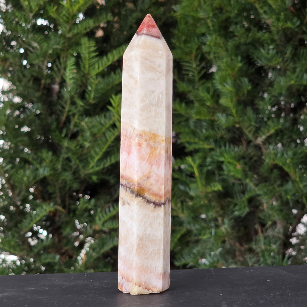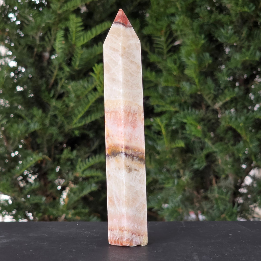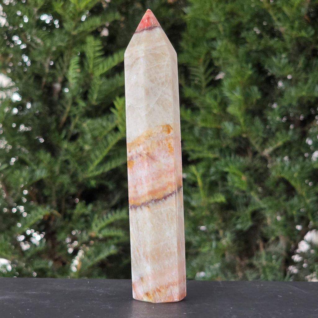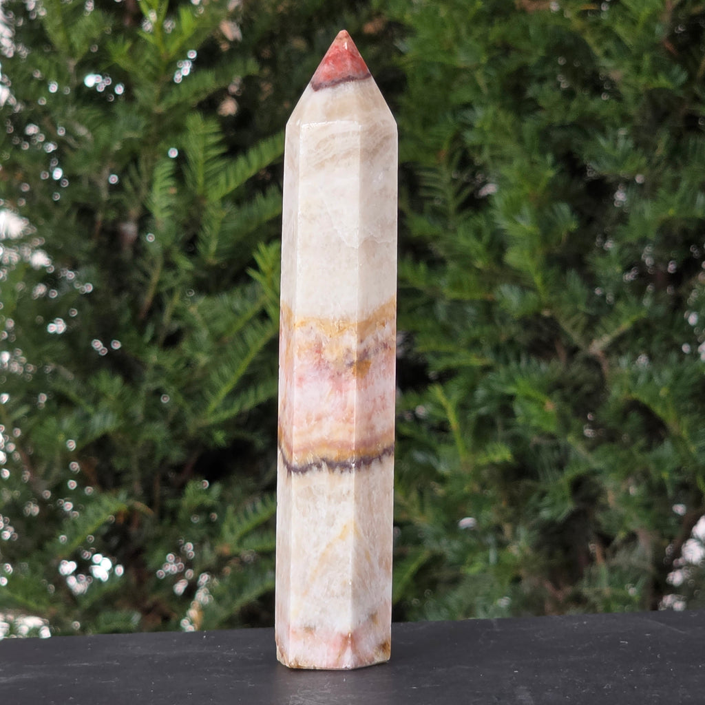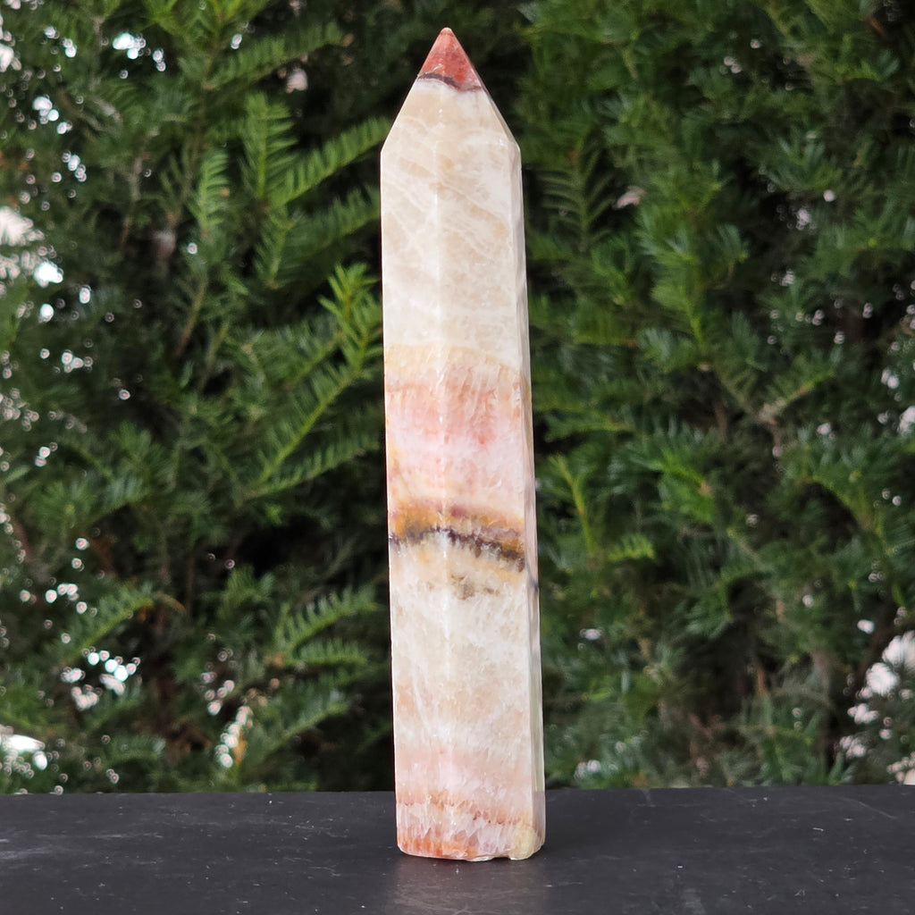 Această piatră fascinantă îmbină onixul portocaliu cu vene delicate de calcit, în straturi care par pictate de timp. Nuanțele vibrante de portocaliu, miere și chihlimbar pulsează cu energia vieții și aduc o notă de vitalitate oricărui spațiu. Este o piesă care trezește simțurile și inspiră creativitatea, dar păstrează în același timp un echilibru profund, ancorat în energia pământului.