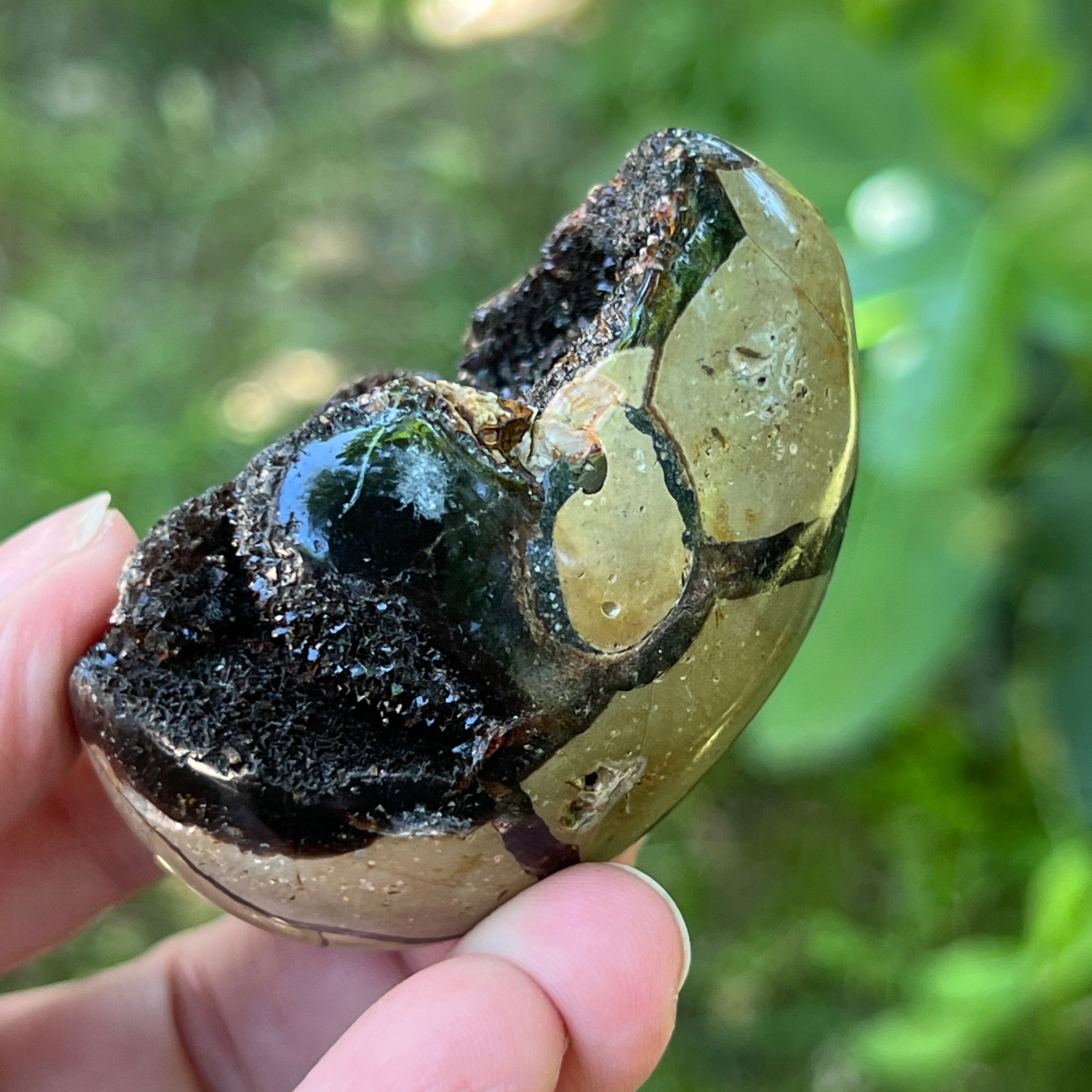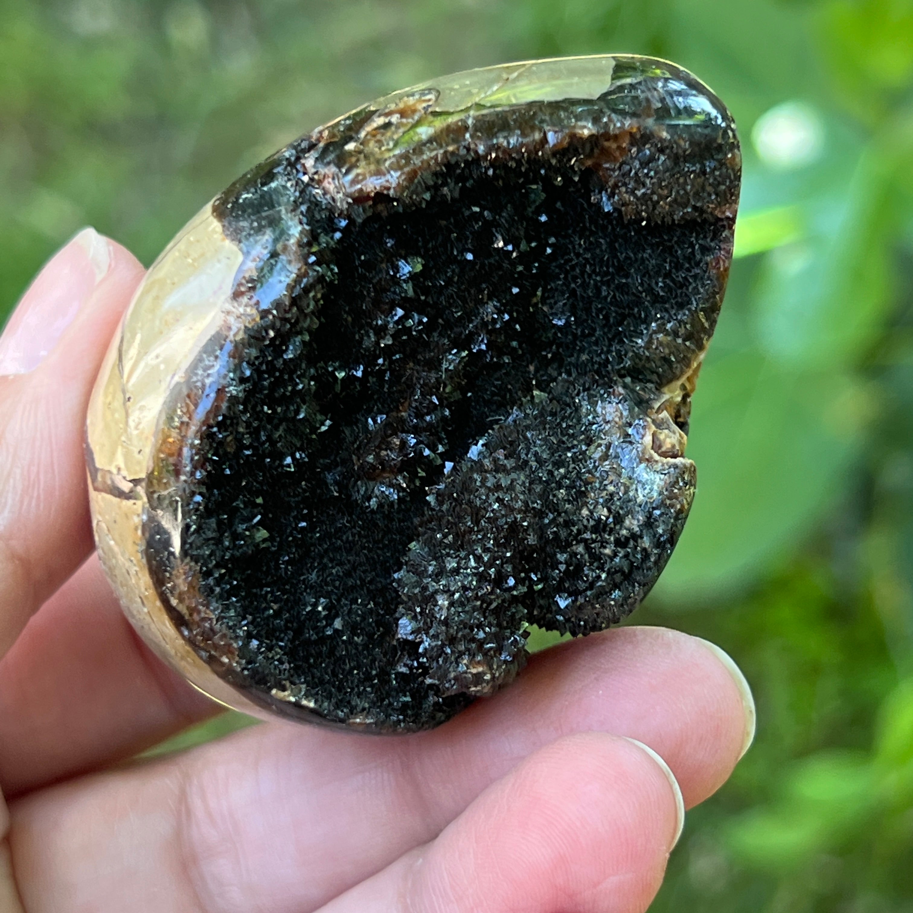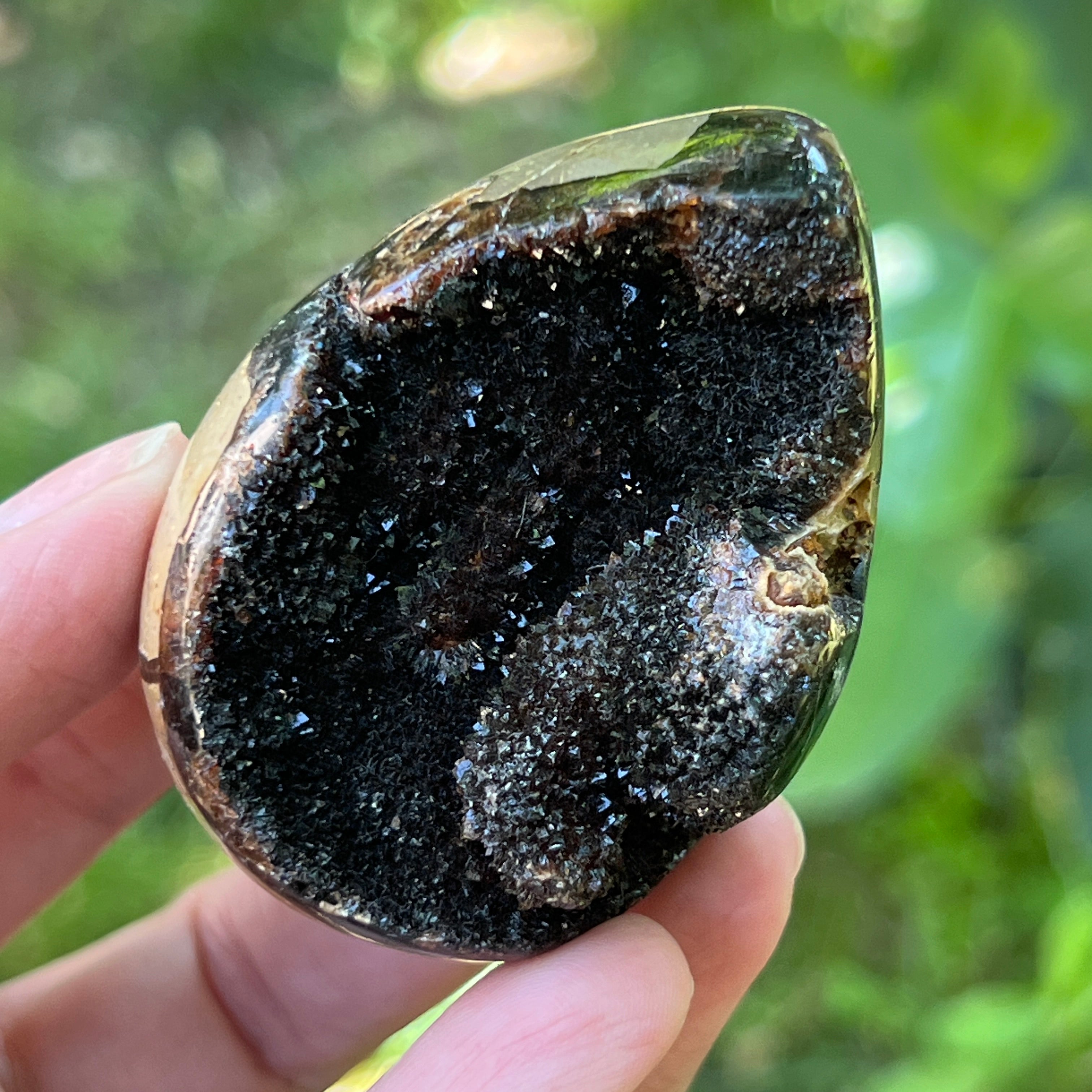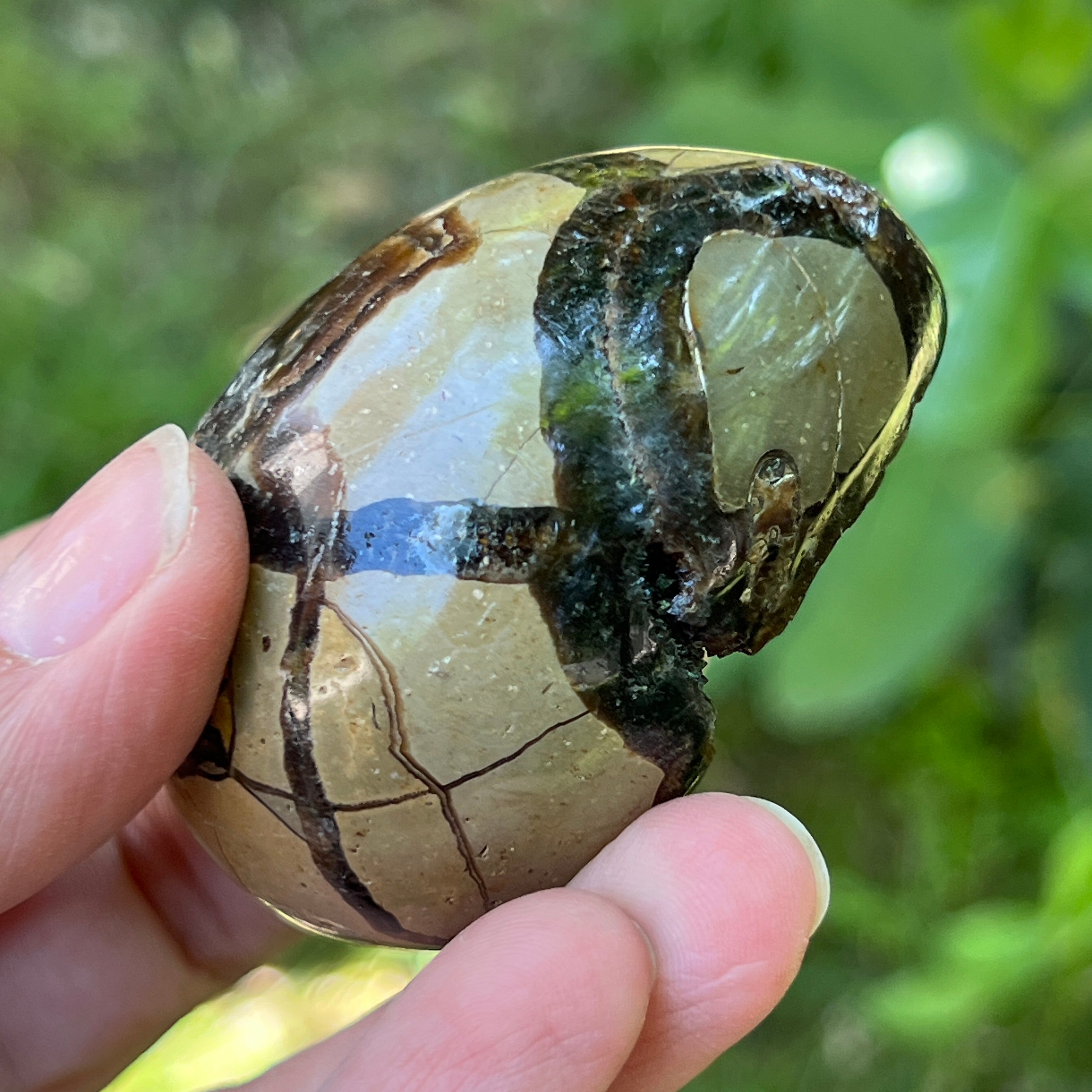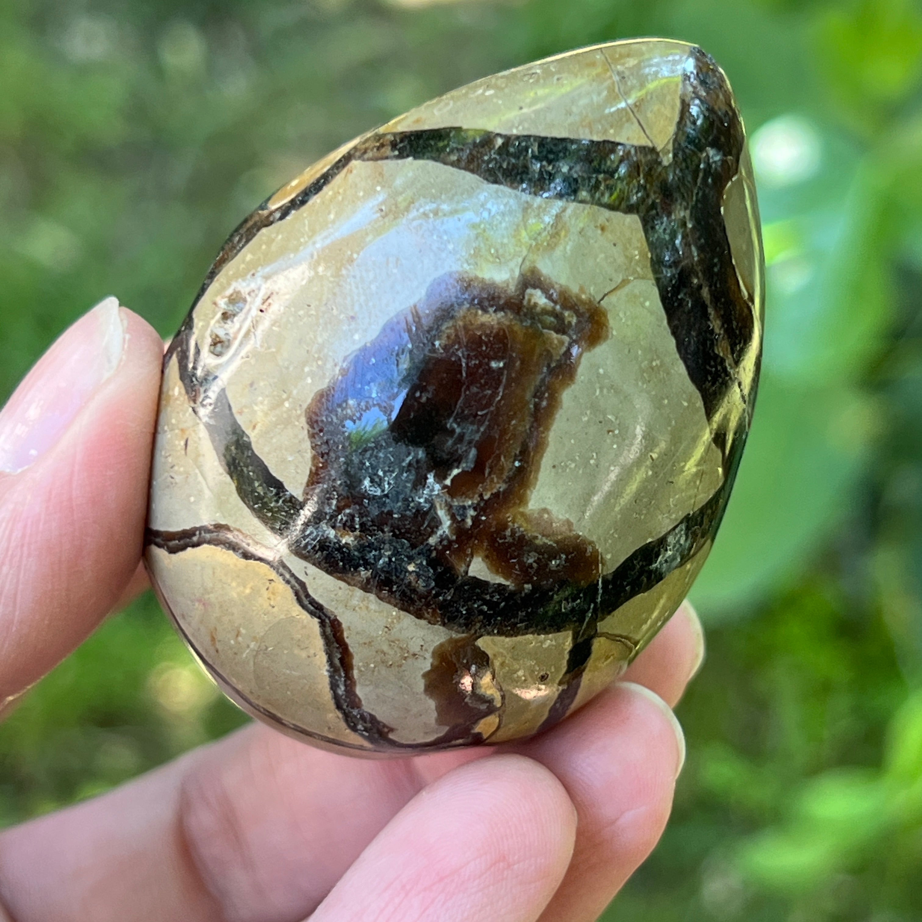 Το Septaria αποτελείται από ασβεστίτη, λιμονίτη, γύψο και βαριτίνη, ορυκτά που σχηματίζουν ένα μοναδικό παιχνίδι σε αυτή την πέτρα και δίνουν μια ιδιαίτερη εμφάνιση.