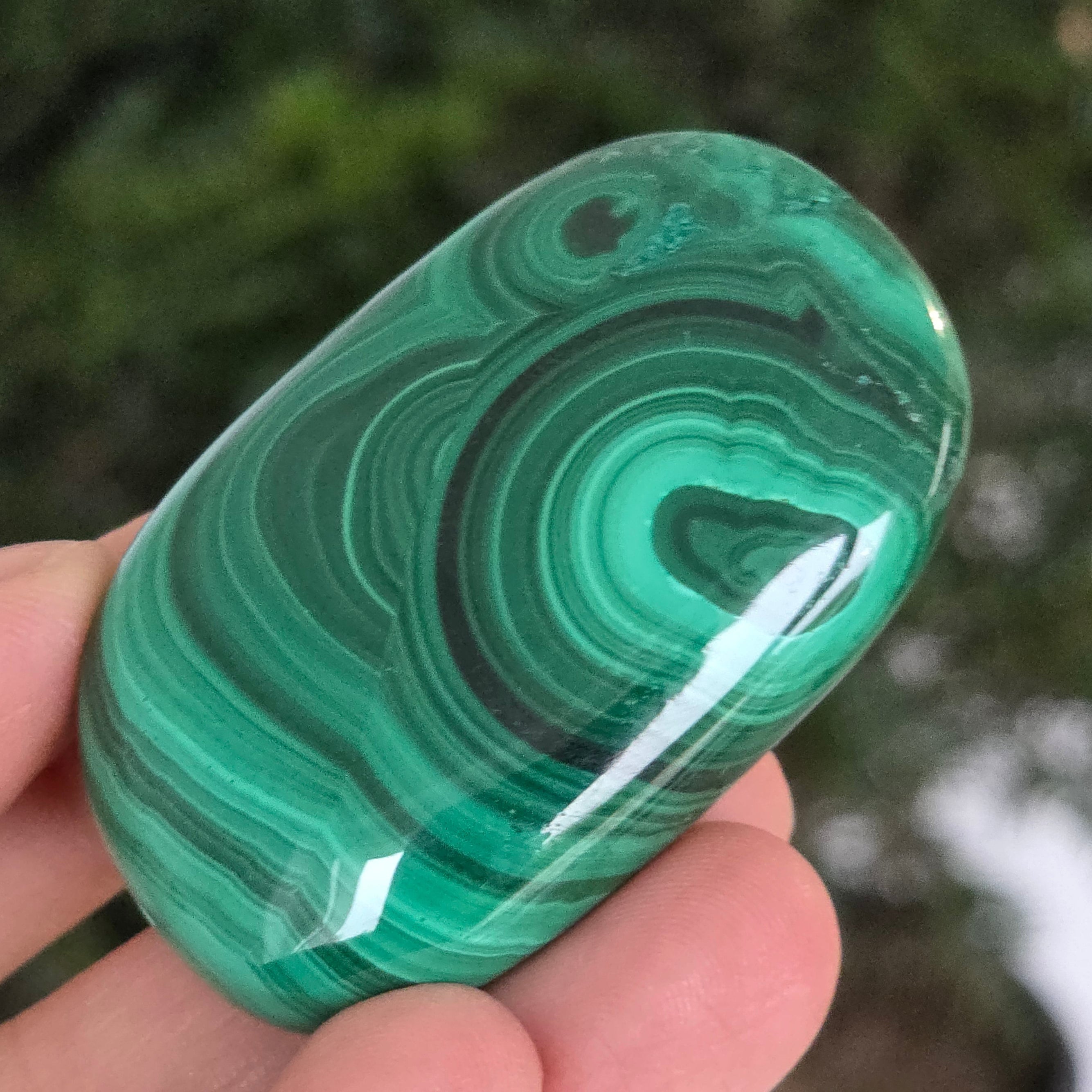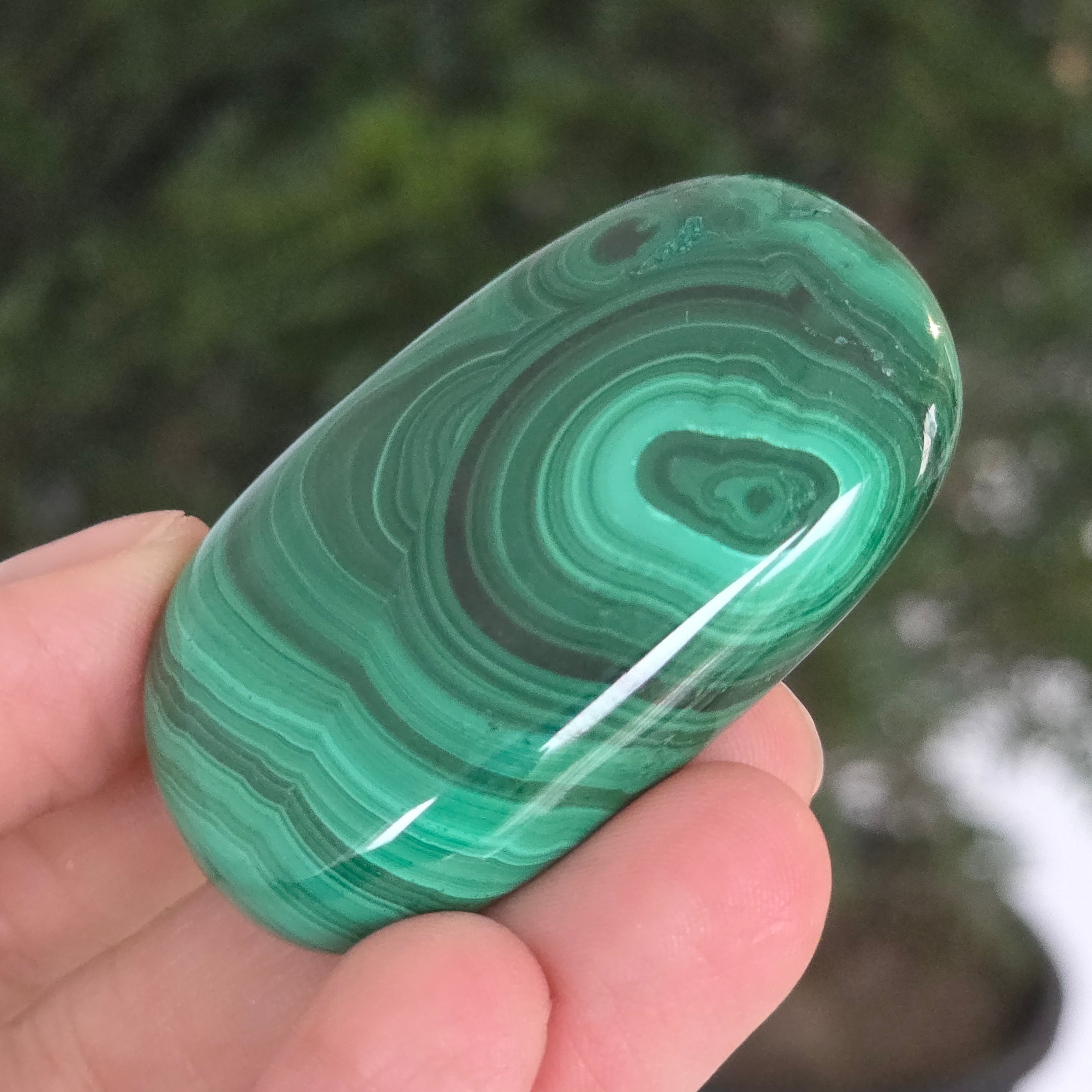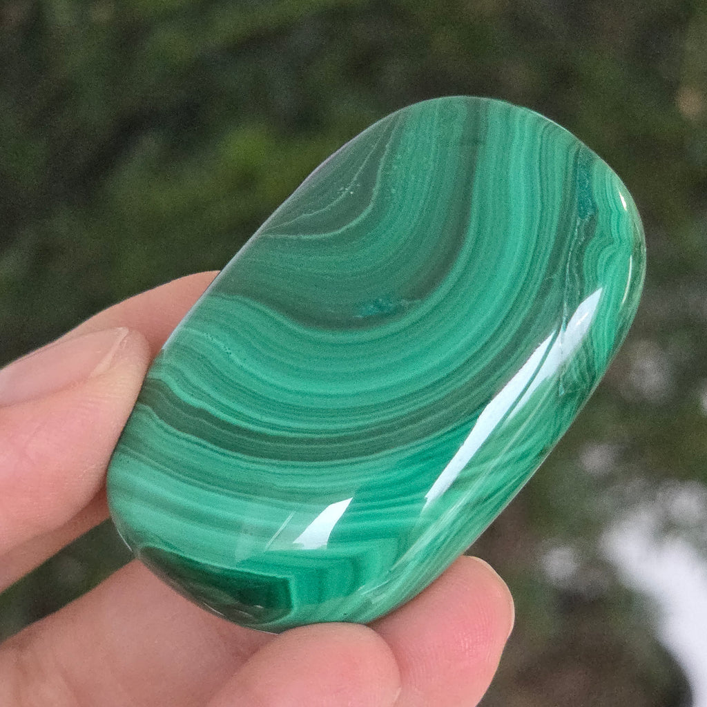 Un palmstone care pare să respire cu energia Pământului viu. Această piesă unicat din malachit natural, dezvăluie ondulații hipnotice de verde intens și smarald, traversate de inele și benzi concentrice ce par sculptate de însăși natura. Textura netedă, perfect șlefuită, face ca piatra să se așeze plăcut în palmă, emanând o vibrație caldă și protectoare.