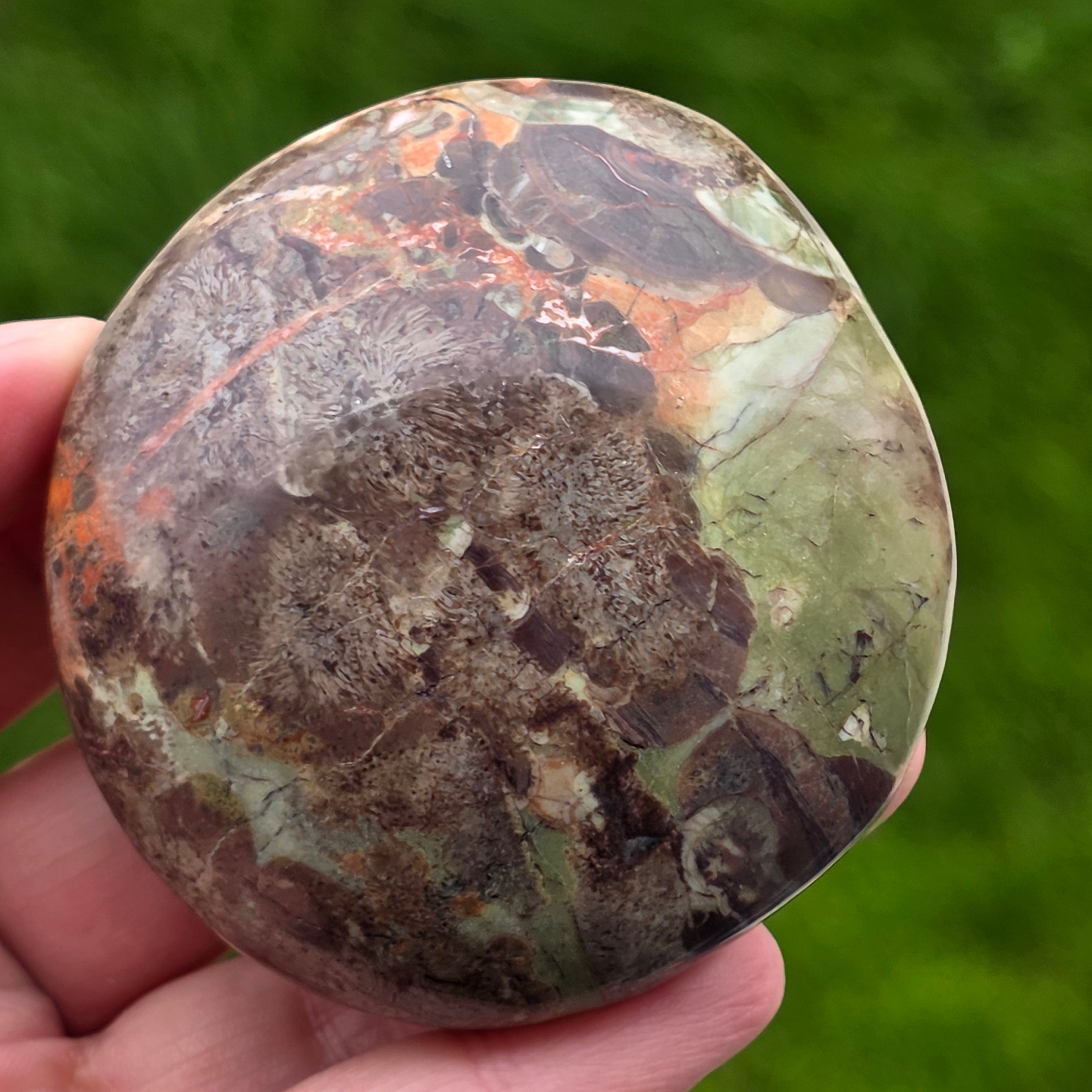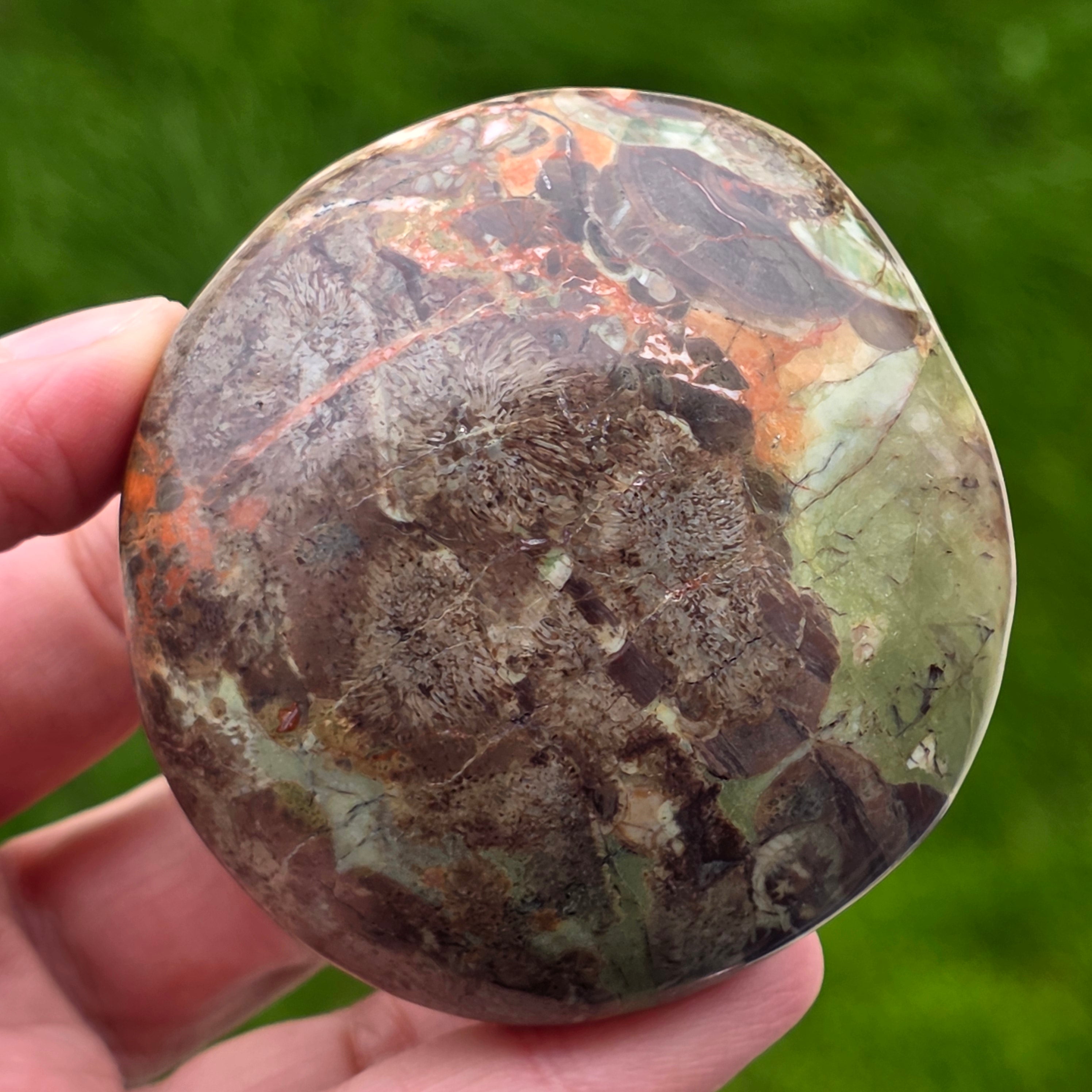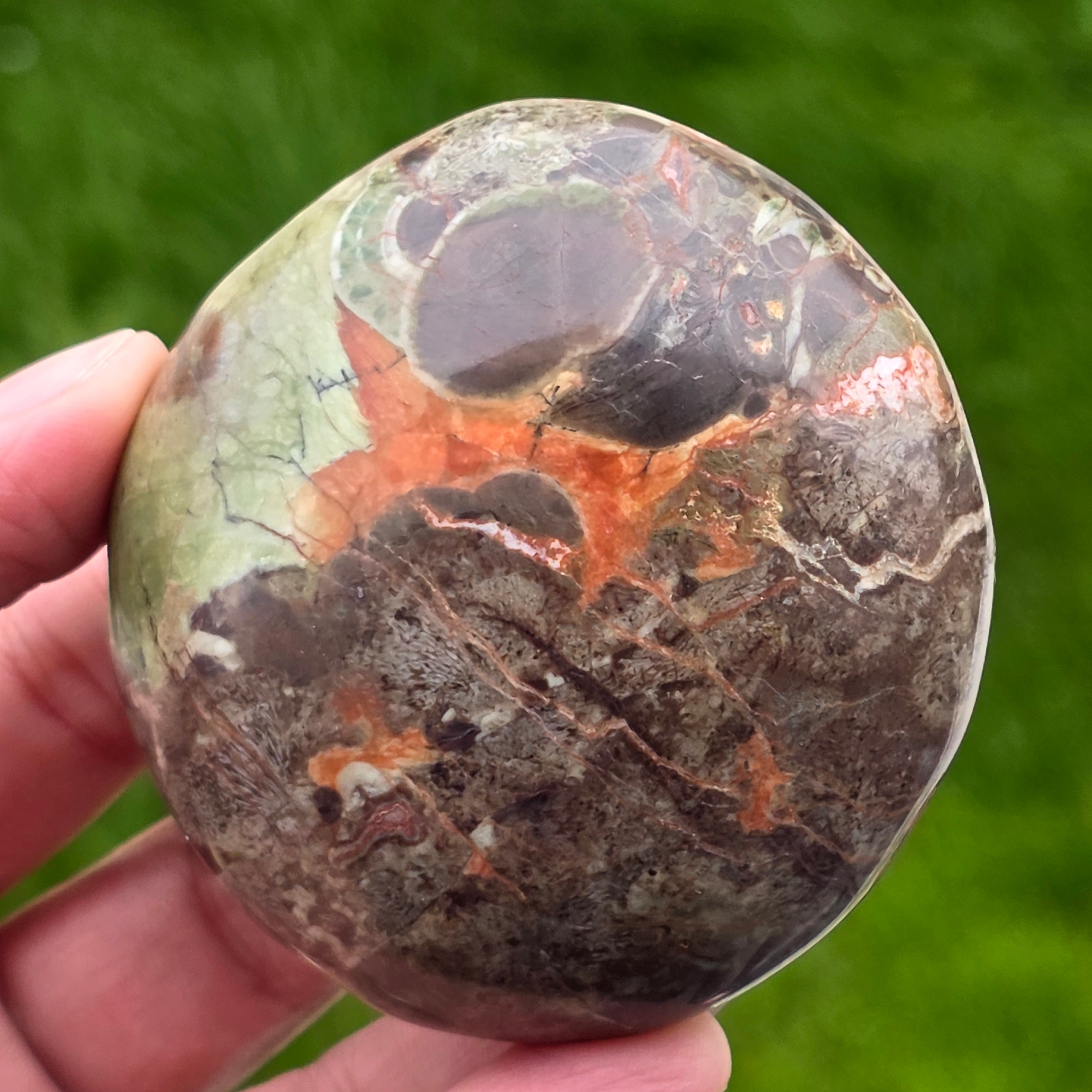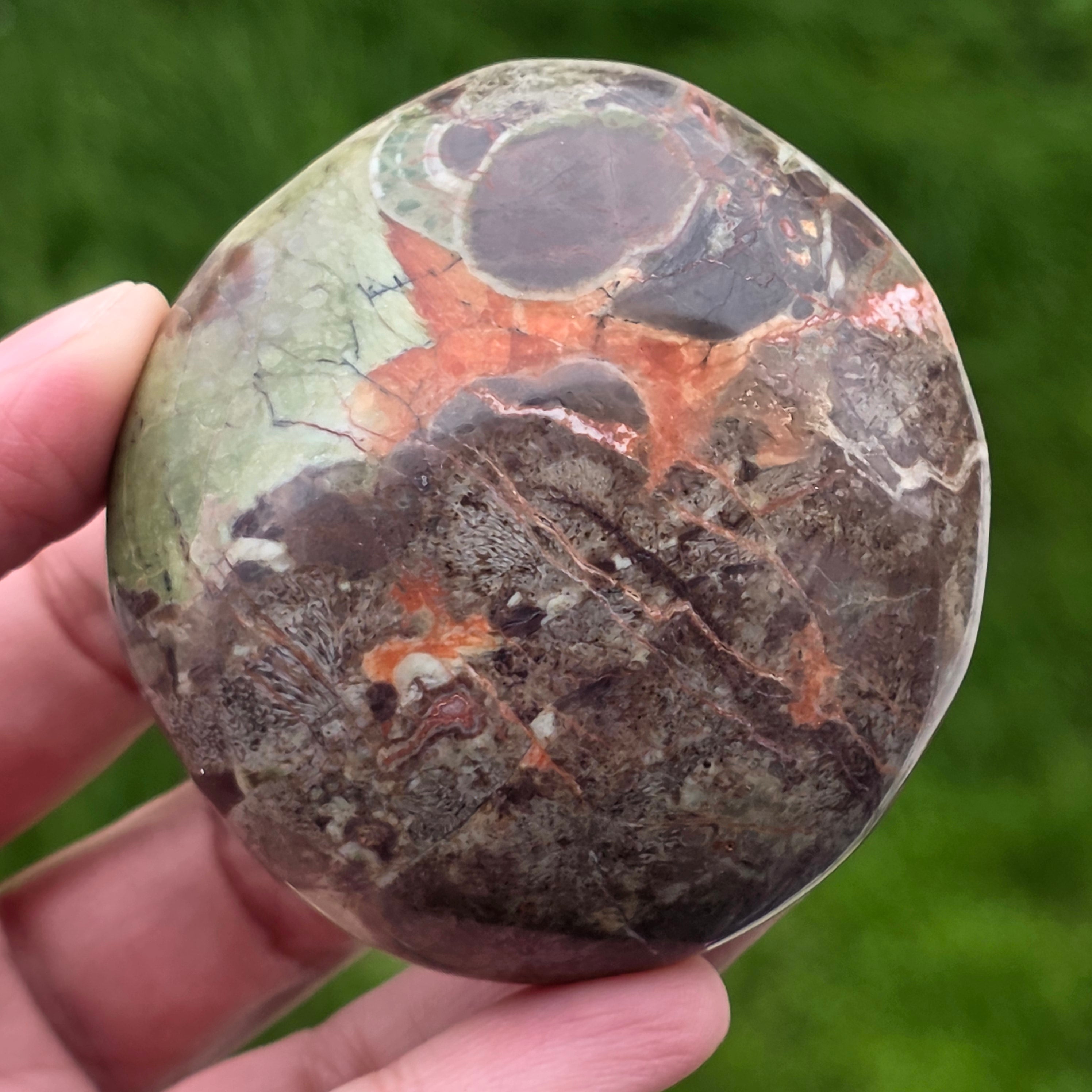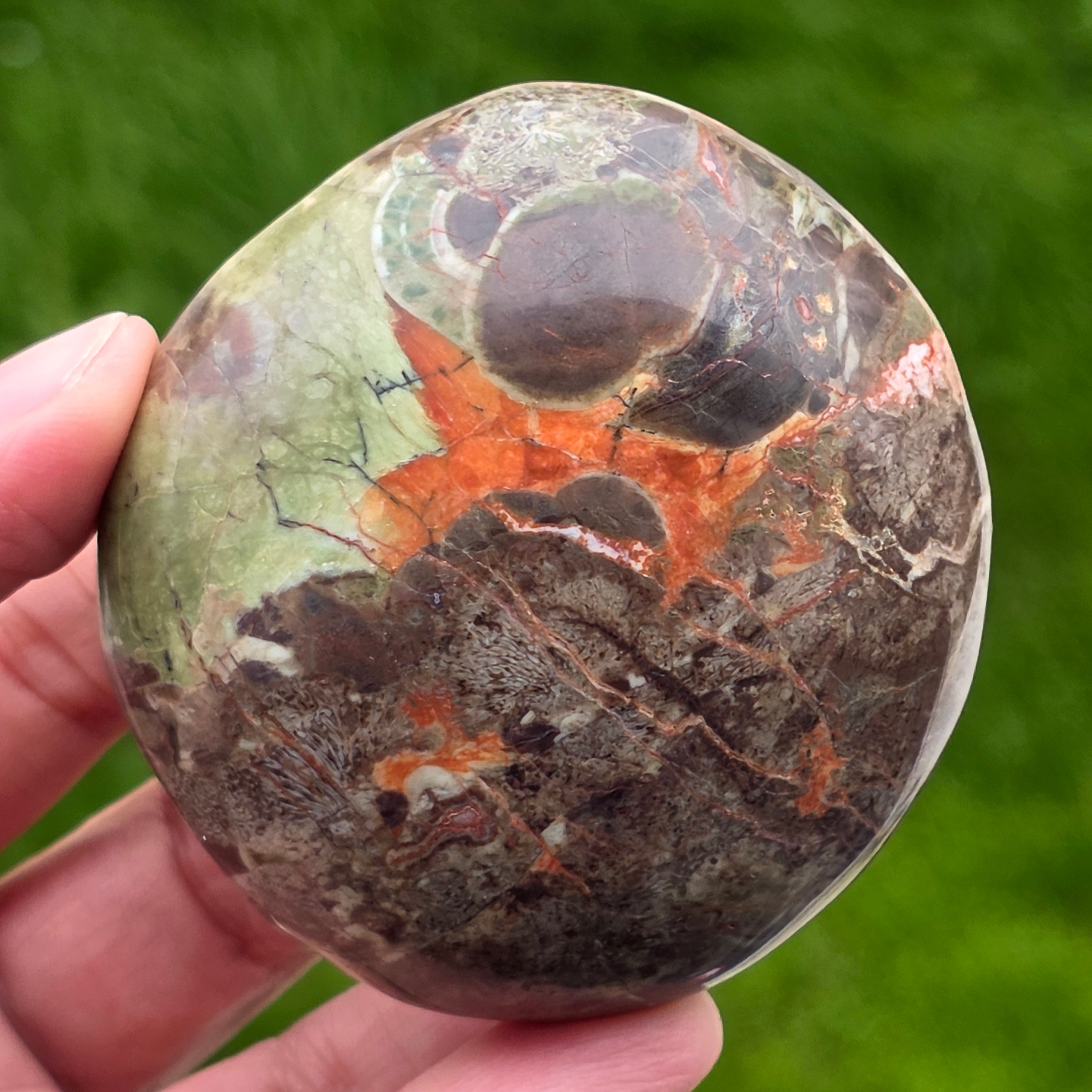 Αυτή η προσεκτικά γυαλισμένη πέτρα ταιριάζει απόλυτα στην παλάμη, φορώντας τη σιωπηλή ενέργεια των βουνών και τη δύναμη ενός καυσόξυλου. Το βουνό Riolite με ζεστές καφέ αποχρώσεις, ορυκτές πράσινες προθέσεις και ηφαιστειακές πορτοκαλί ίριδες μας θυμίζει πυκνά δάση, υγρό έδαφος και ουρανό σε φλόγες.