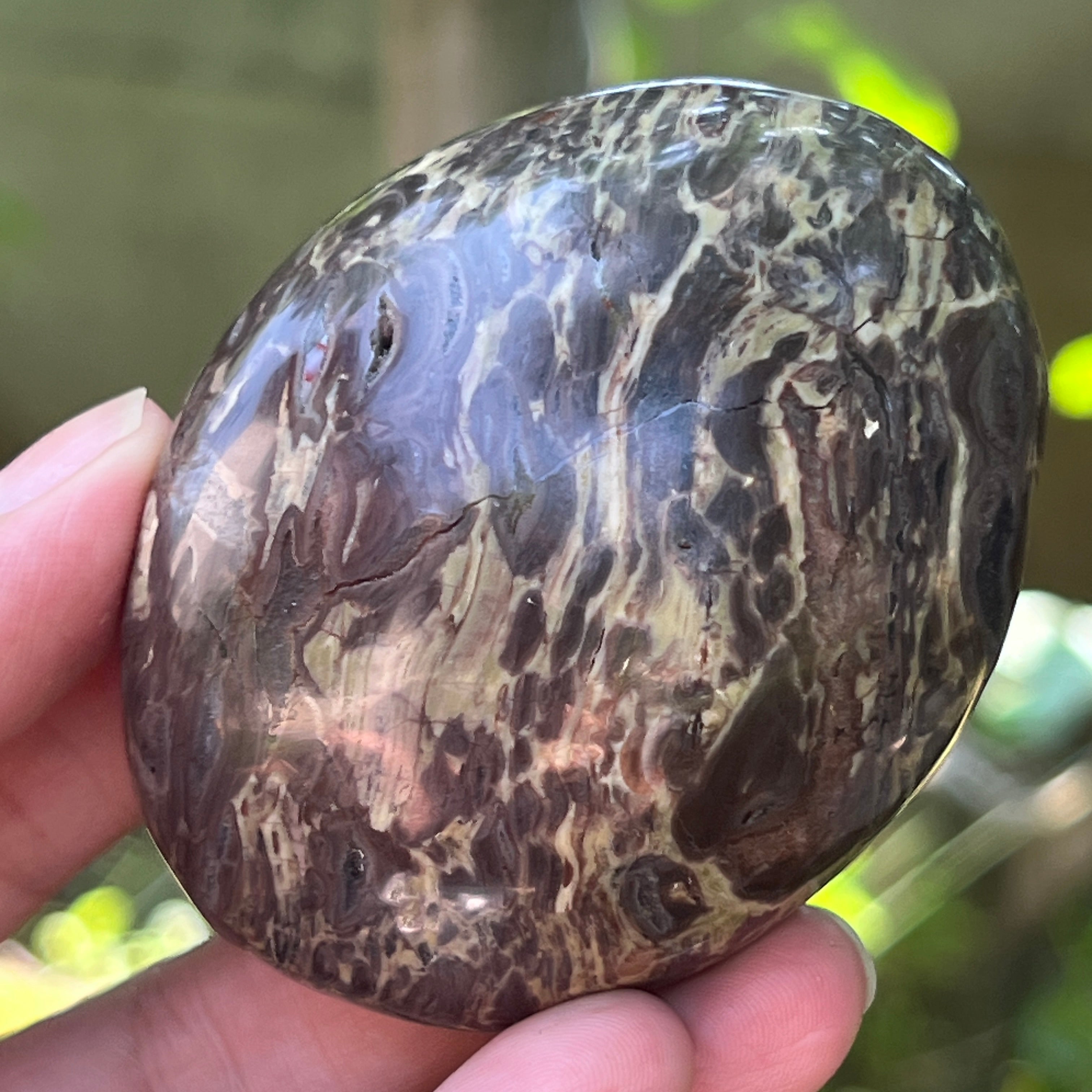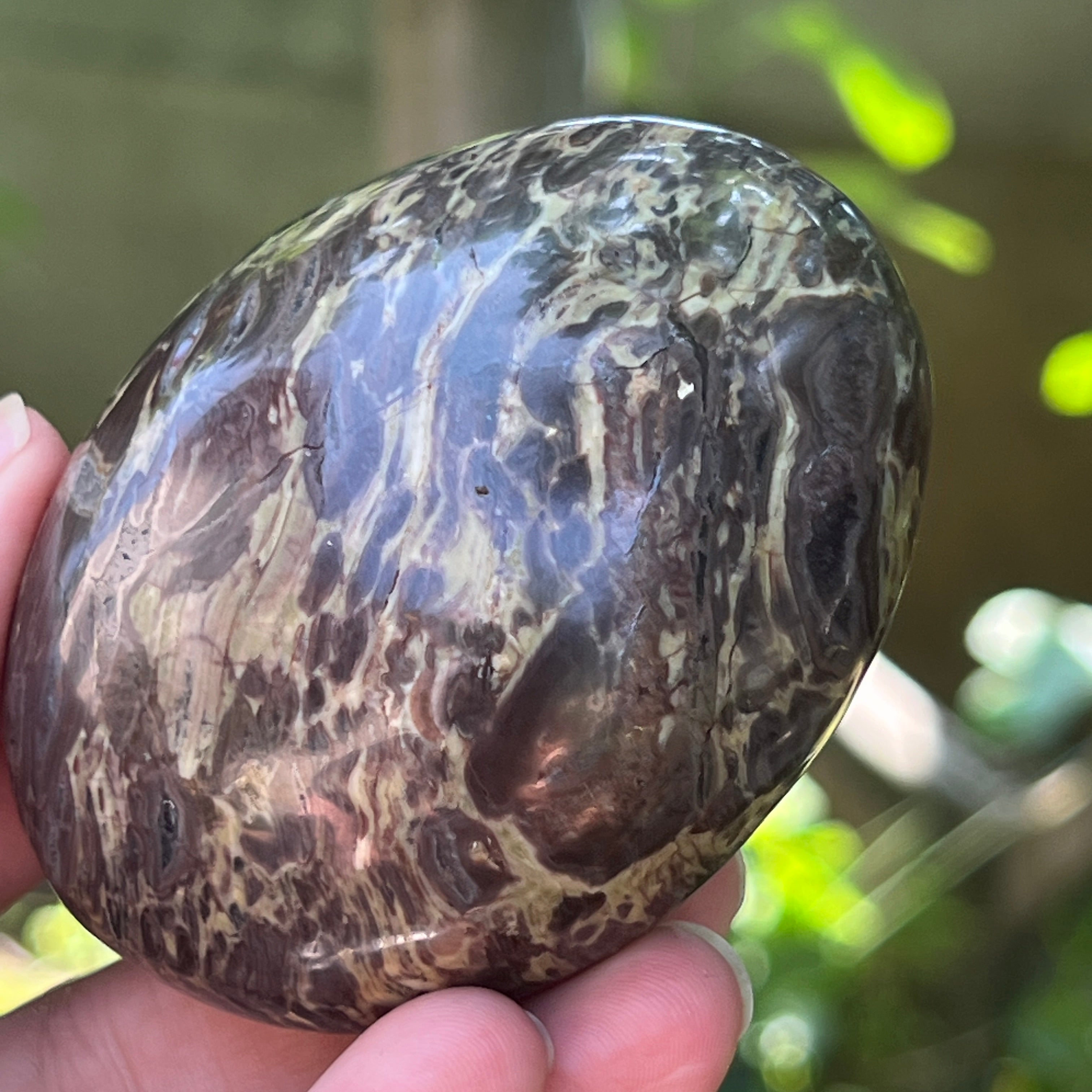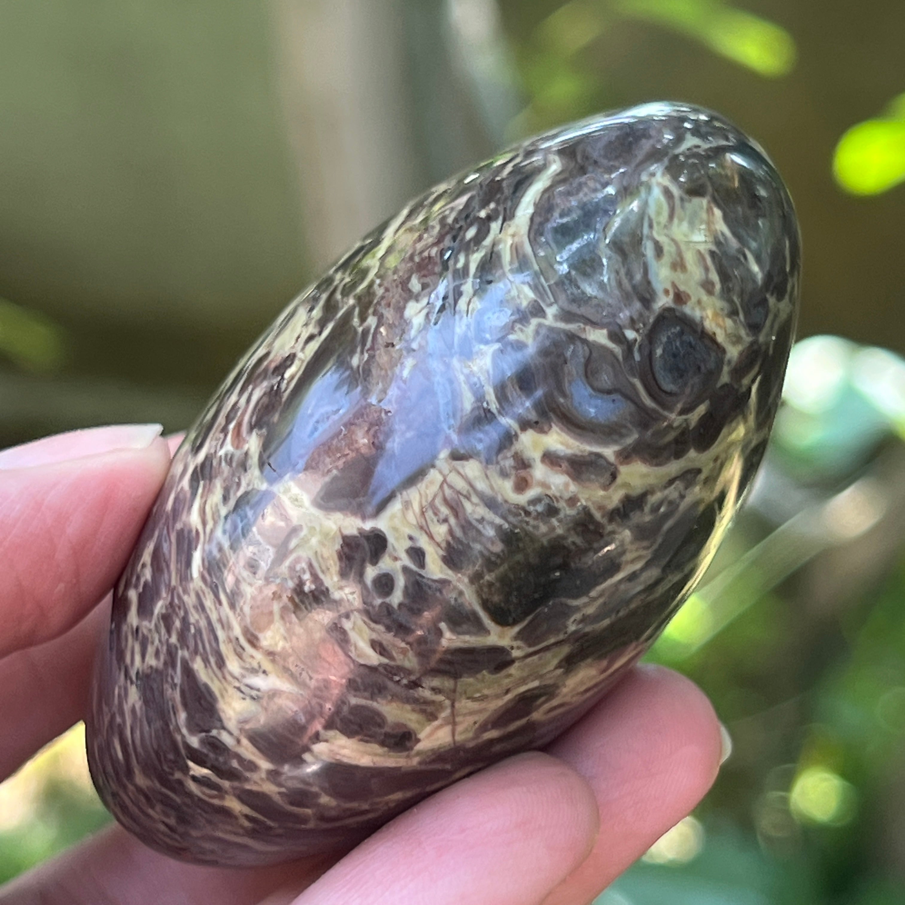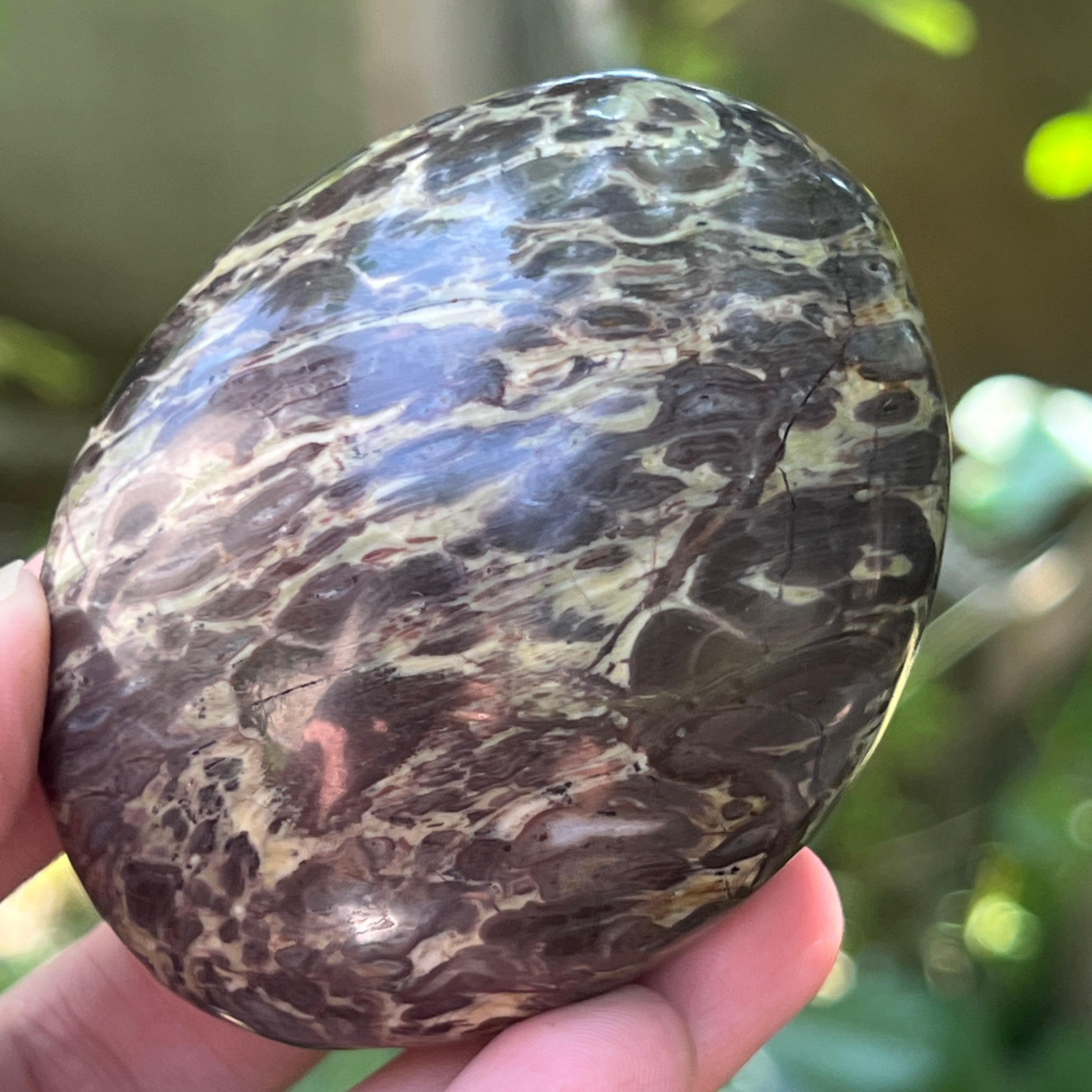 Αυτή η προσεκτικά γυαλισμένη πέτρα ταιριάζει απόλυτα στην παλάμη, φορώντας τη σιωπηλή ενέργεια των βουνών και τη δύναμη ενός καυσόξυλου. Το βουνό Riolite με ζεστές καφέ αποχρώσεις, ορυκτές πράσινες προθέσεις και ηφαιστειακές πορτοκαλί ίριδες μας θυμίζει πυκνά δάση, υγρό έδαφος και ουρανό σε φλόγες.