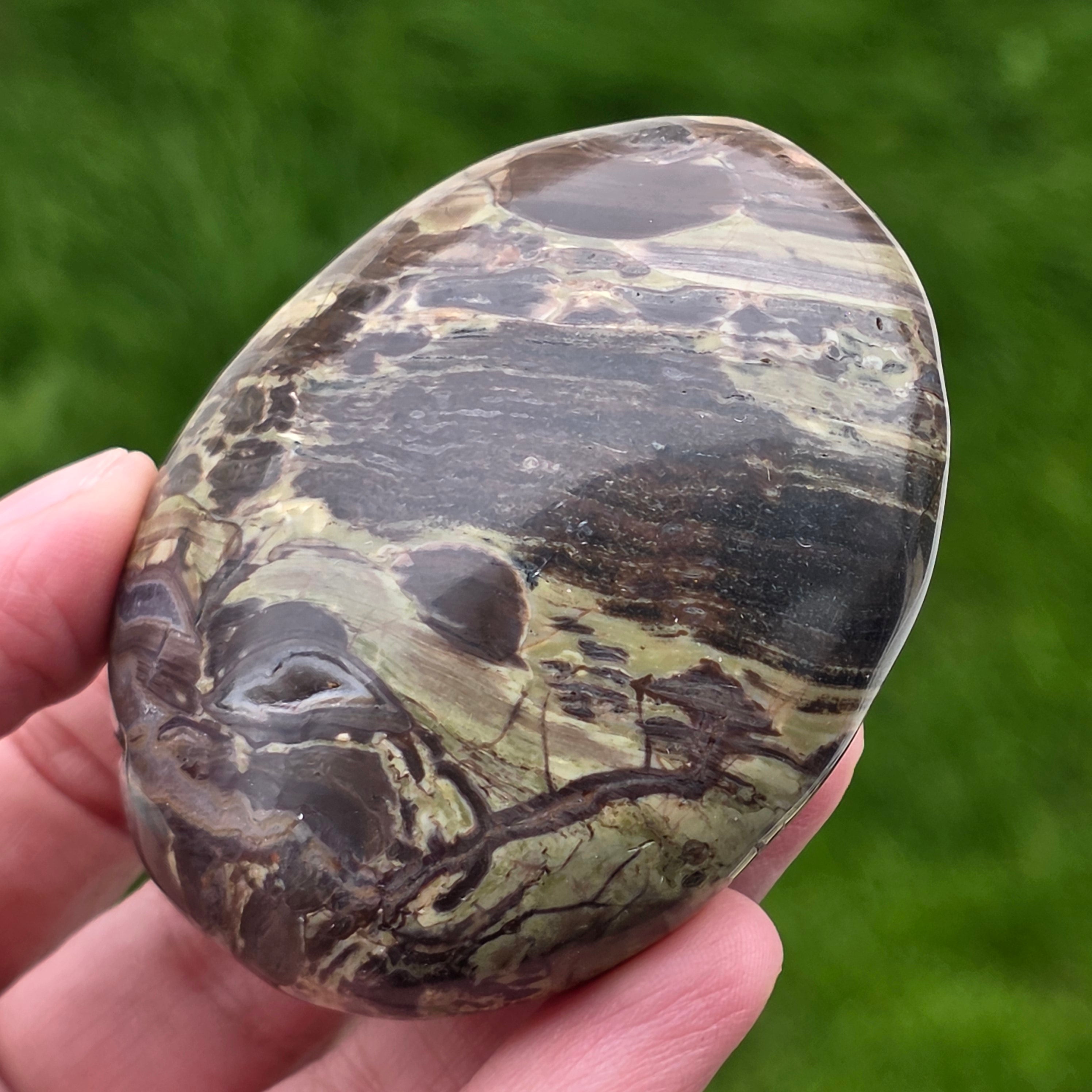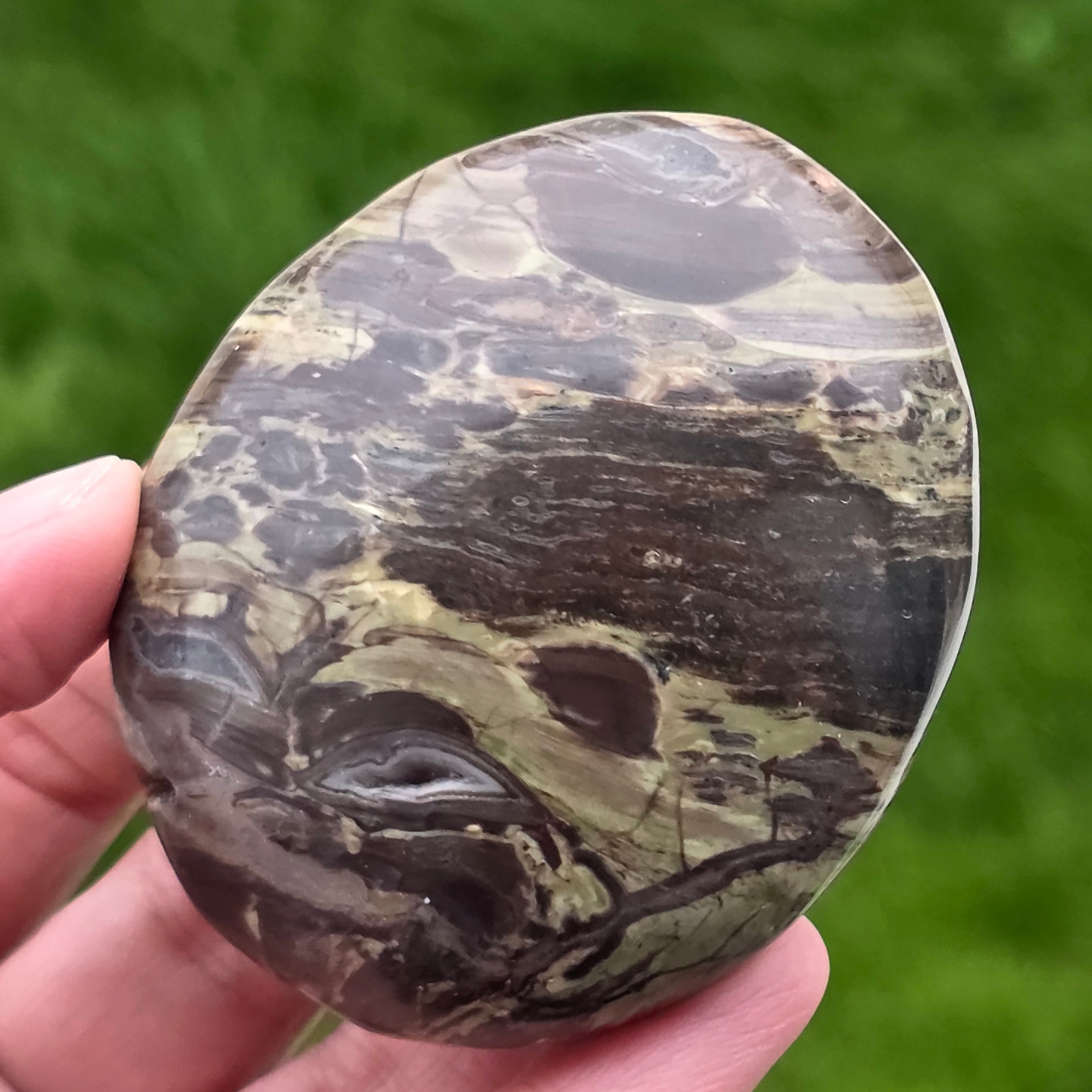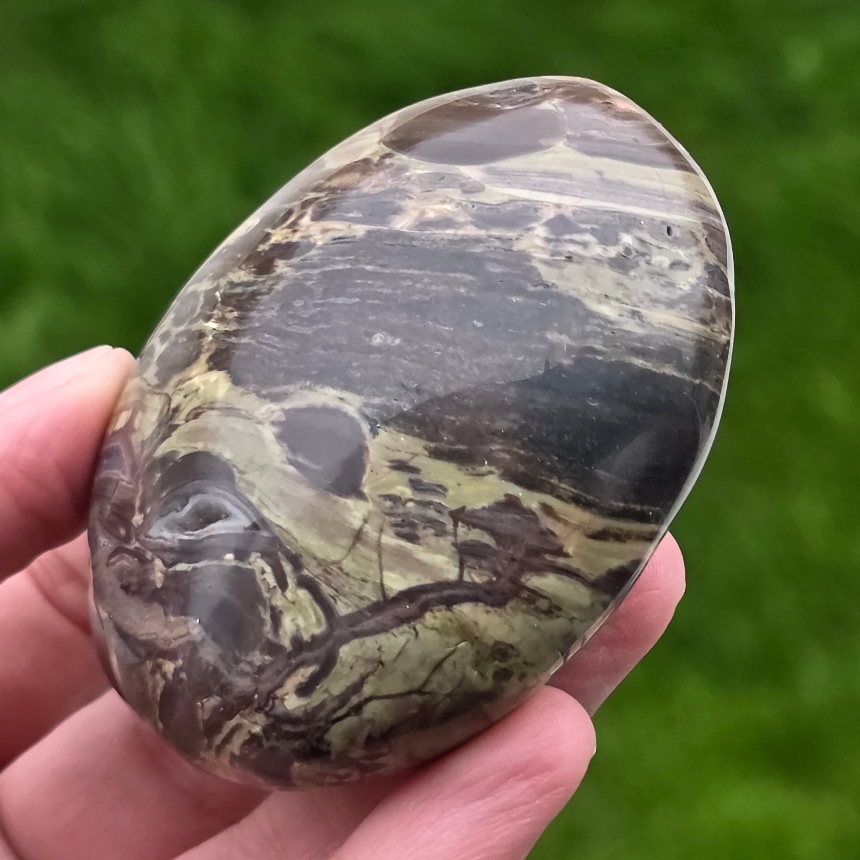 Αυτή η προσεκτικά γυαλισμένη πέτρα ταιριάζει απόλυτα στην παλάμη, φορώντας τη σιωπηλή ενέργεια των βουνών και τη δύναμη ενός καυσόξυλου. Το βουνό Riolite με ζεστές καφέ αποχρώσεις, ορυκτές πράσινες προθέσεις και ηφαιστειακές πορτοκαλί ίριδες μας θυμίζει πυκνά δάση, υγρό έδαφος και ουρανό σε φλόγες.