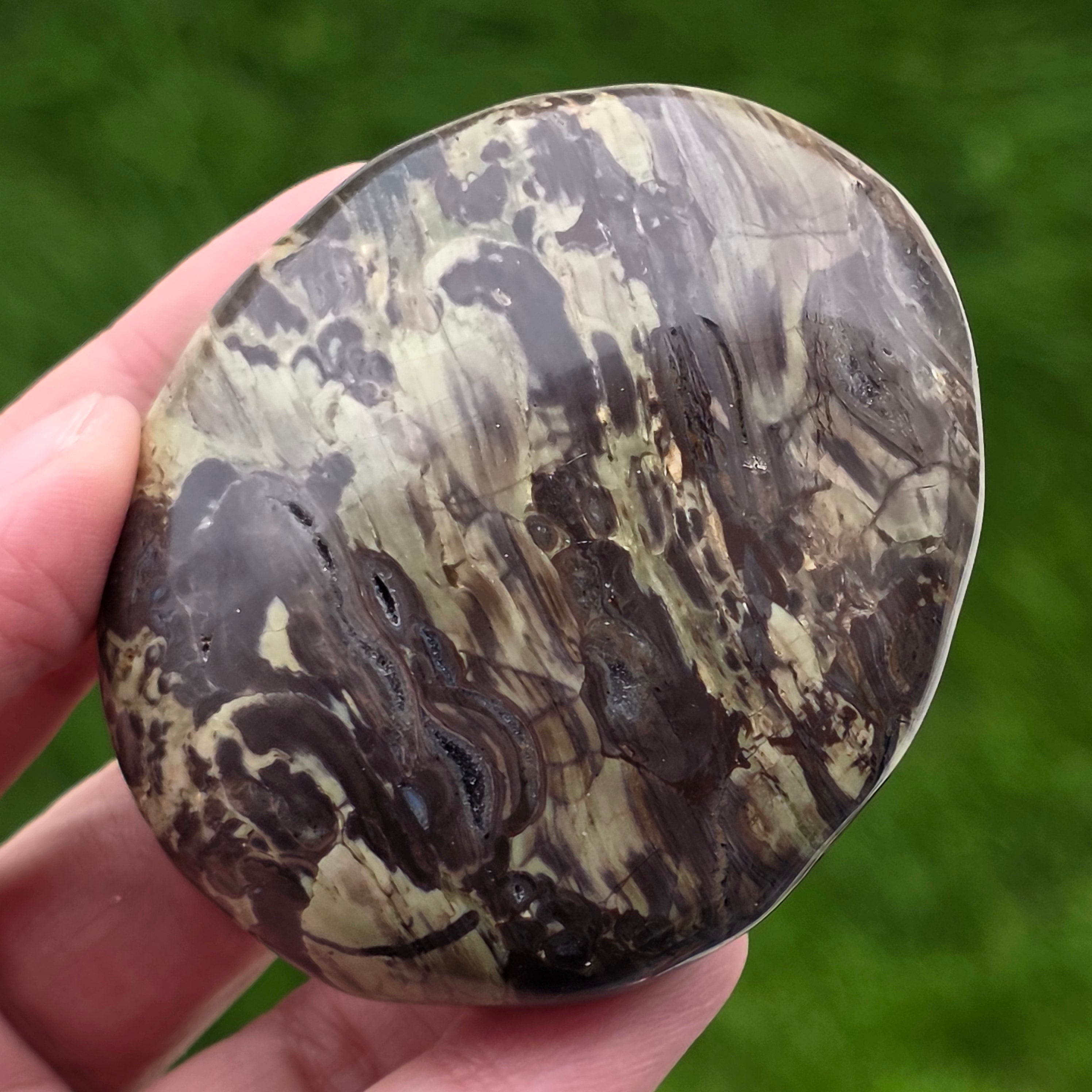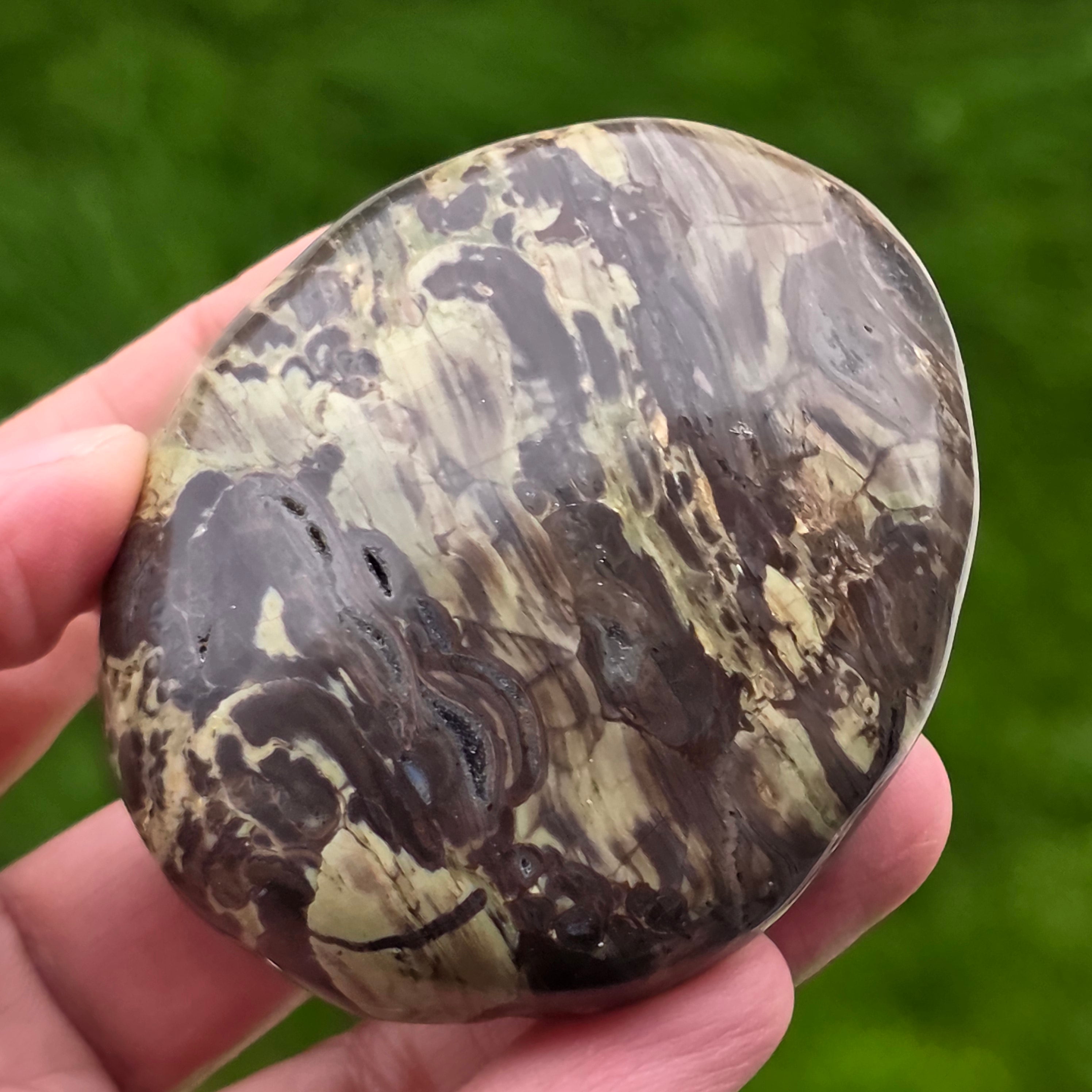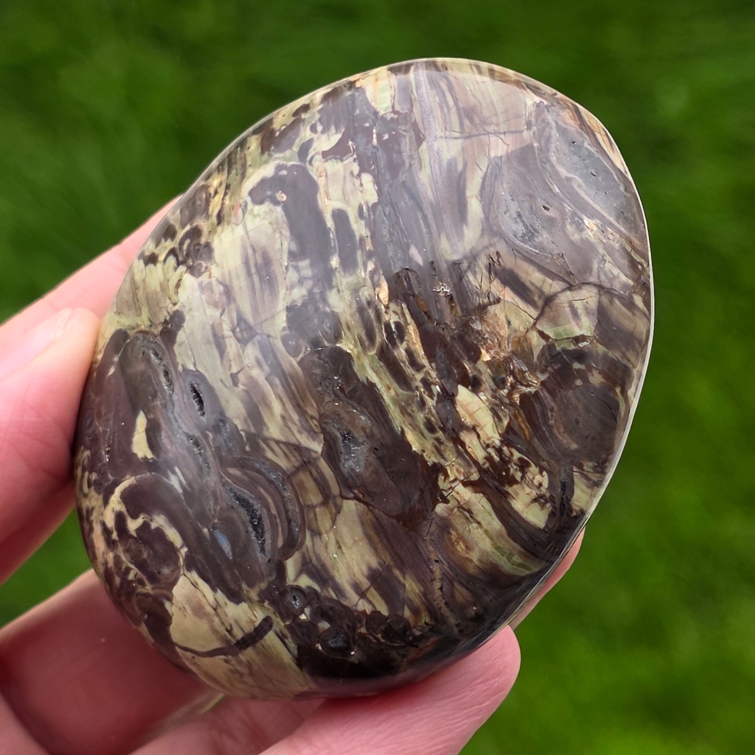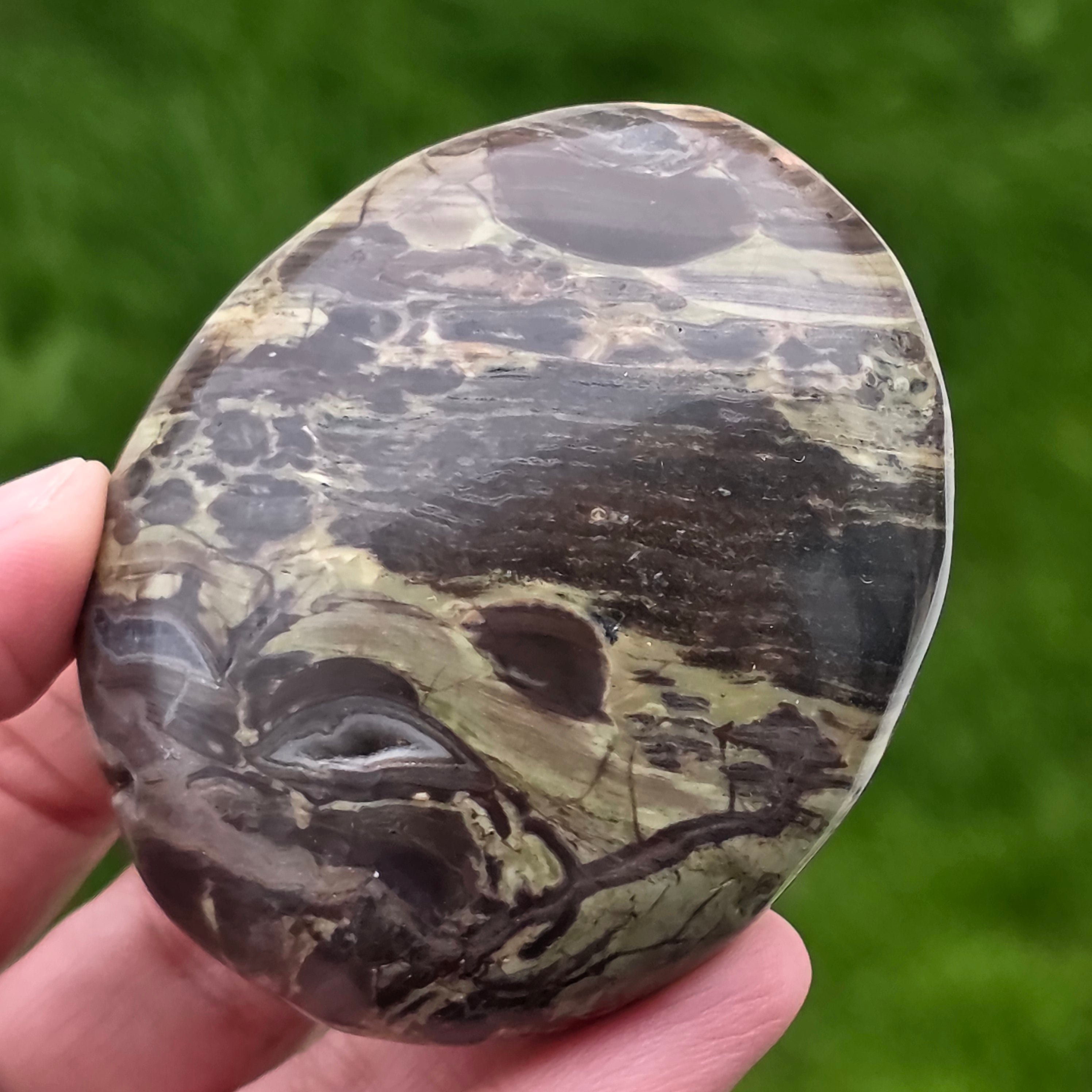 Αυτή η προσεκτικά γυαλισμένη πέτρα ταιριάζει απόλυτα στην παλάμη, φορώντας τη σιωπηλή ενέργεια των βουνών και τη δύναμη ενός καυσόξυλου. Το βουνό Riolite με ζεστές καφέ αποχρώσεις, ορυκτές πράσινες προθέσεις και ηφαιστειακές πορτοκαλί ίριδες μας θυμίζει πυκνά δάση, υγρό έδαφος και ουρανό σε φλόγες.
