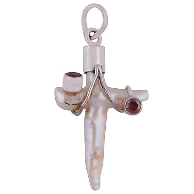 Un pandantiv cu design organic și expresiv, lucrat manual din sidef natural în formă de cruce neregulată, decorată cu două pietre de granat cu strălucire rubinie.