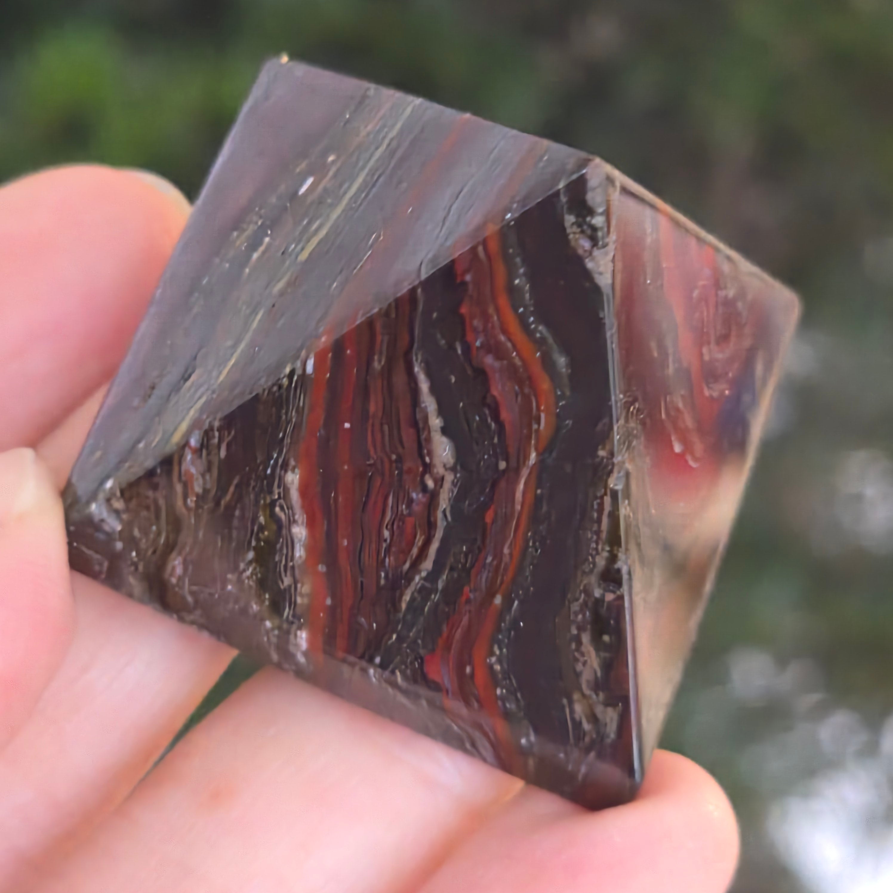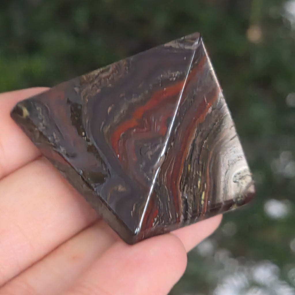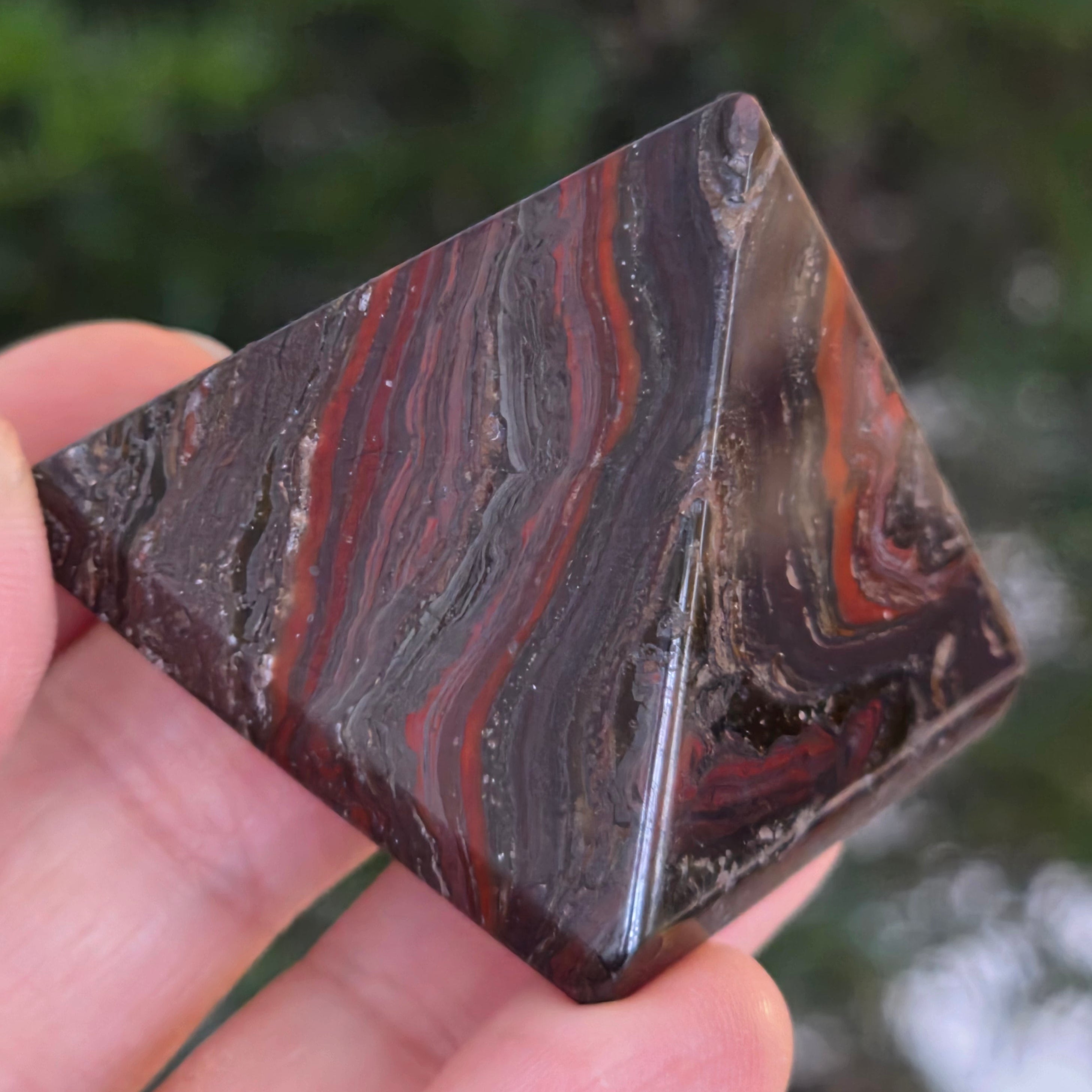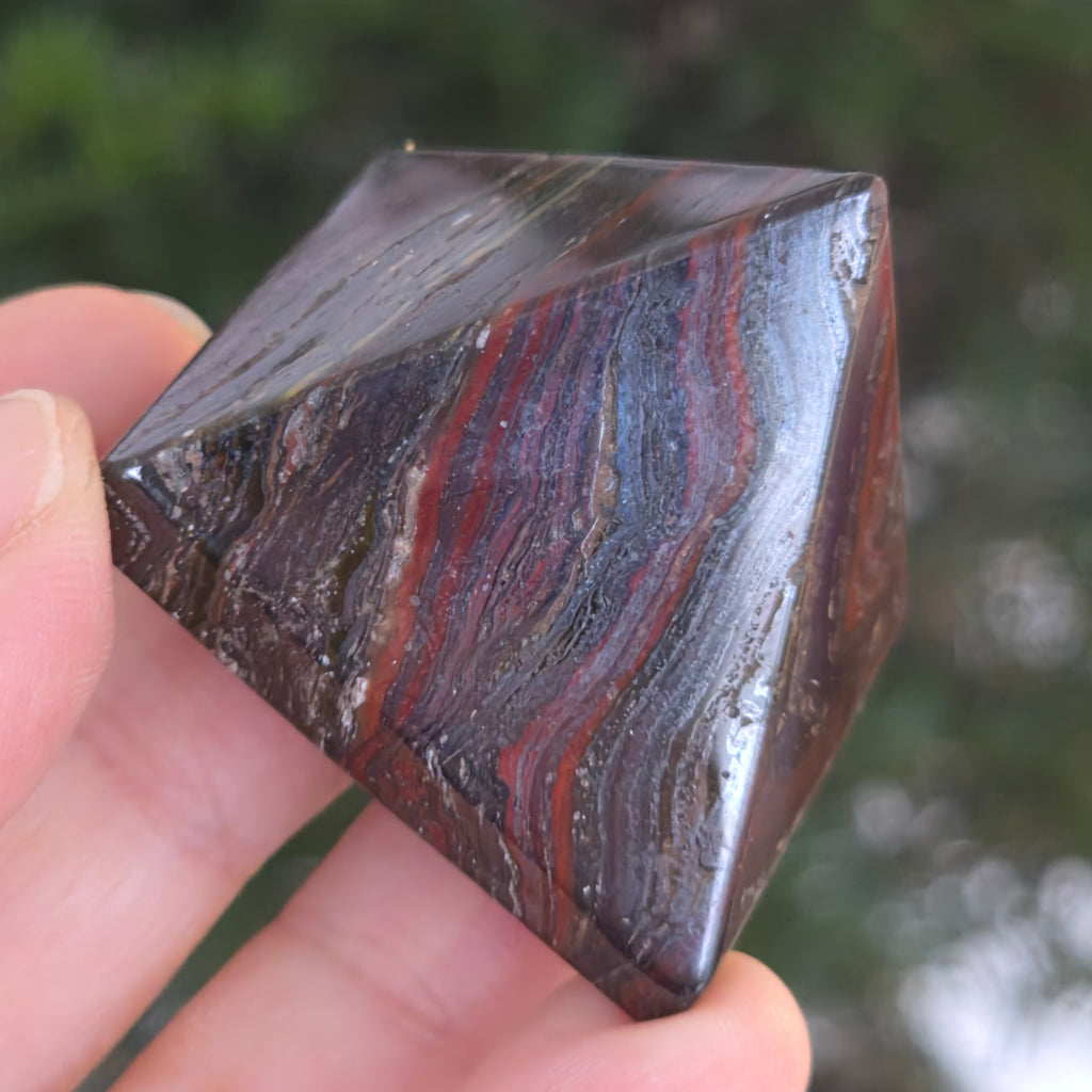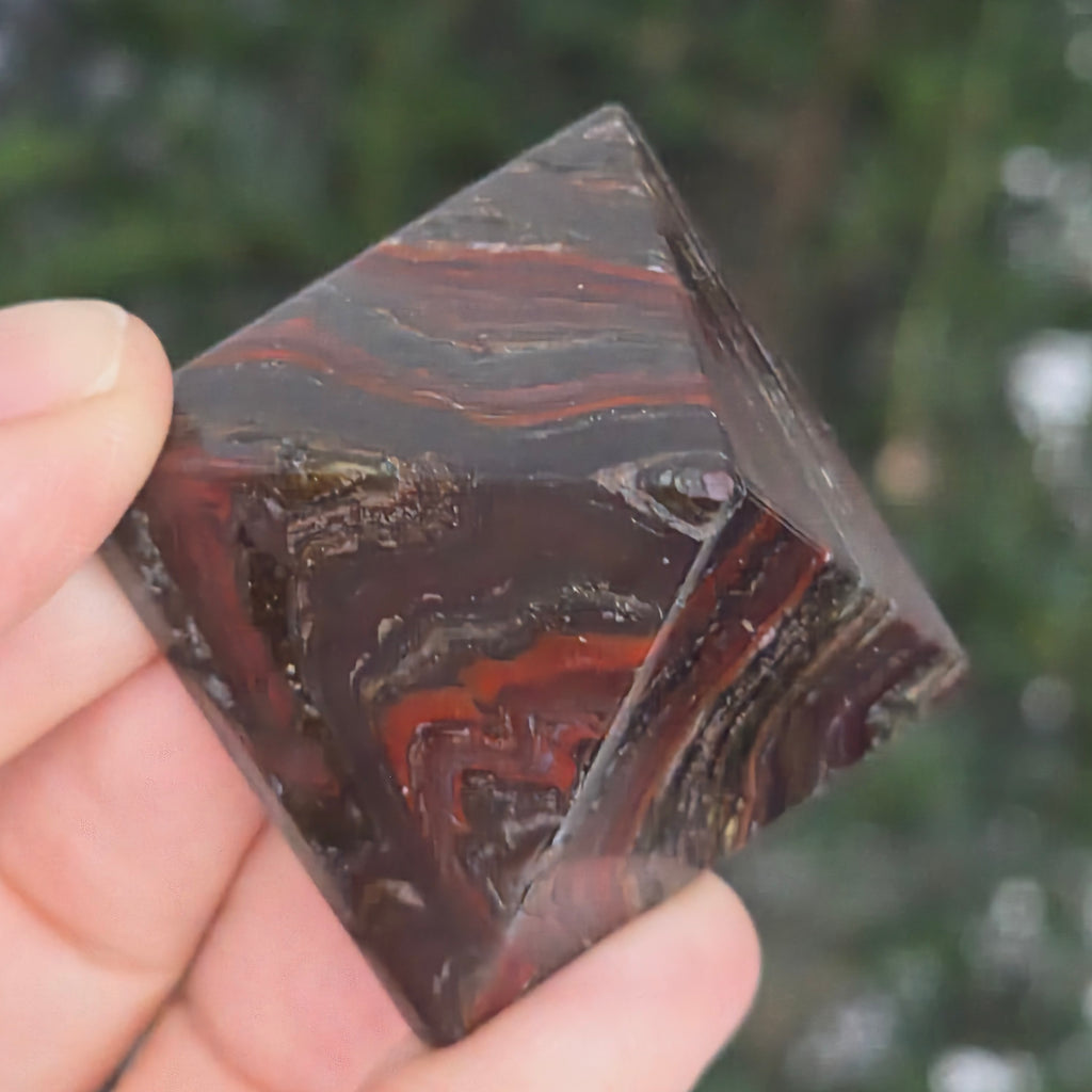 O piramidă care poartă culorile focului interior și ale pământului ancestral. Această piesă din jasp roșu natural cu incluziuni de hematit, dezvăluie un spectacol de tonuri calde – roșu cărămiziu, brun și gri-metalic – traversate de dungi naturale și reflexe sclipitoare. Suprafața perfect șlefuită evidențiază contrastele și textura bogată, dându-i o prezență puternică și nobilă.