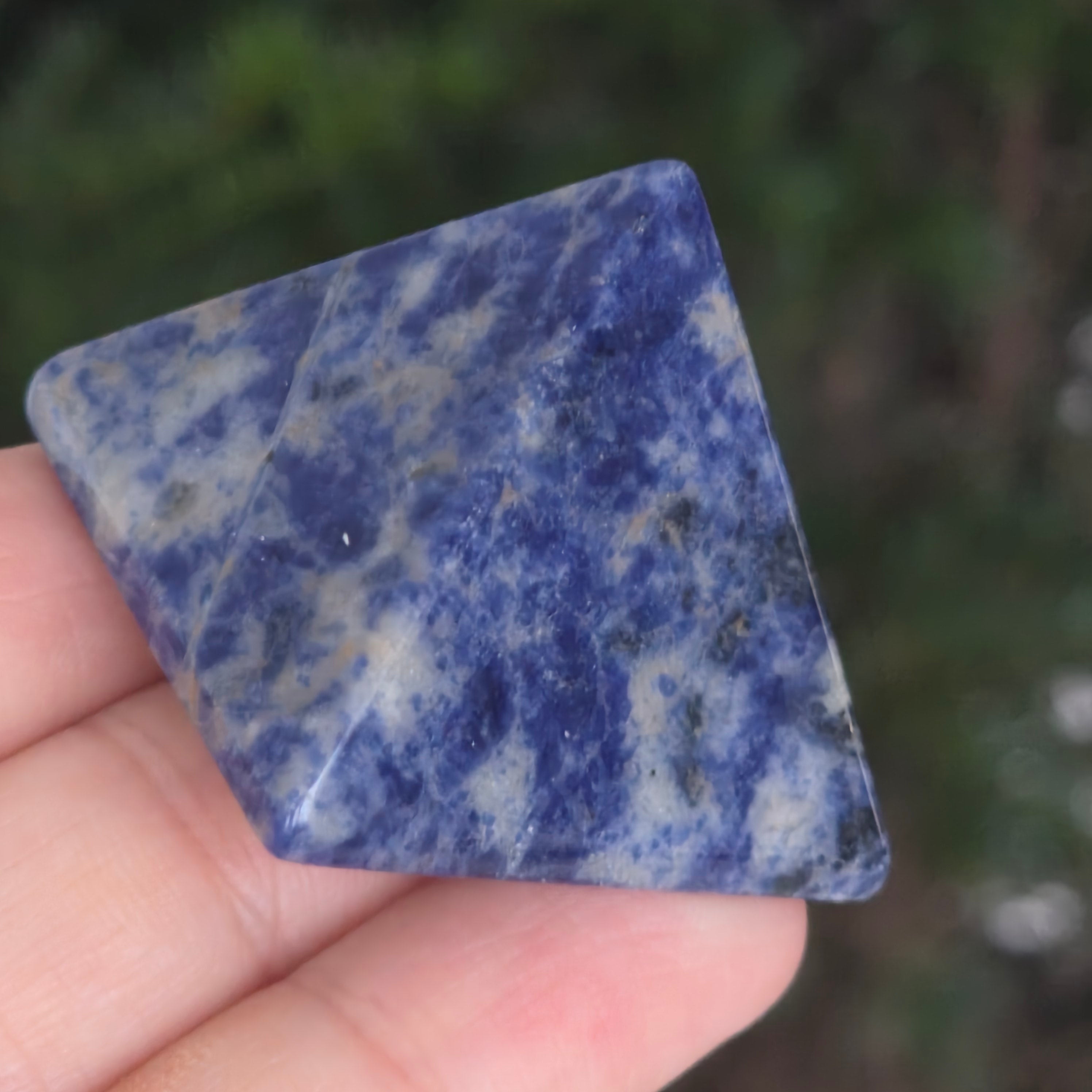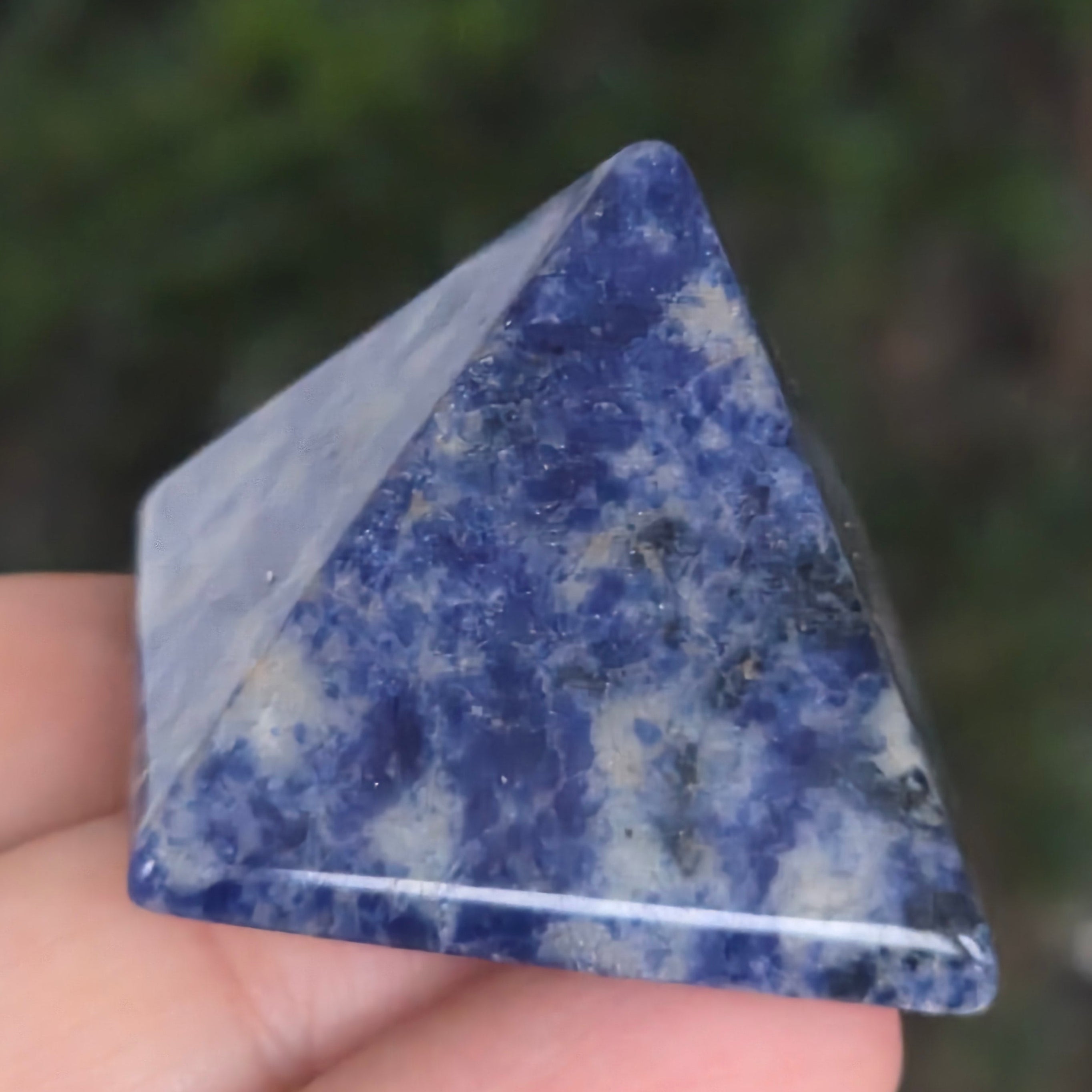 O piramidă ce poartă adâncimea cerului de noapte și liniștea gândurilor limpezi. Această piesă din sodalit natural, dezvăluie un amestec fascinant de albastru intens, alb și gri, cu vene delicate ce par desenate de apă pe piatră. Suprafața fin șlefuită reflectă lumina cu subtilitate, emanând calm și concentrare.
