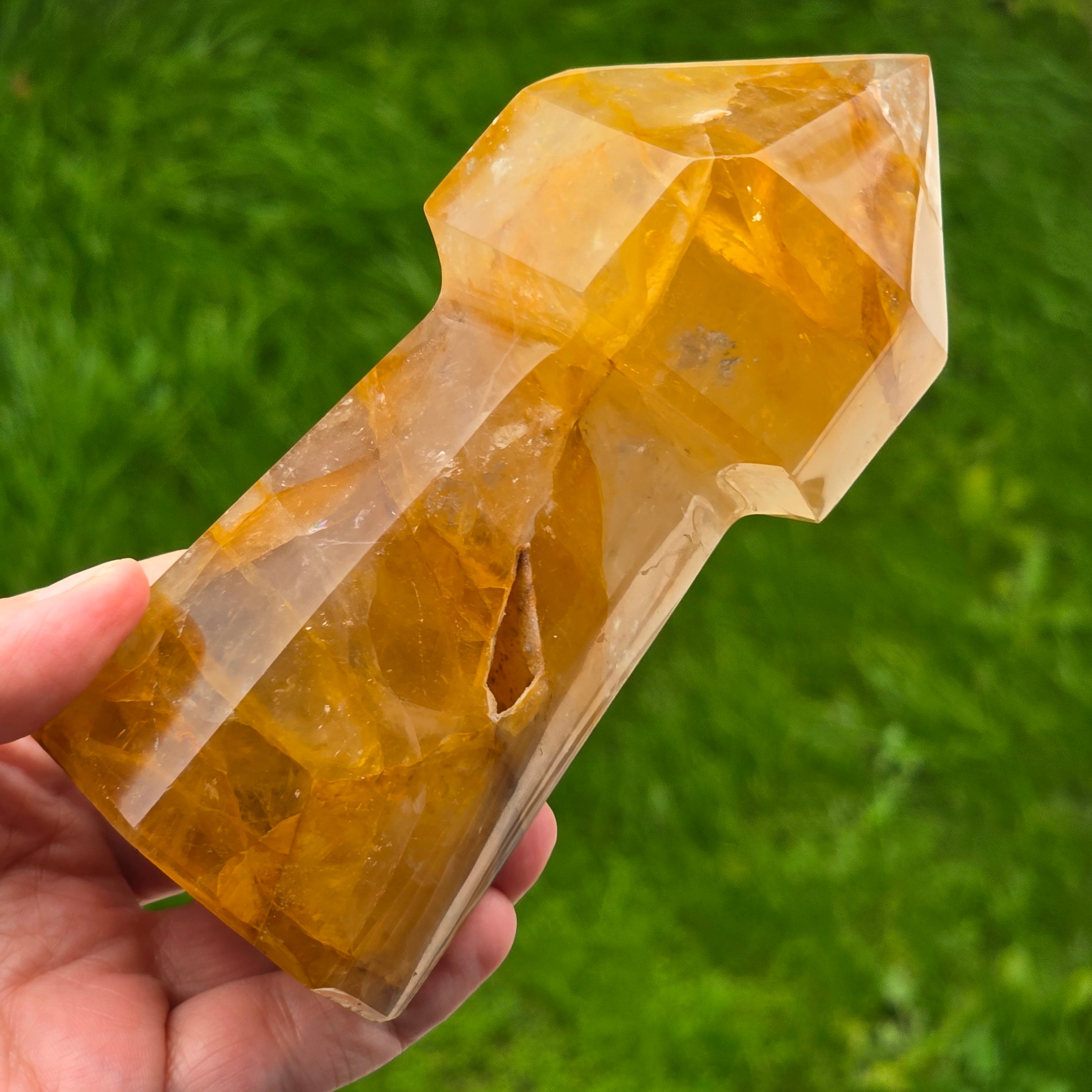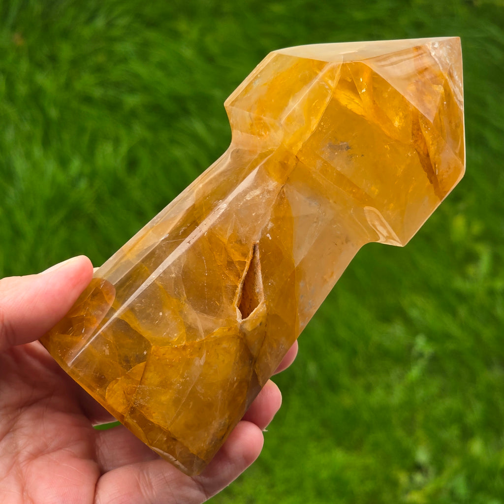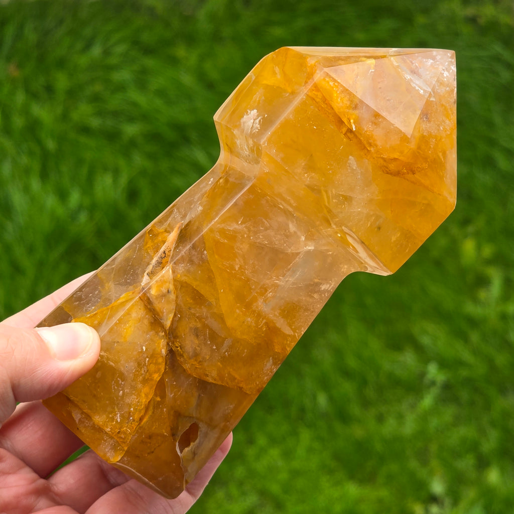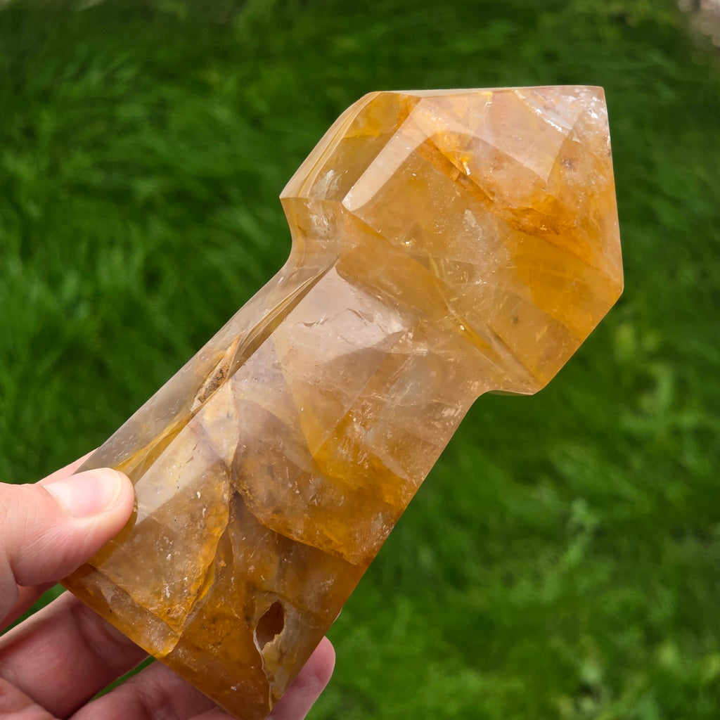 Sceptrul din Cuart Lămâie este o piesă luminoasă și expresivă, sculptată pentru a evidenția transparența blândă a cristalului și nuanțele sale calde de galben. Cuartul lămâie este cunoscut pentru claritatea sa vizuală și pentru reflexiile delicate care se formează atunci când este atins de lumină, iar forma de sceptru îi conferă o prezență elegantă și direcțională. În forma de sceptru, cristalul devine ideal pentru direcționarea energiei, lucrul pe meridiane, masaj energetic, activarea intențiilor și eliberarea tensiunilor din corp. Vârful său bine definit permite lucrul precis, iar partea inferioară stabilizează fluxul energetic în timpul meditației sau terapiei.