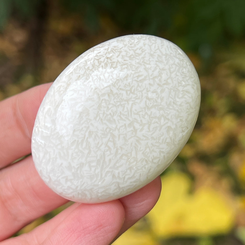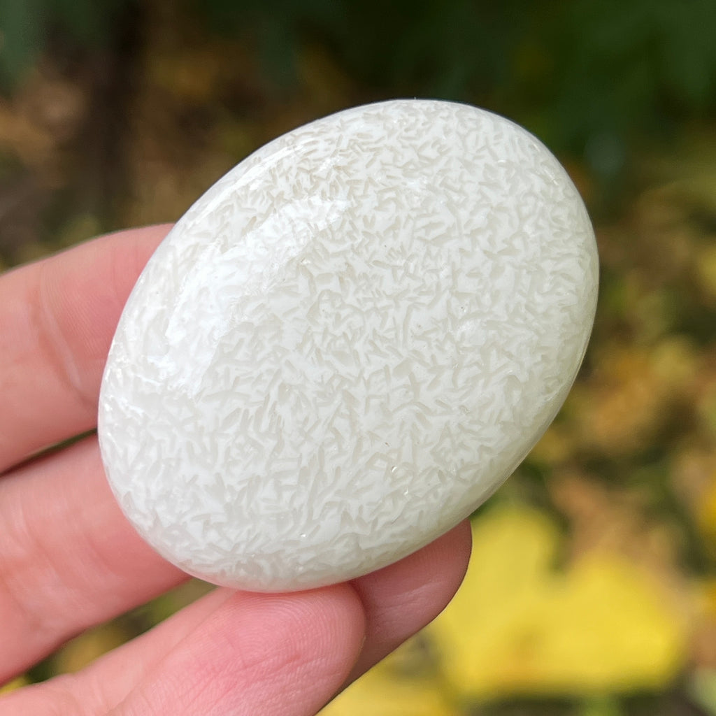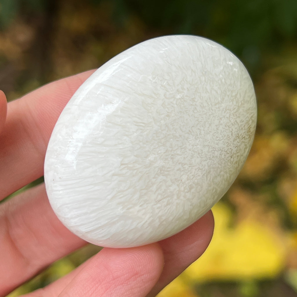 Scolecitul este o piatră delicată și luminoasă, aparținând familiei zeoliților, recunoscută pentru structura sa fină, fibros-radială și strălucirea mătăsoasă. De obicei albă sau crem, uneori cu nuanțe subtile de roz sau bej, această piatră emană o puritate aproape eterică, amintind de calmul lăuntric și de tăcerea din care se naște pacea.