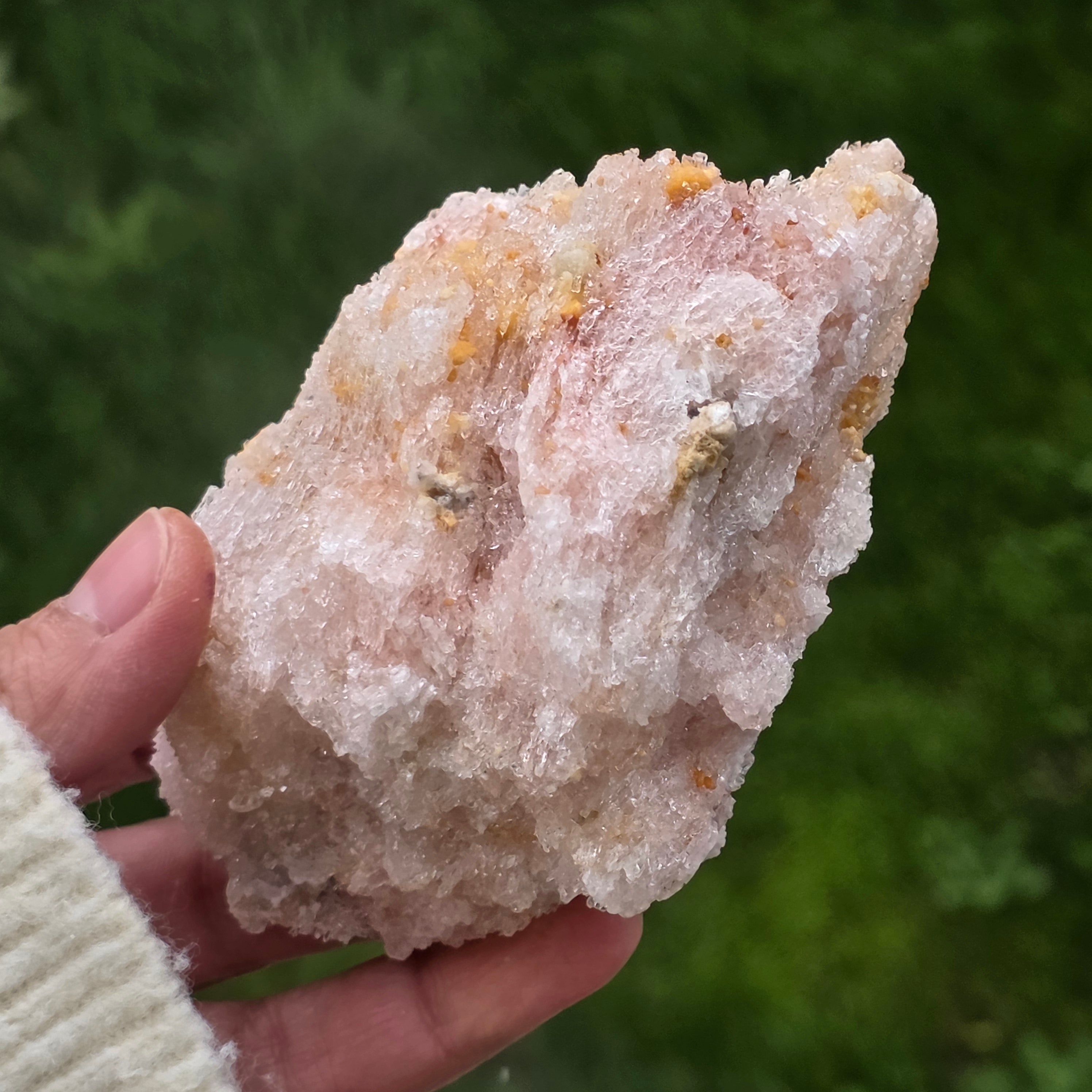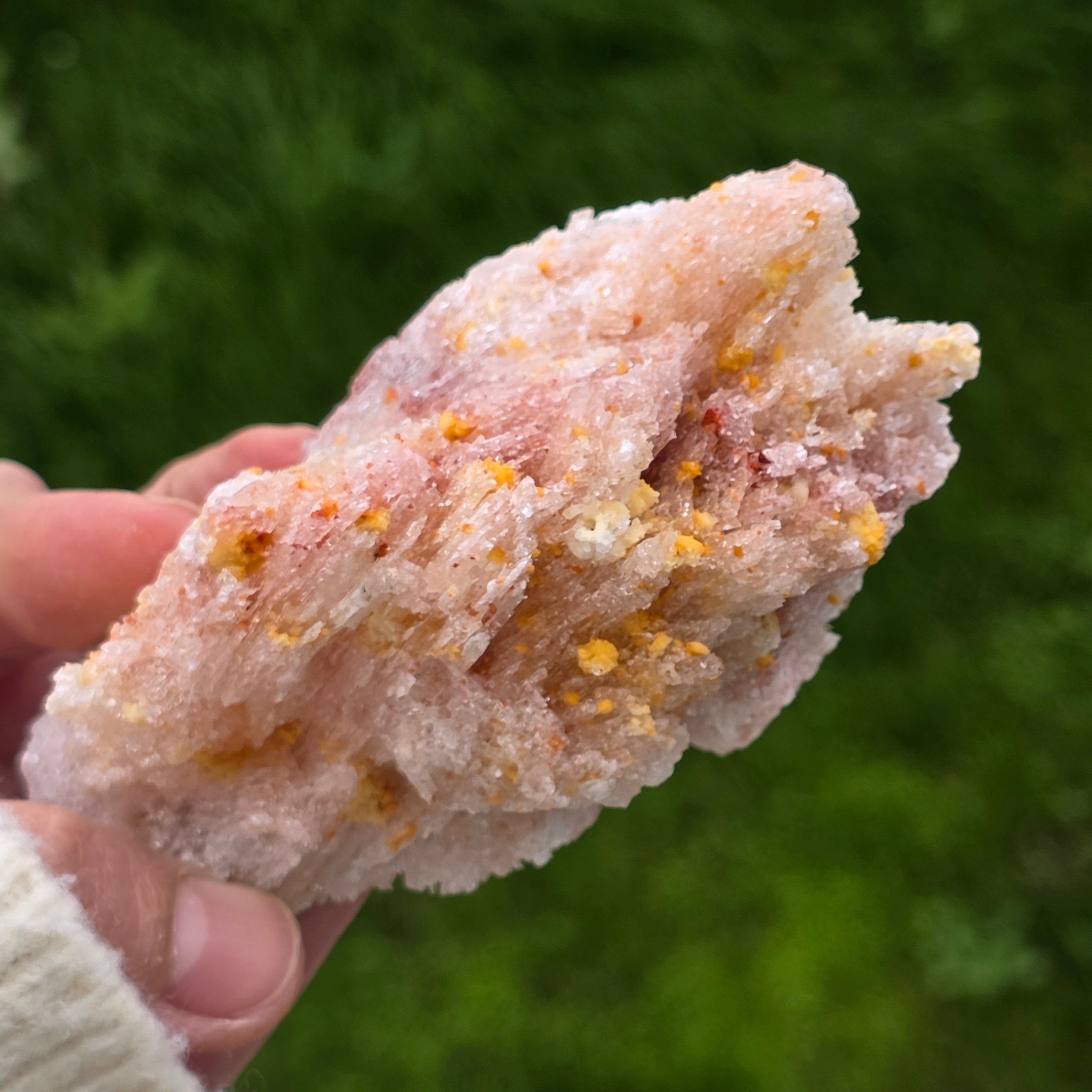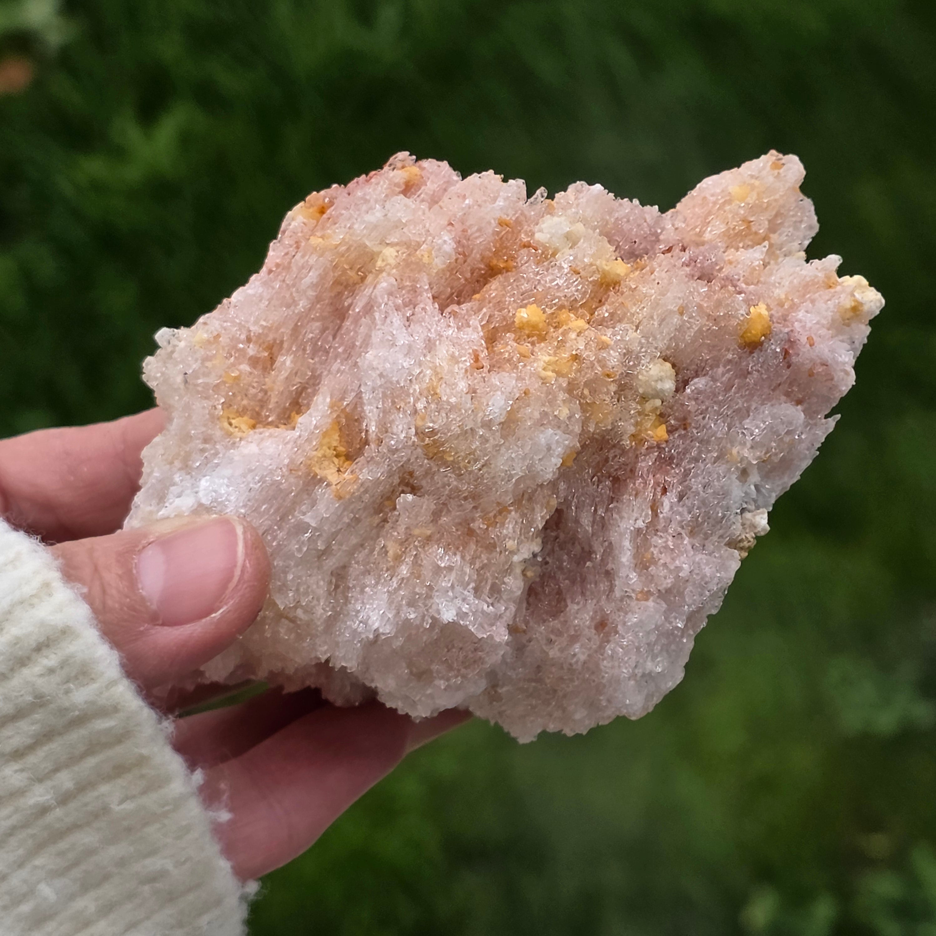 Rezultatul este o asociere mineralogică coerentă, în care matricea alb-translucidă de selenit este traversată sau punctată de incluziuni roșii de cinabar, fără delimitări artificiale. Cele două minerale sunt intim legate structural și vizual, cinabarul accentuând forma și transparența selenitului, iar selenitul punând în evidență culoarea intensă a cinabarului.