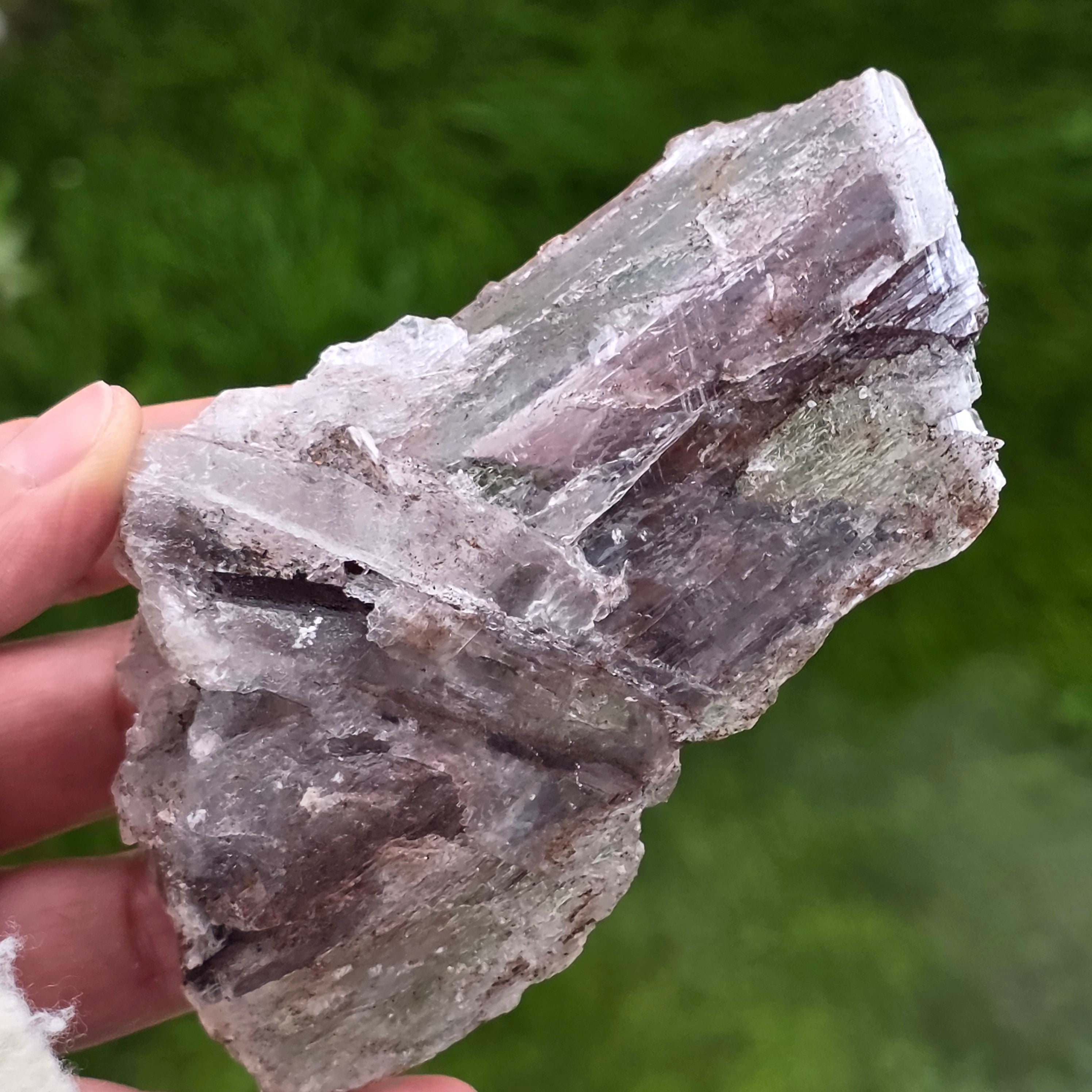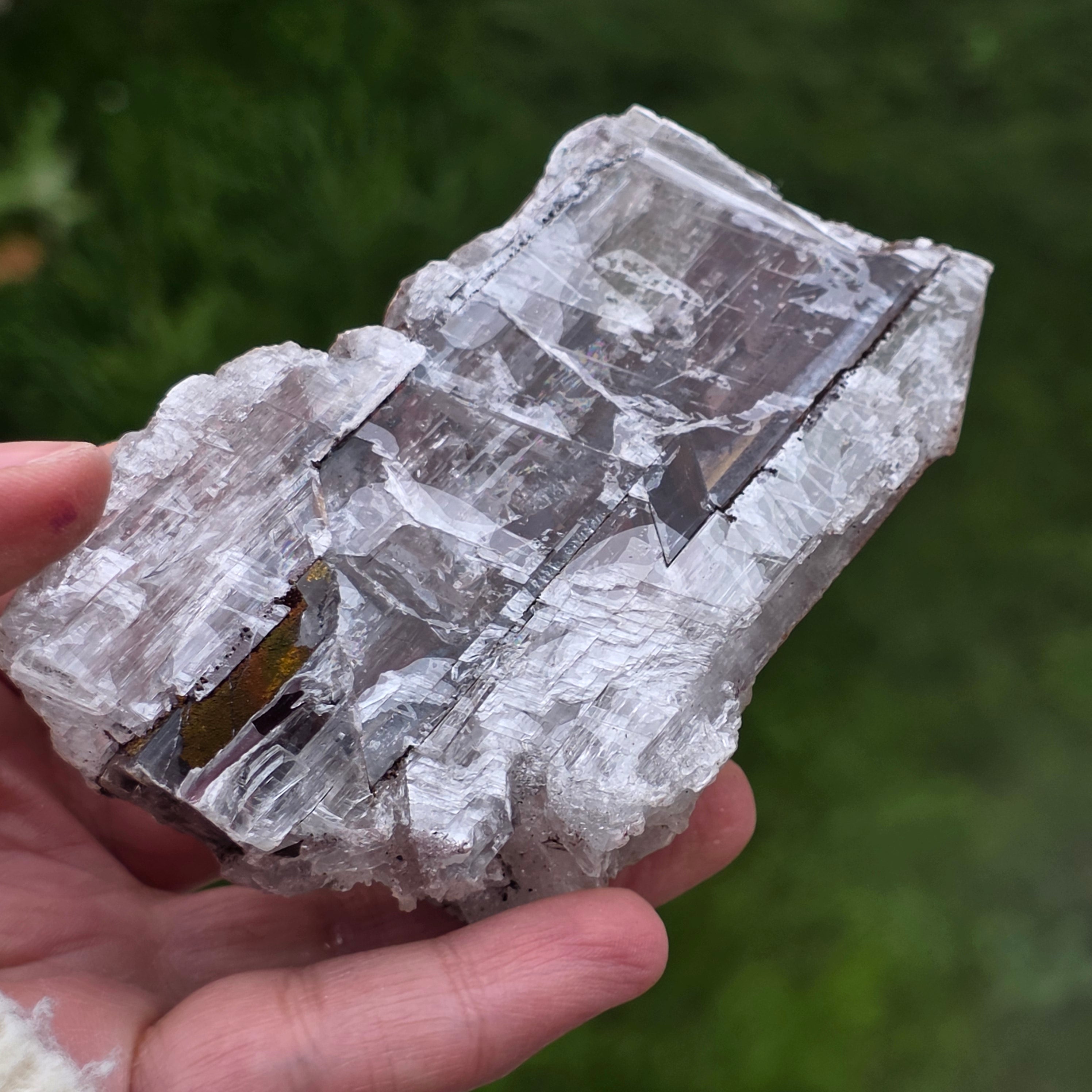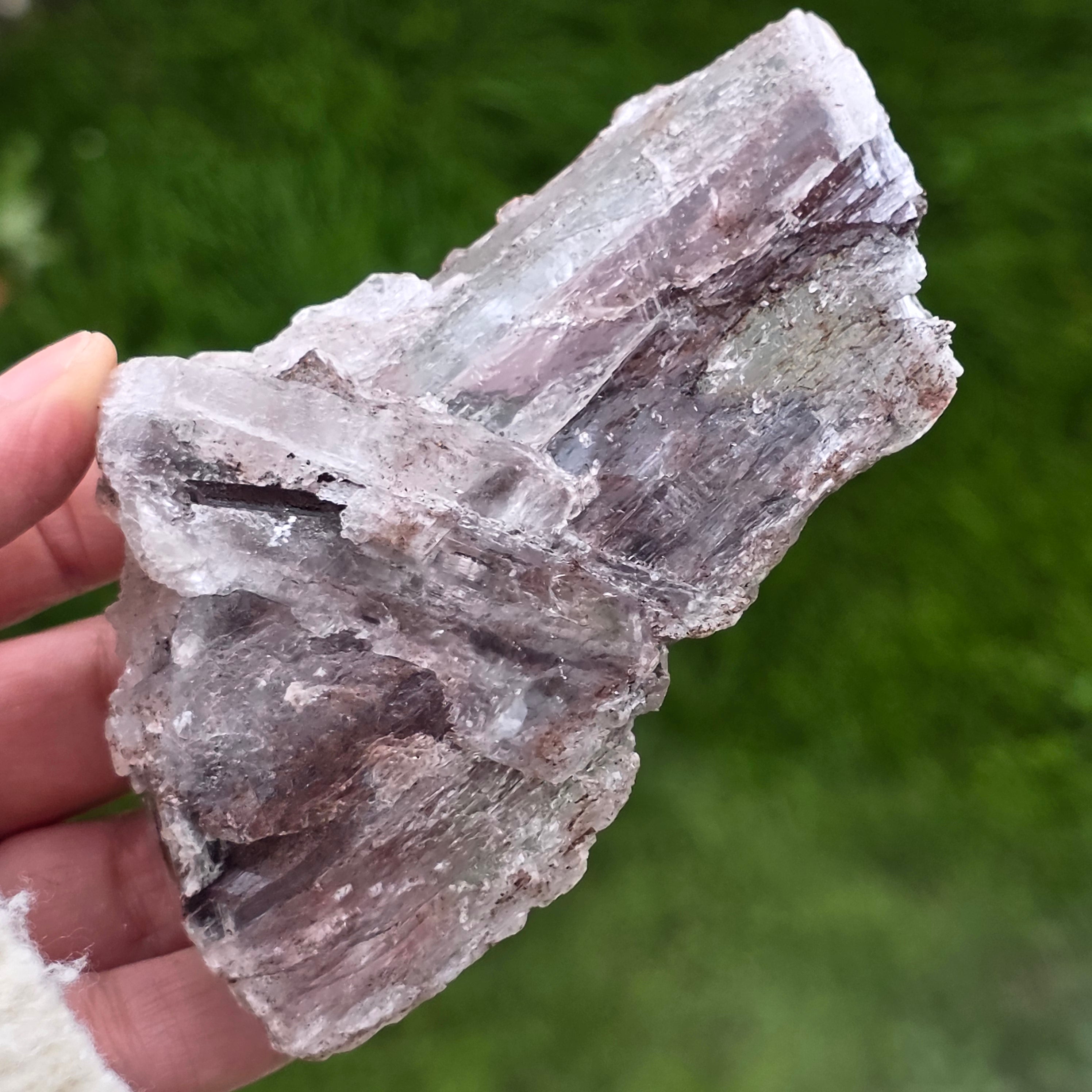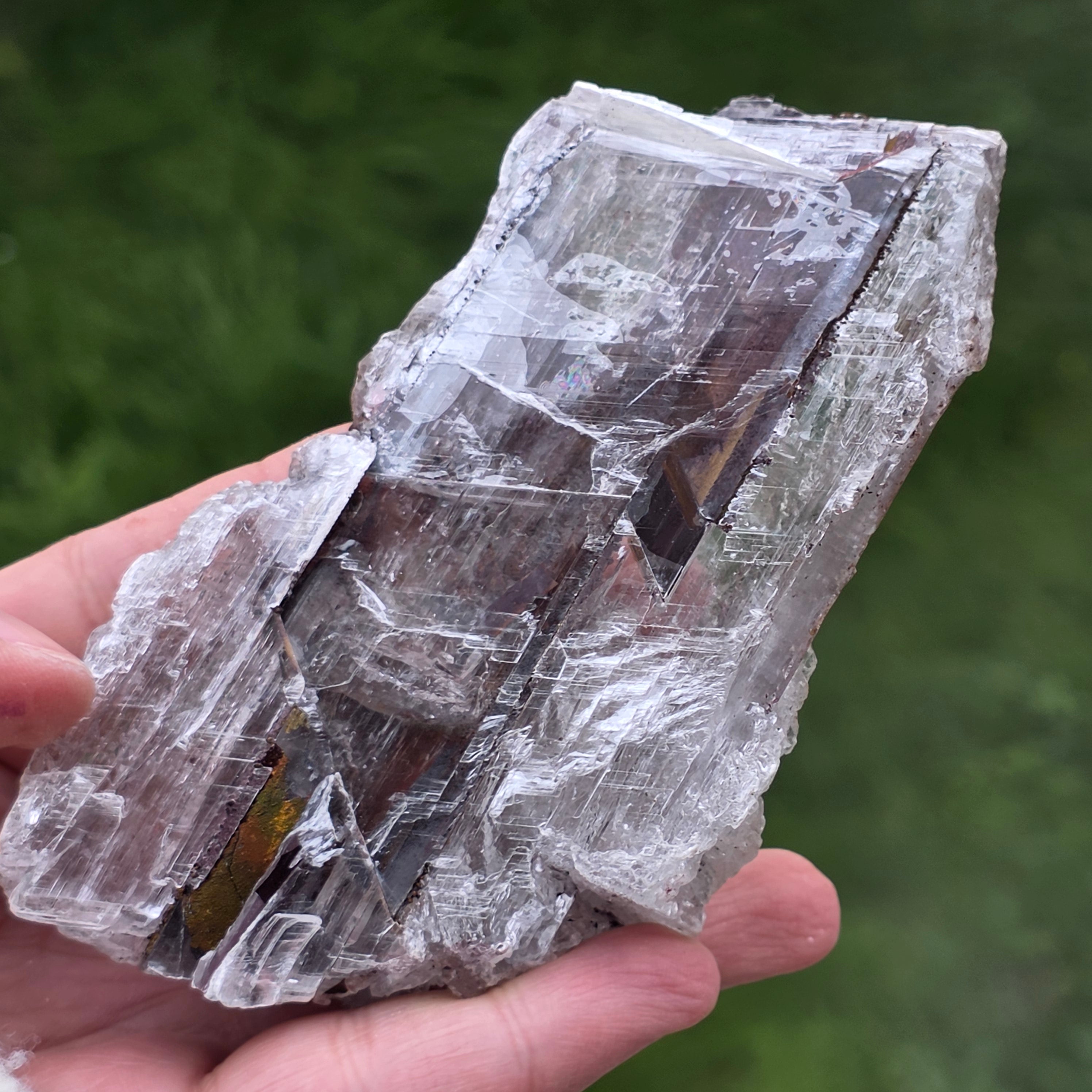 Selenitul apare sub formă de cristale alungite sau plăci translucide, cu luciu mătăsos și textură fină, în timp ce hematitul este prezent sub formă de incluziuni, pelicule sau depuneri naturale, care accentuează structura cristalului și îi conferă profunzime vizuală.