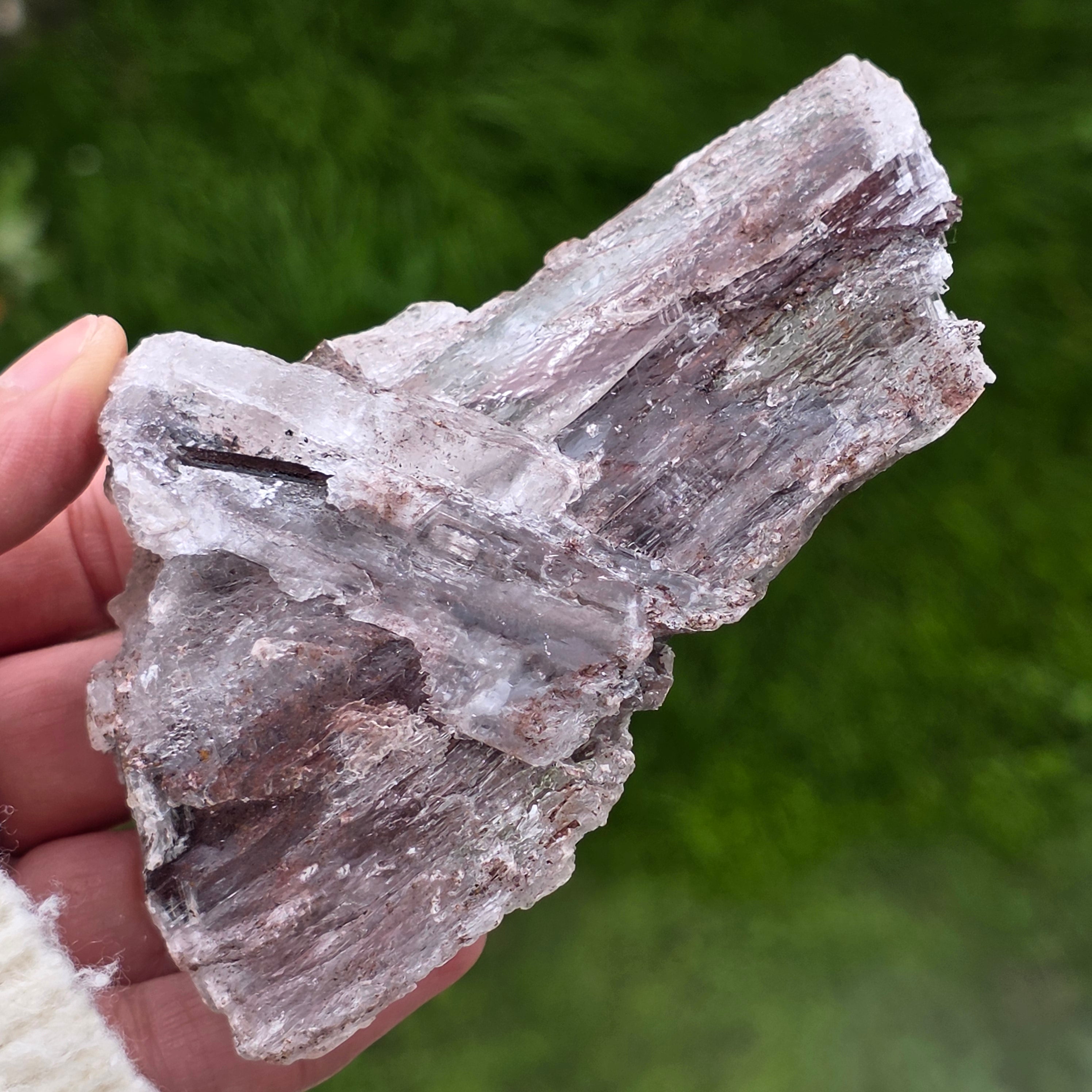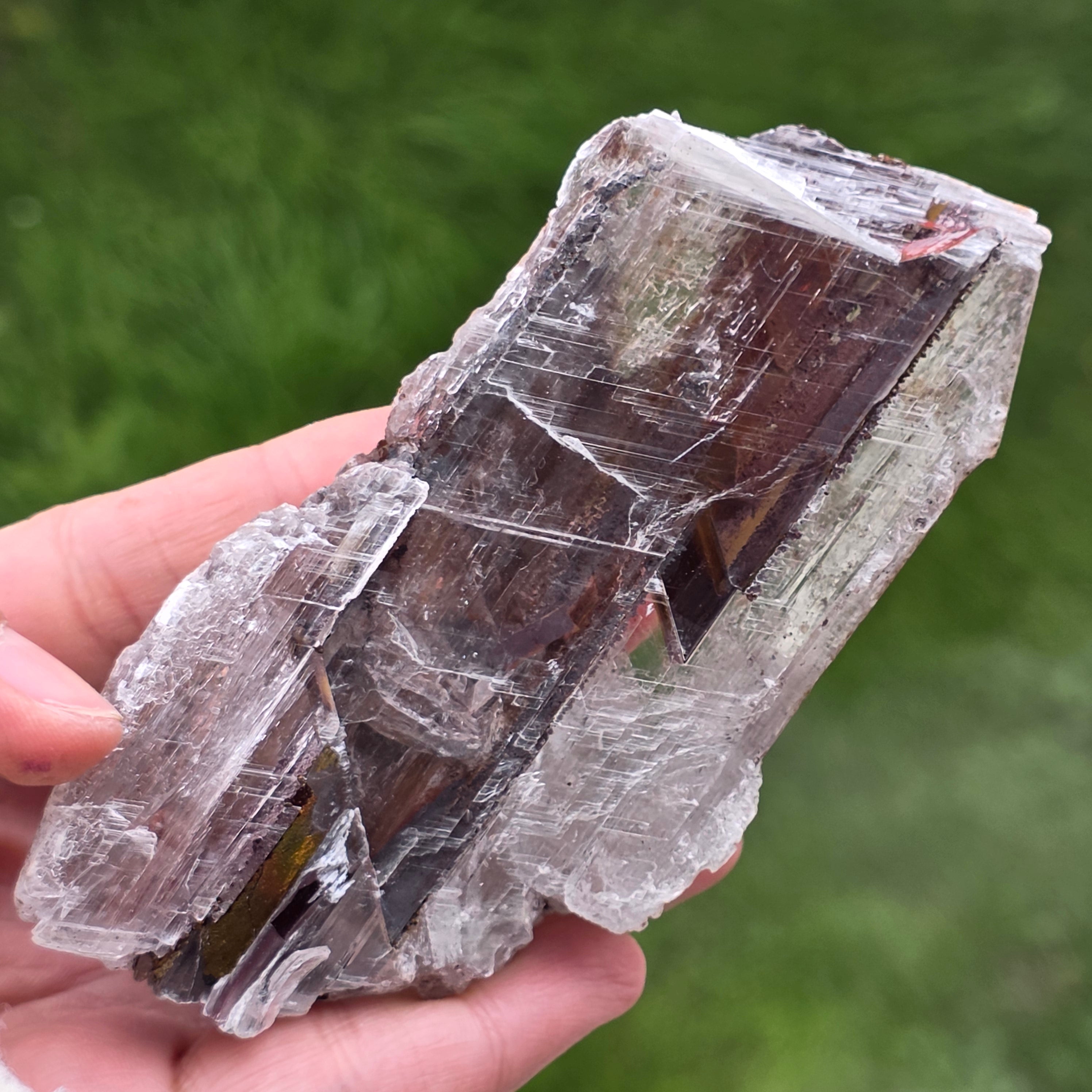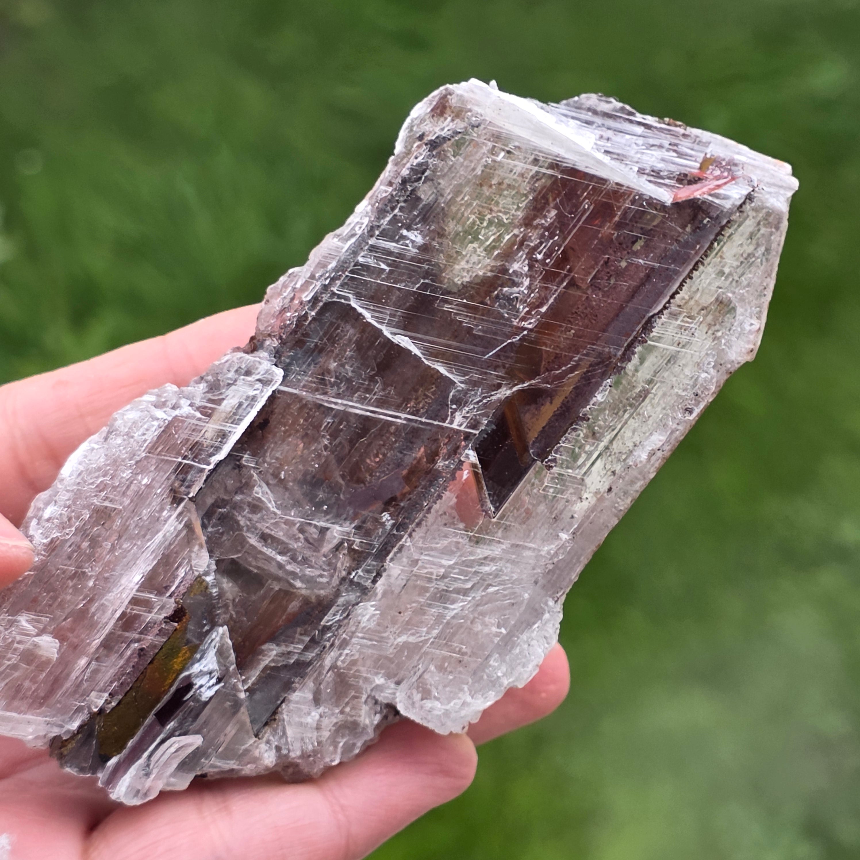 Acest specimen de selenit cu hematit din Mexic este o piesă mineralogică autentică, apreciată pentru contrastul natural dintre transparența lăptoasă a selenitului și nuanțele metalice, brun-roșiatice ale hematitului. Asocierea dintre aceste două minerale creează un aspect vizual puternic.