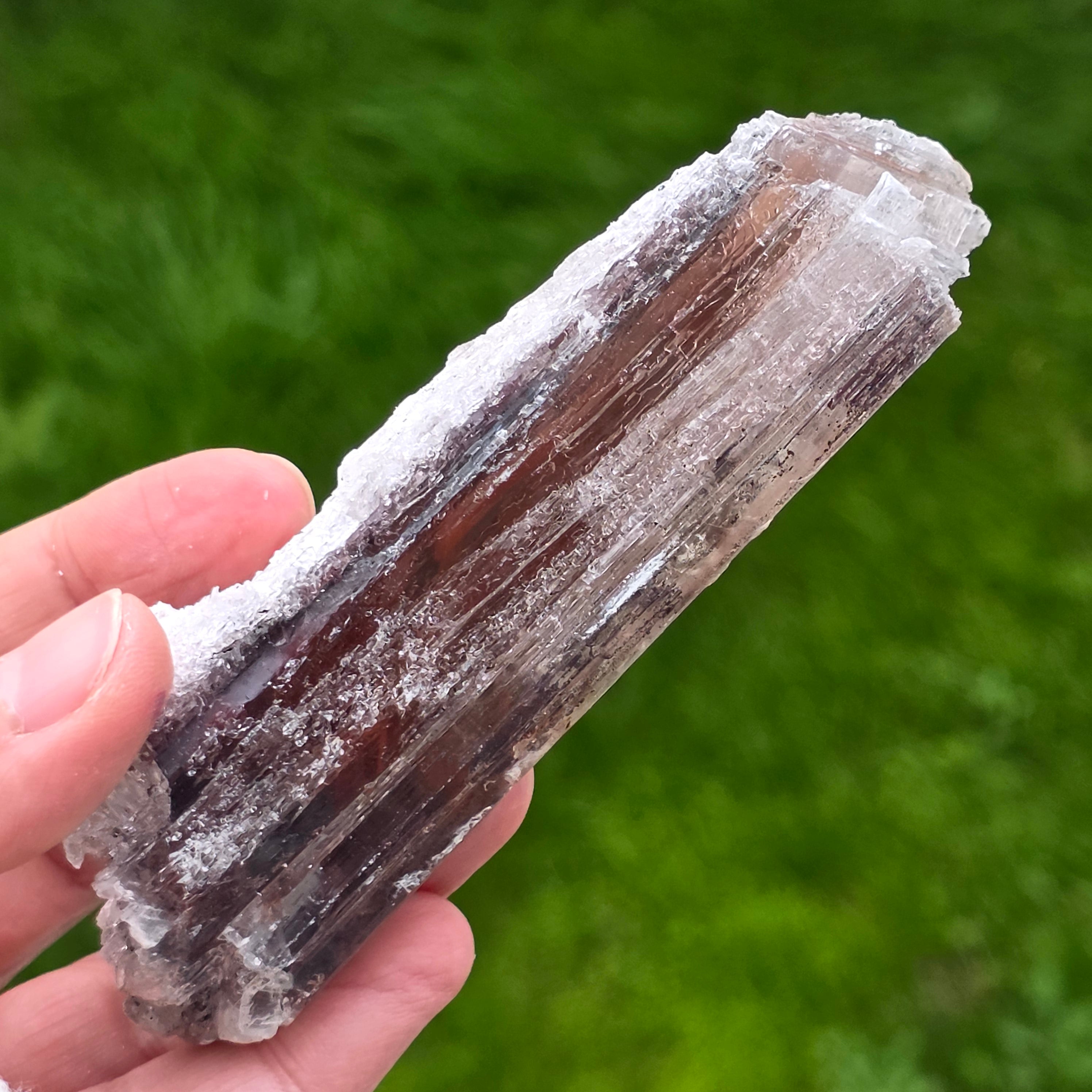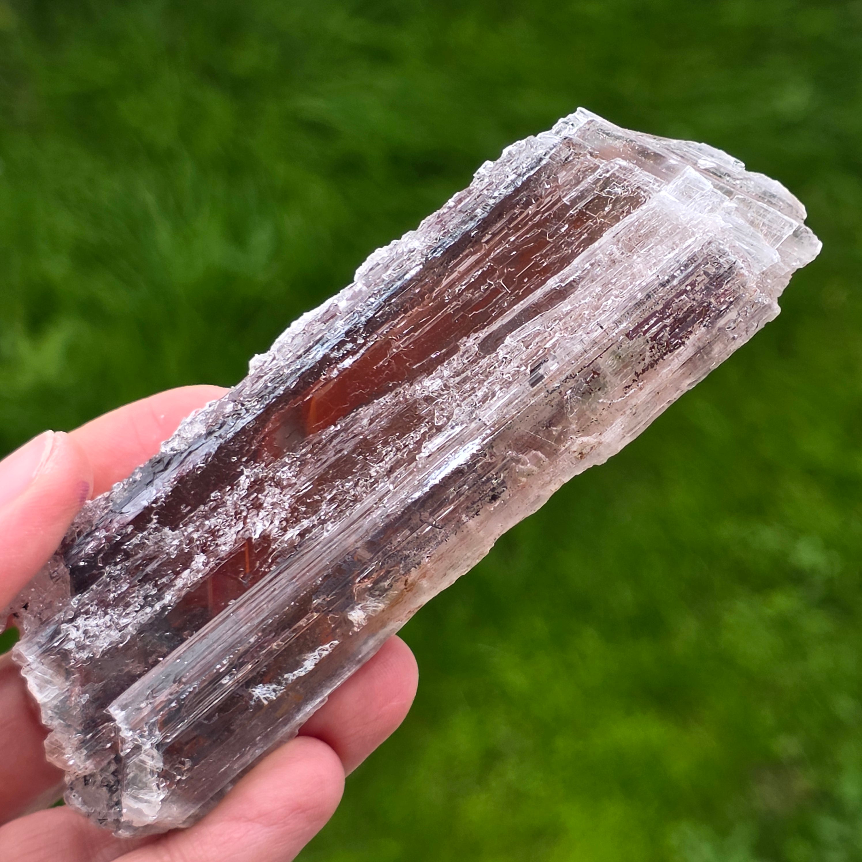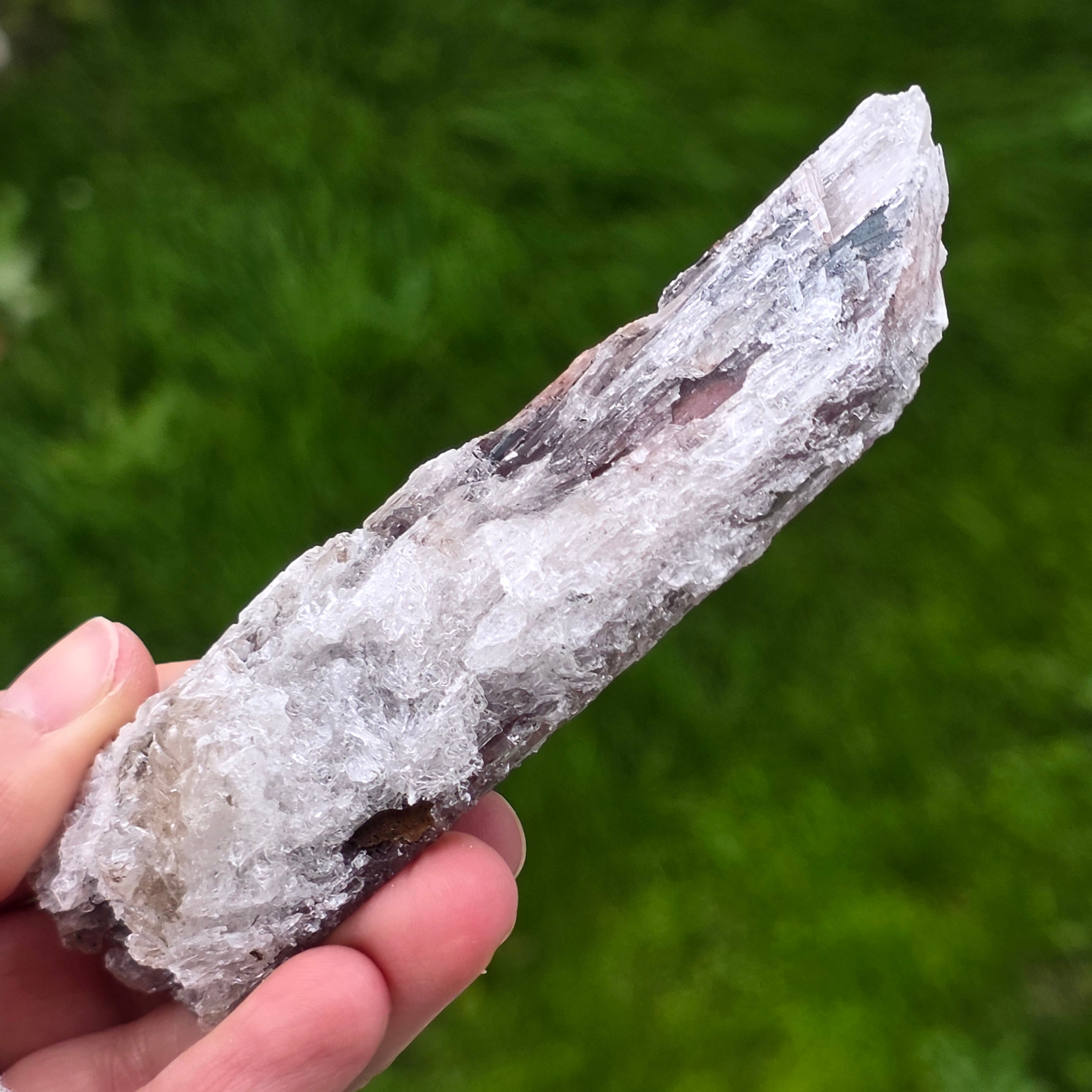 Selenitul apare sub formă de cristale alungite sau plăci translucide, cu luciu mătăsos și textură fină, în timp ce hematitul este prezent sub formă de incluziuni, pelicule sau depuneri naturale, care accentuează structura cristalului și îi conferă profunzime vizuală.