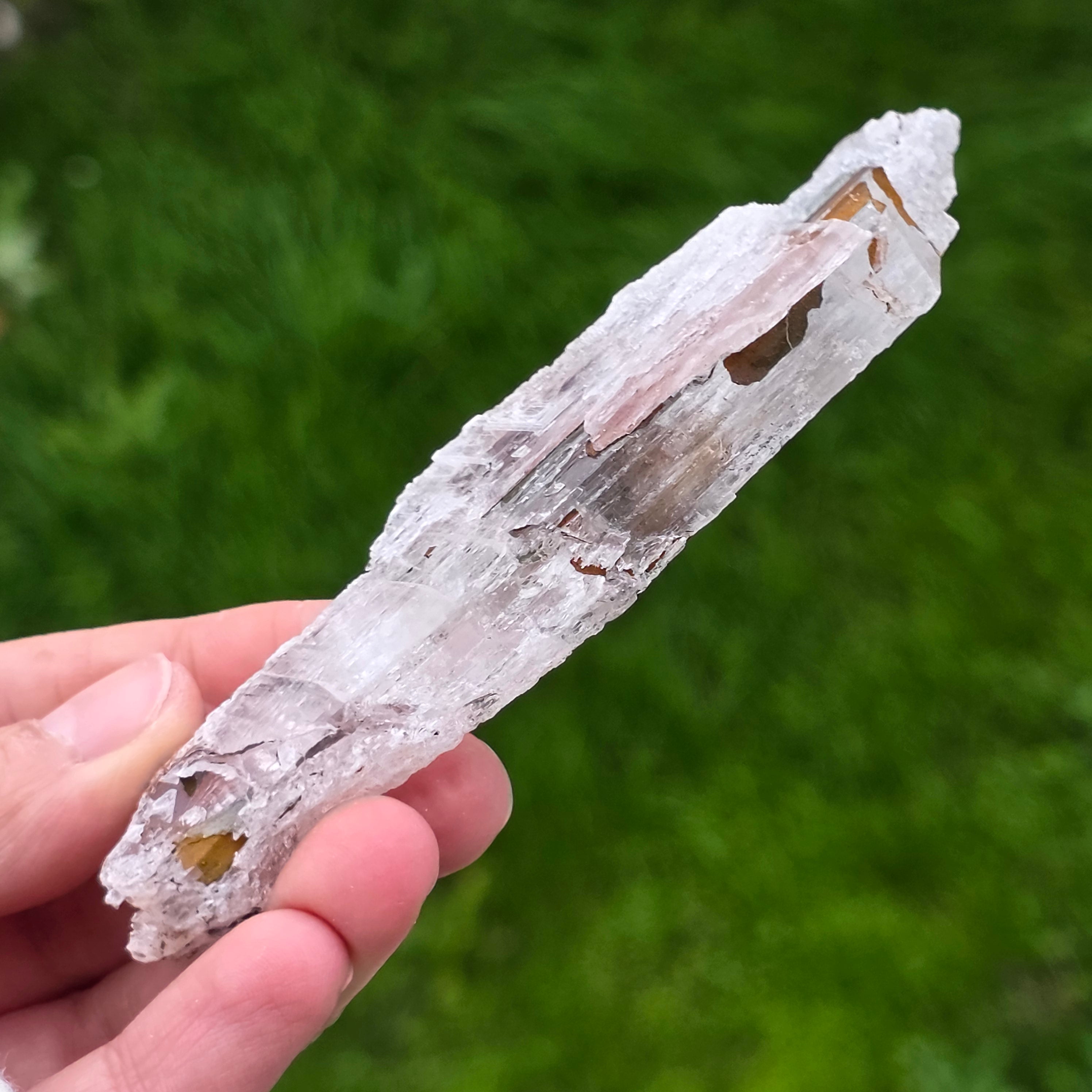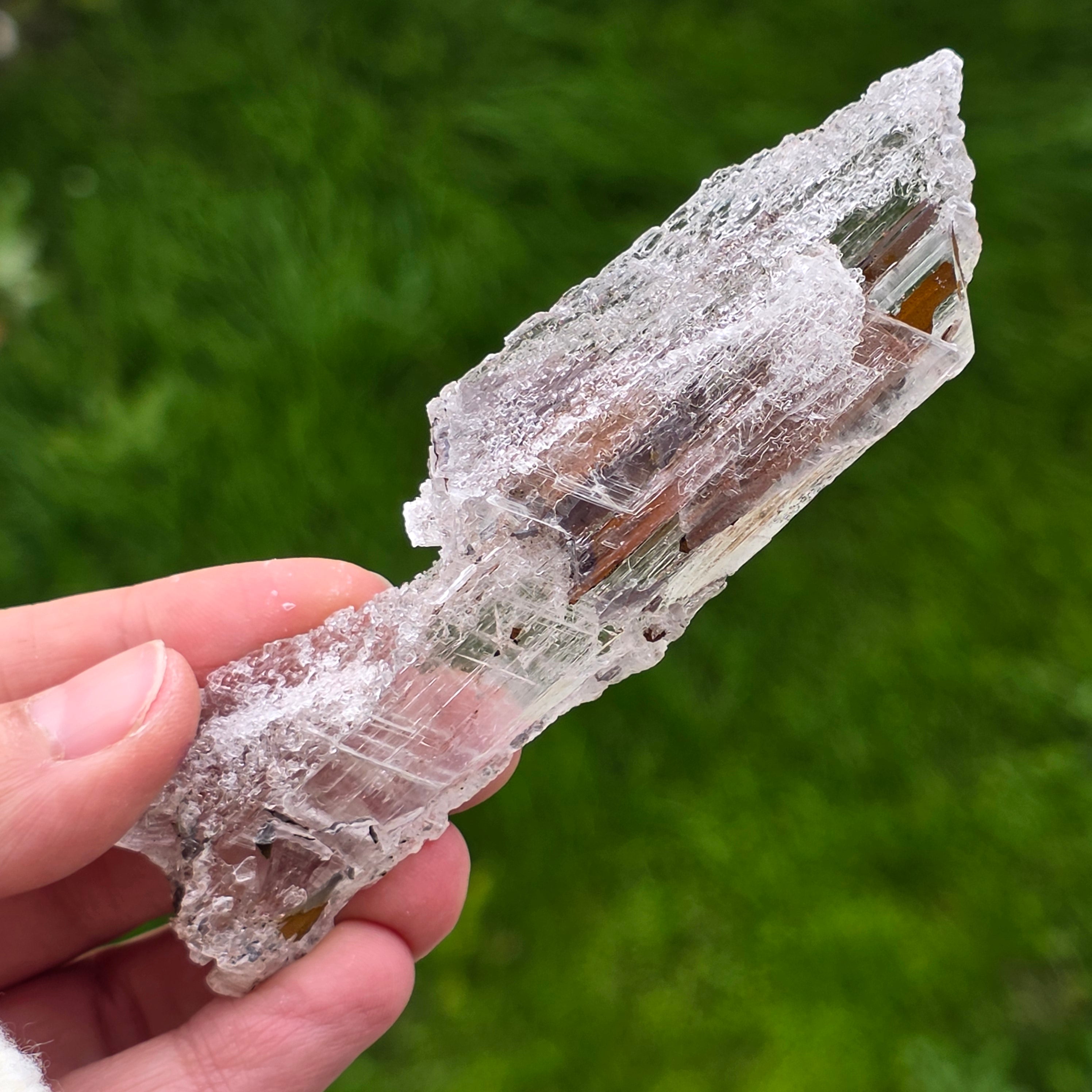 Selenitul apare sub formă de cristale alungite sau plăci translucide, cu luciu mătăsos și textură fină, în timp ce hematitul este prezent sub formă de incluziuni, pelicule sau depuneri naturale, care accentuează structura cristalului și îi conferă profunzime vizuală.