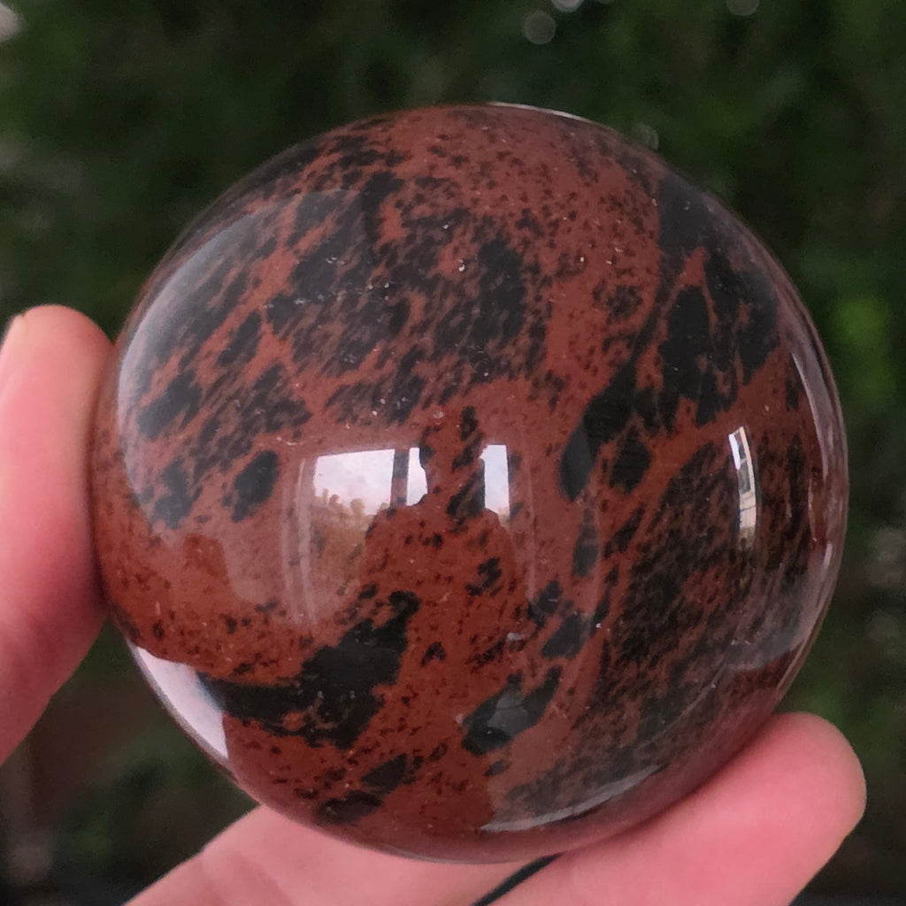 Această sferă din obsidian mahon este o întrupare a forței primordiale a Pământului — o piatră a rădăcinilor, a siguranței și a transformării interioare.